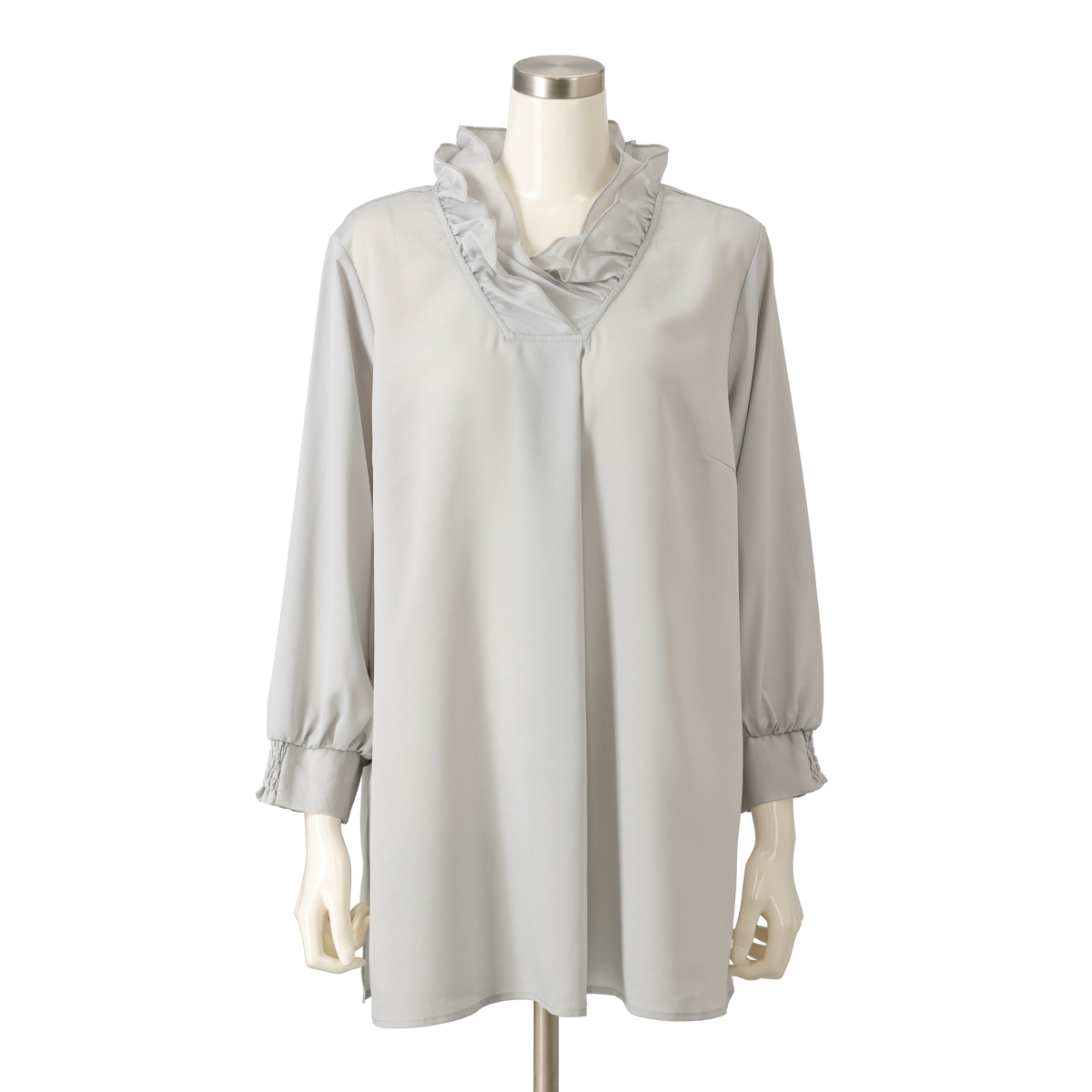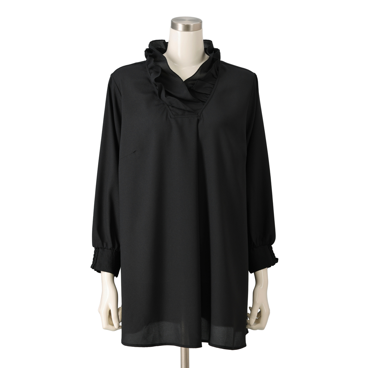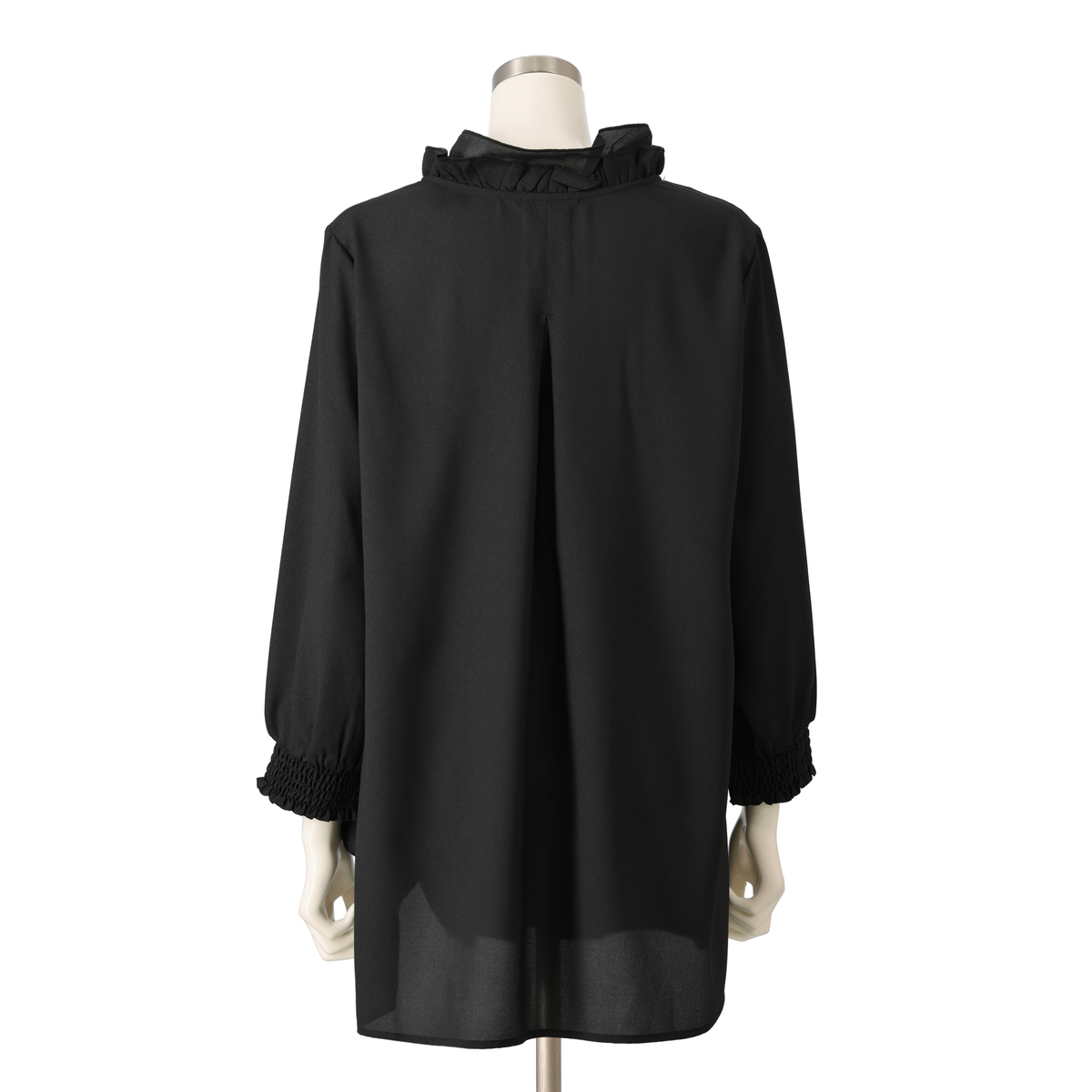 首に沿うフリルが上品なブラウス。太さの異なるフリルを重ねて叩きつけることで、襟元がすっきりと立ち上がるシルエットに仕上げています。柔らかなジョーゼット素材にはほどよい厚みがあり、袖の透けも控えめでフォーマルな印象に。透け感がございますので、インナーを合わせてのご着用となります