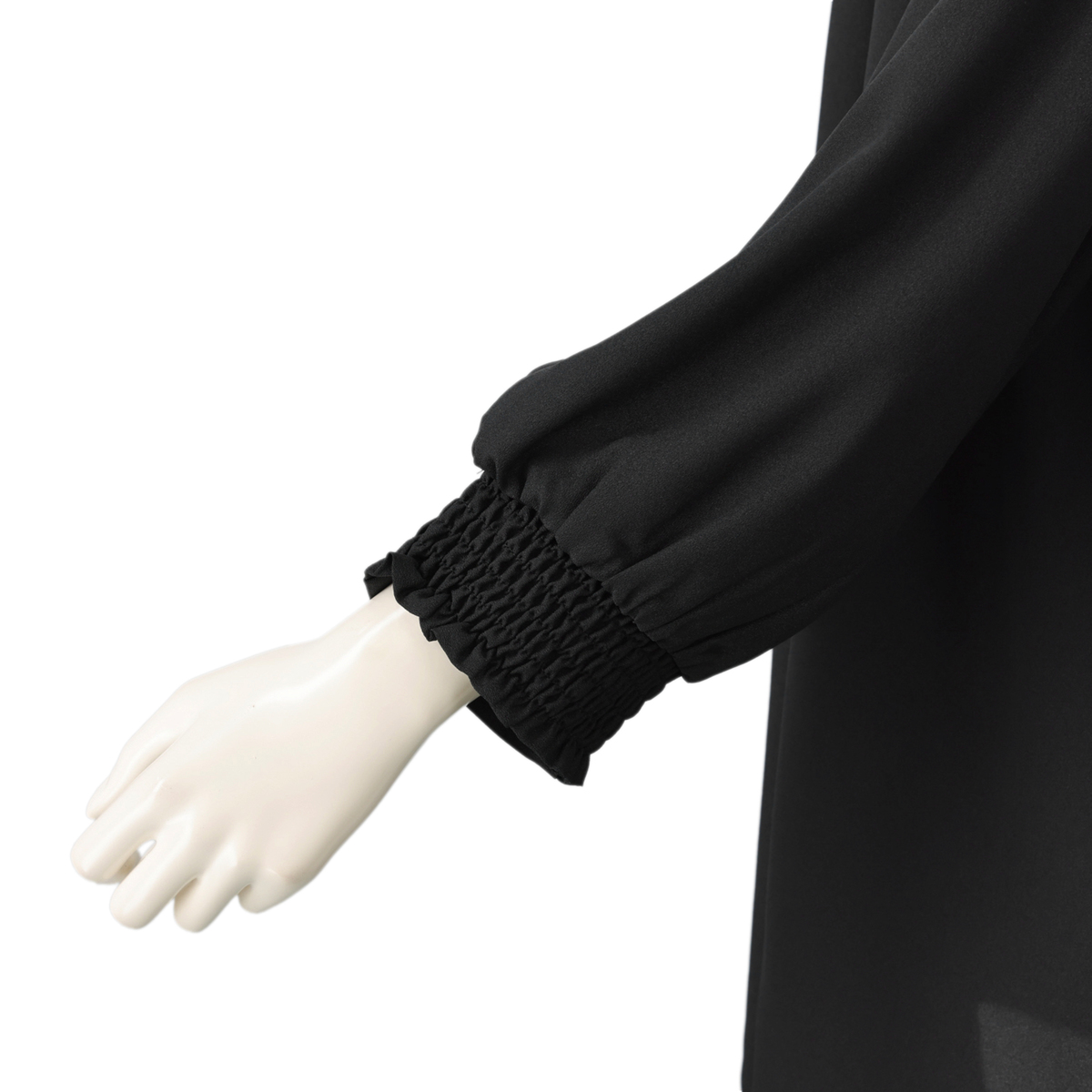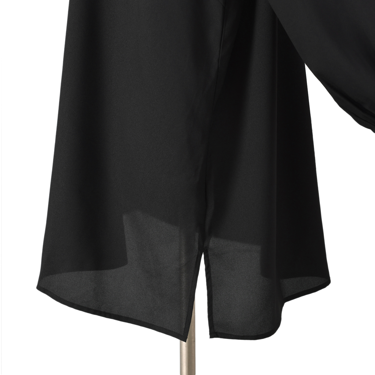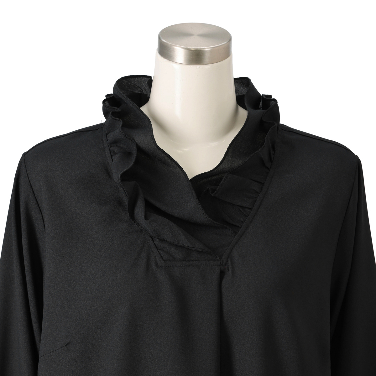 首に沿うフリルが上品なブラウス。太さの異なるフリルを重ねて叩きつけることで、襟元がすっきりと立ち上がるシルエットに仕上げています。柔らかなジョーゼット素材にはほどよい厚みがあり、袖の透けも控えめでフォーマルな印象に。透け感がございますので、インナーを合わせてのご着用となります