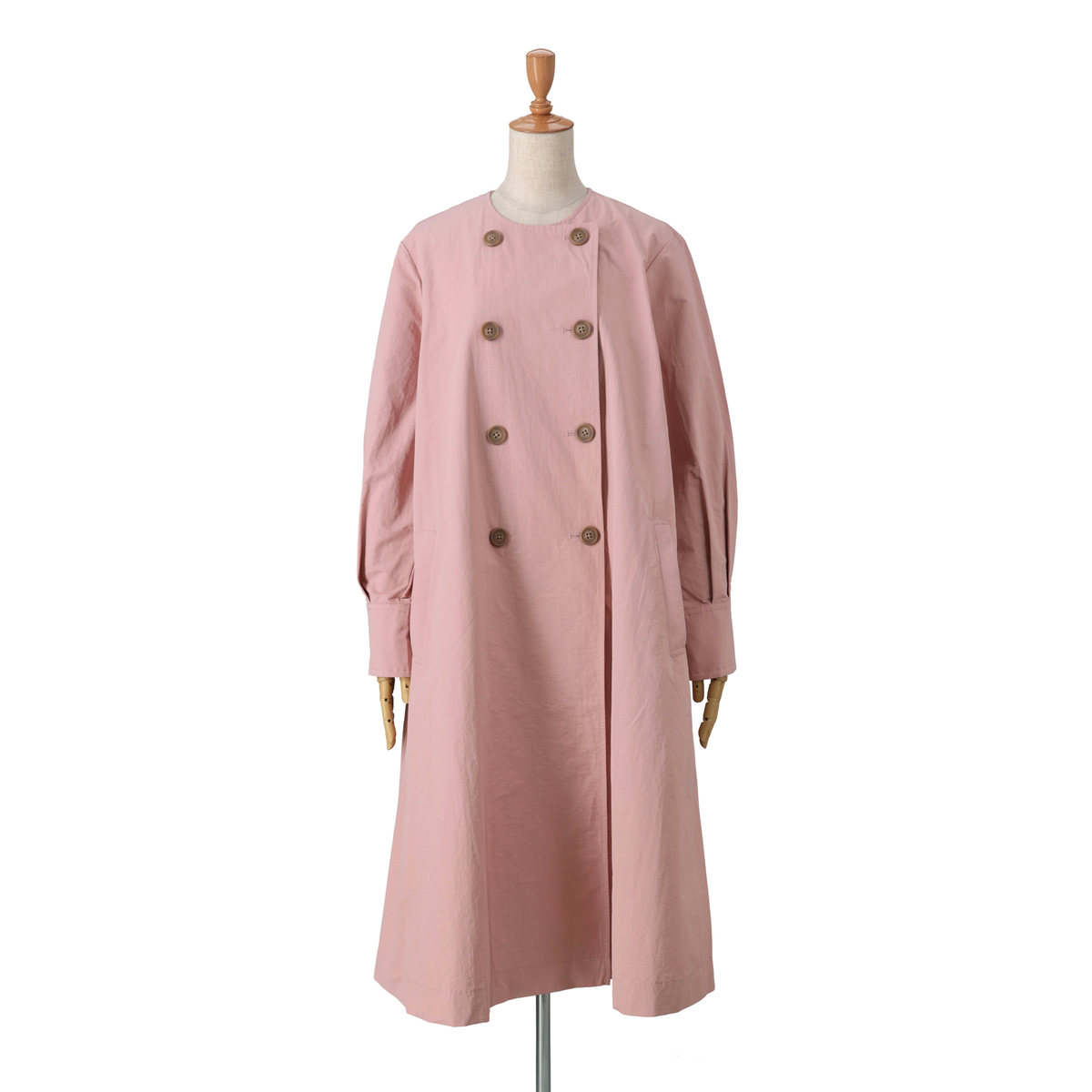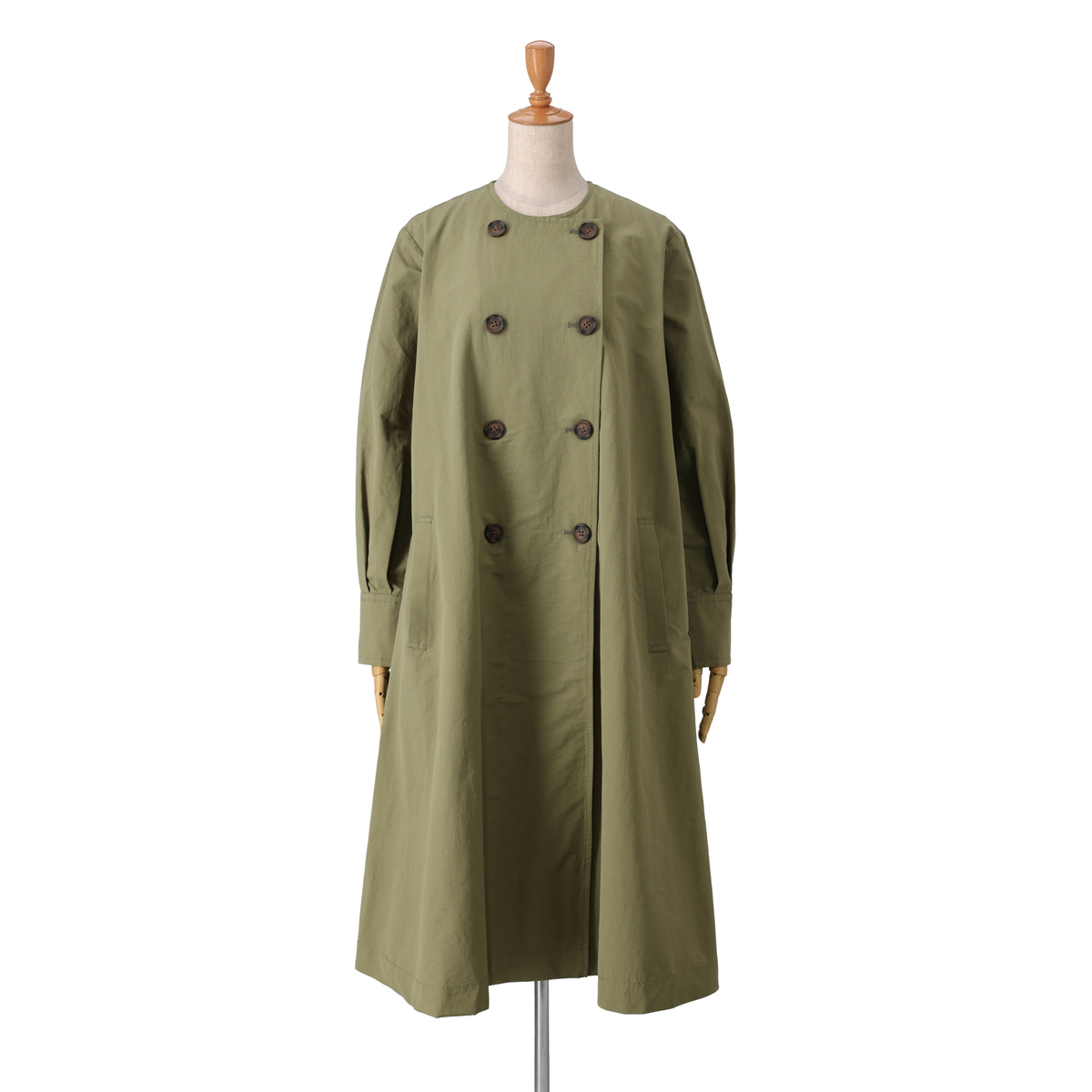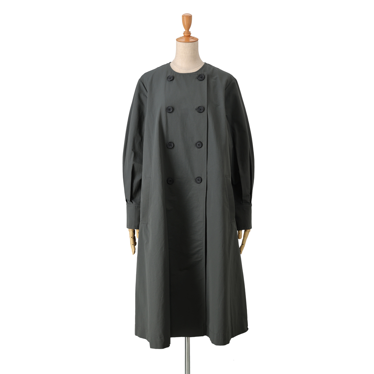 ドレスのように広がるAラインが魅力のコート。前身頃はダブルの打ち合わせで品格を添え、パフスリーブが立体感を演出。長めのカフスは折り返して表情を変えられ、後ろにはリボンとボタンを施して大人かわいいディテールを詰め込みました