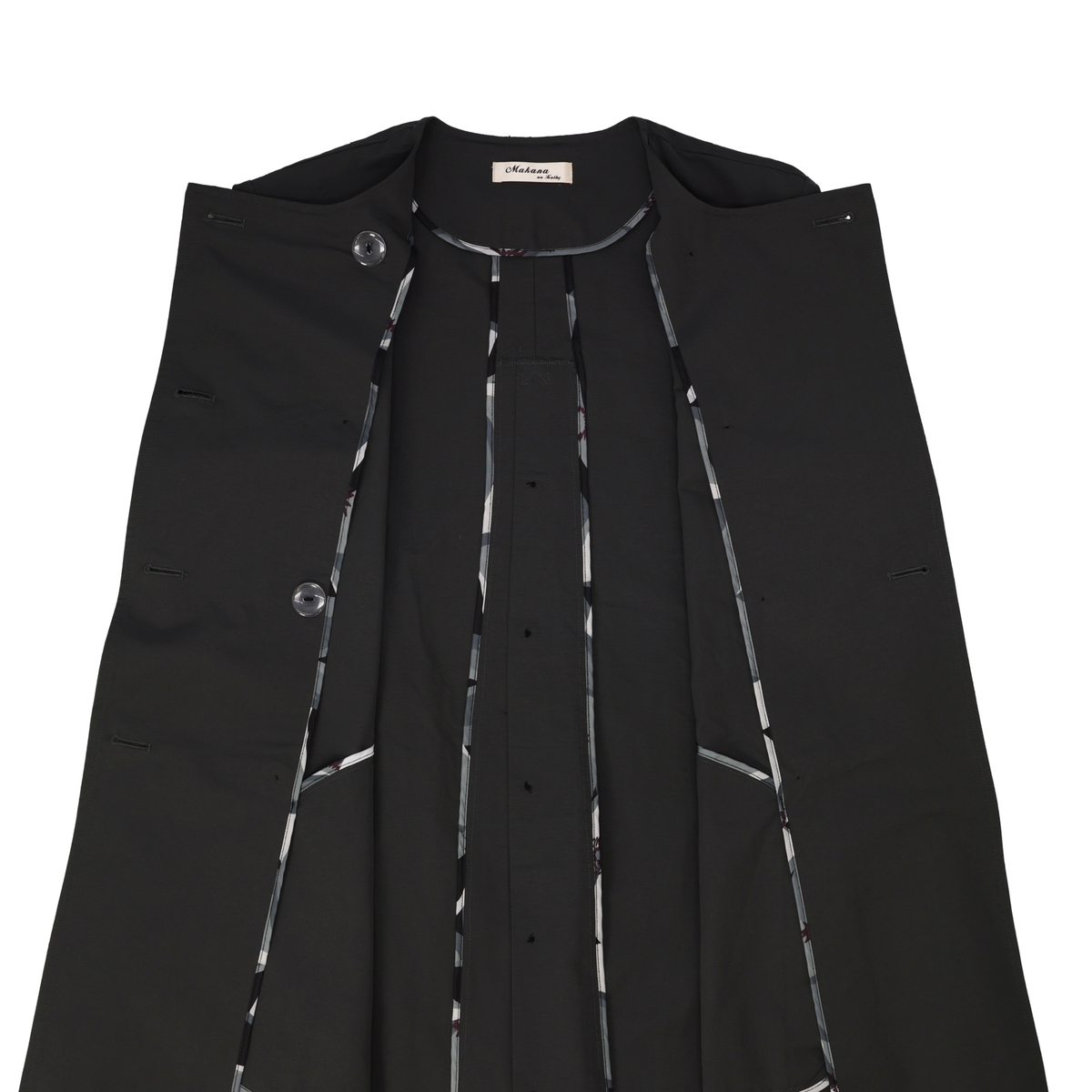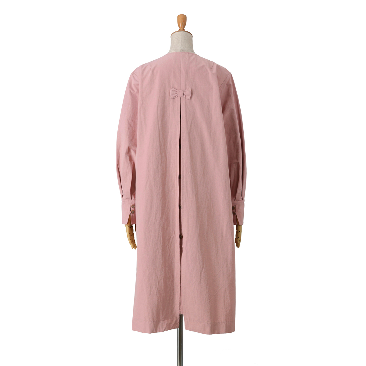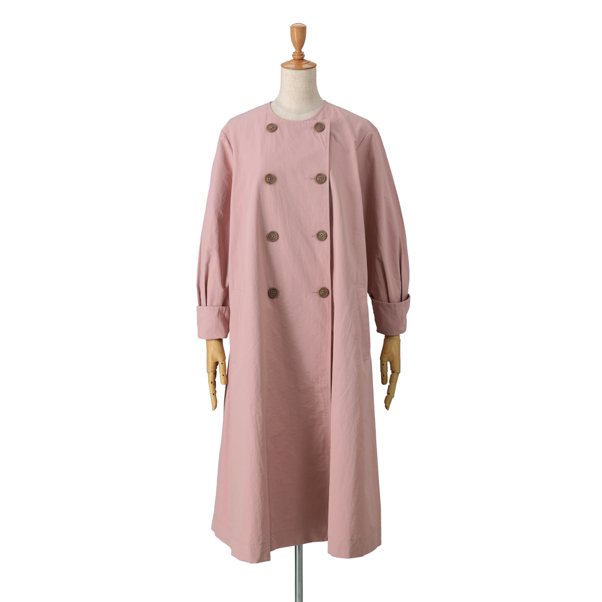 ドレスのように広がるAラインが魅力のコート。前身頃はダブルの打ち合わせで品格を添え、パフスリーブが立体感を演出。長めのカフスは折り返して表情を変えられ、後ろにはリボンとボタンを施して大人かわいいディテールを詰め込みました