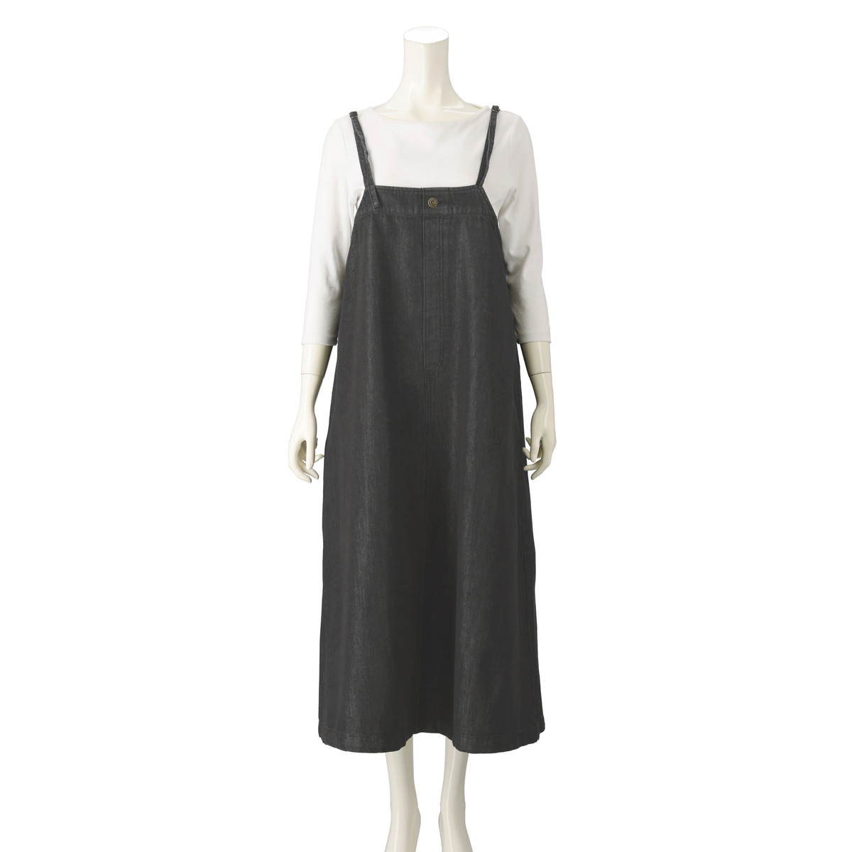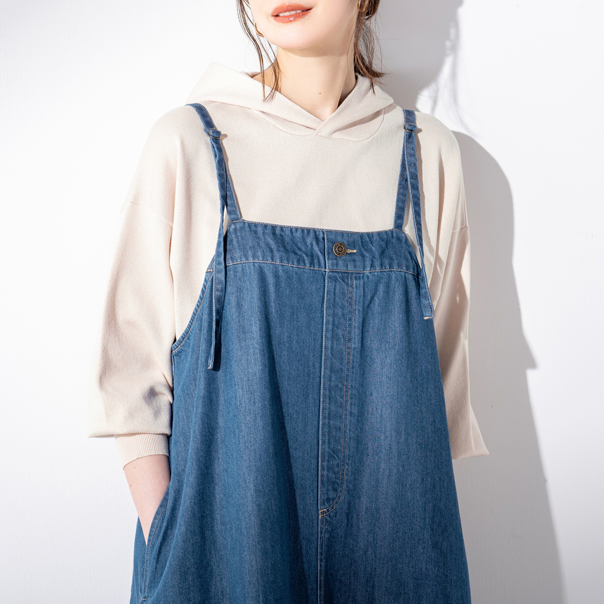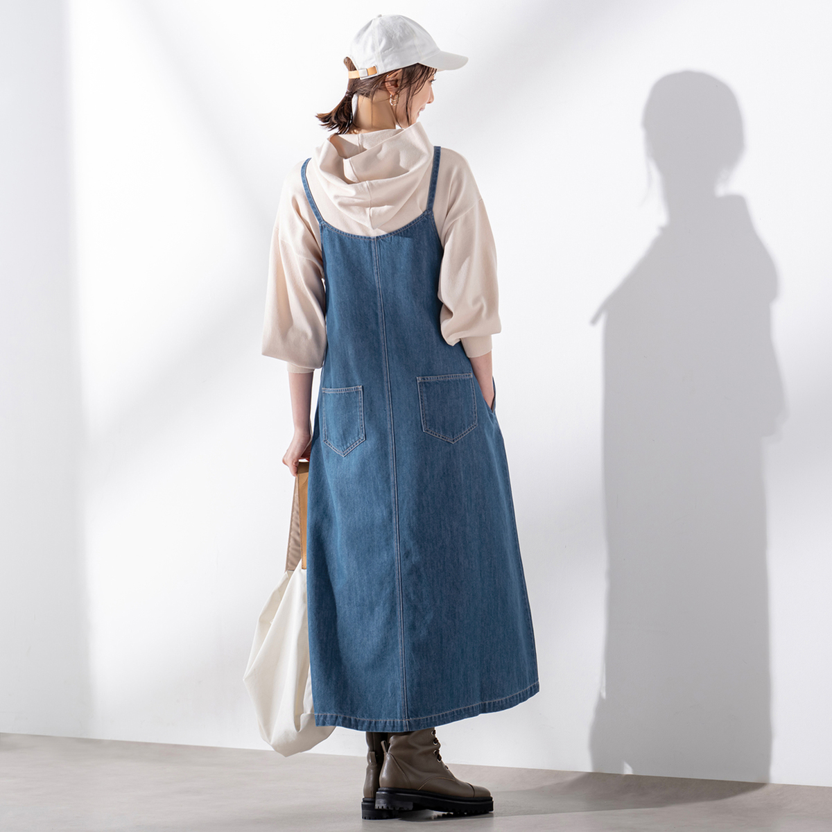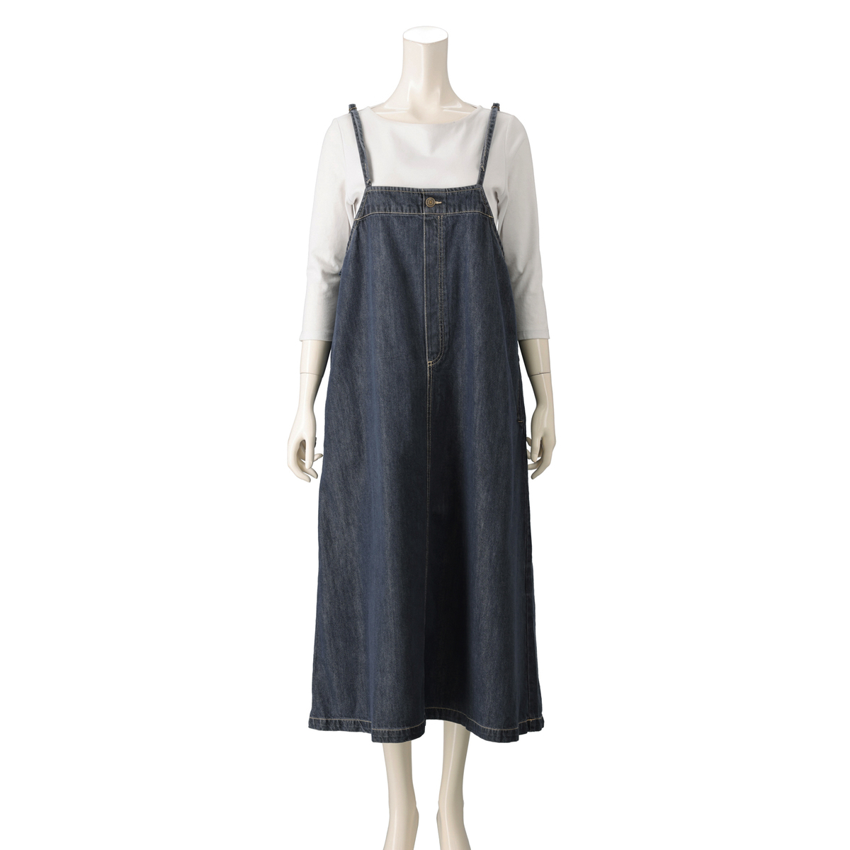 前中心にダミーの長いファスナー開きのようなデザインをあしらったデニムジャンパースカート。華奢見えする細い肩紐で、着丈の調整も可能です。両脇には便利なポケット付きです