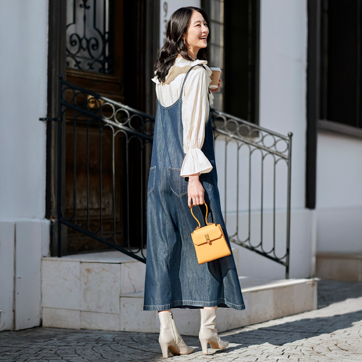 前中心にダミーの長いファスナー開きのようなデザインをあしらったデニムジャンパースカート。華奢見えする細い肩紐で、着丈の調整も可能です。両脇には便利なポケット付きです