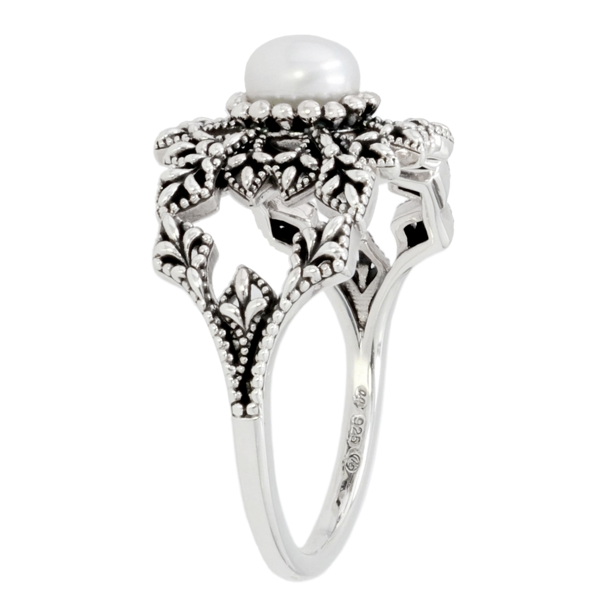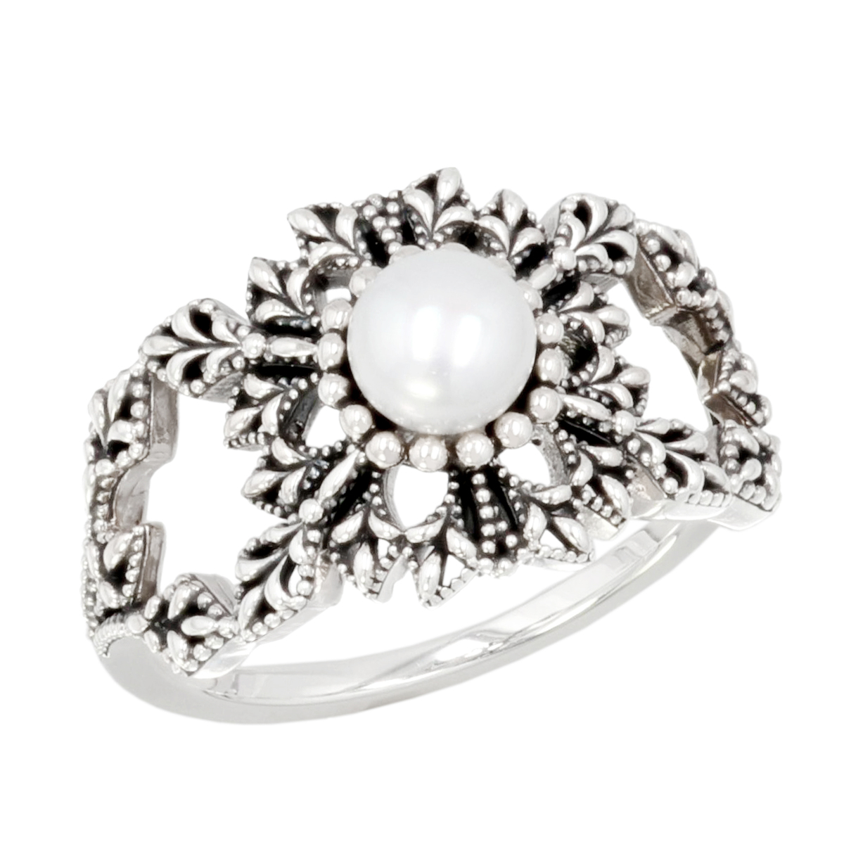 淡水パールをあしらった雪の結晶モチーフリング。雪の白いカラーをパールで表現し、シルバー925を使用した自然の美しさを感じるデザインで、指先を上品に彩ります