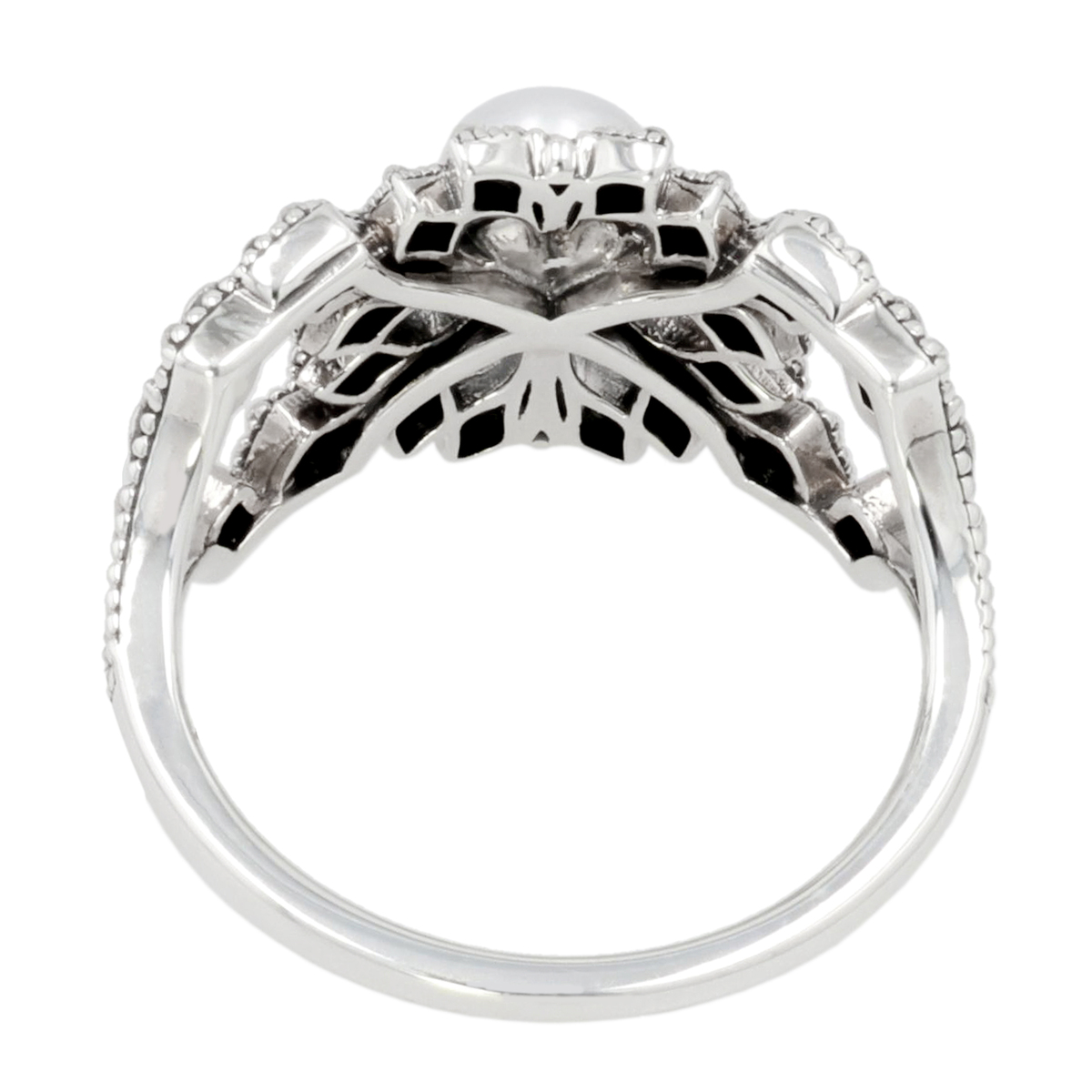 ヨーロッパの伝統的なアンティークジュエリー技法を取り入れ、玉飾りやミル打ちを細部まで丁寧に施したこだわりの仕上げ。雪の柔らかさを思わせる繊細な造形が魅力で、指先に可憐で上品な雰囲気を添えます