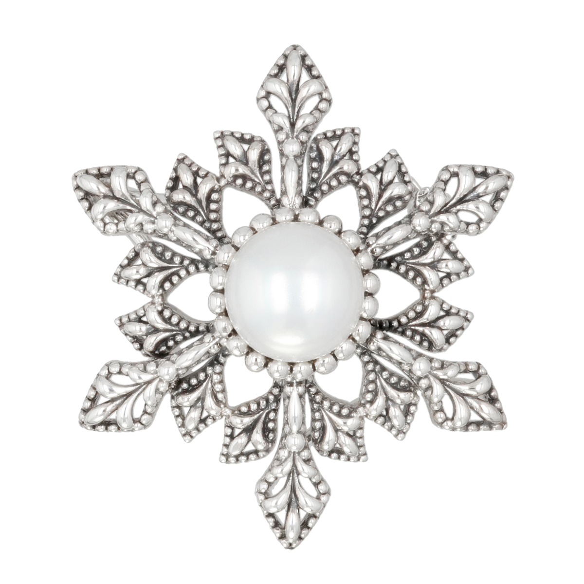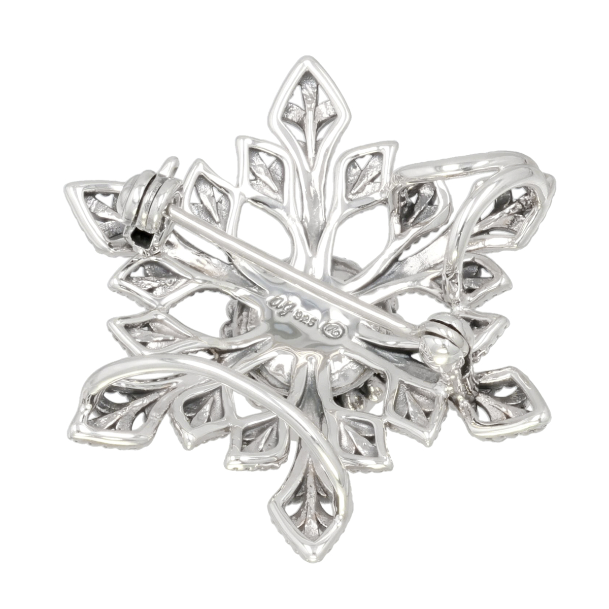 雪の結晶をモチーフにしたブローチ。センターに輝く淡水パールが胸元を上品に彩り、自然が生み出す気品ある美しさを楽しめます