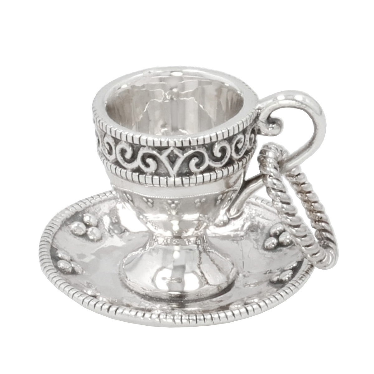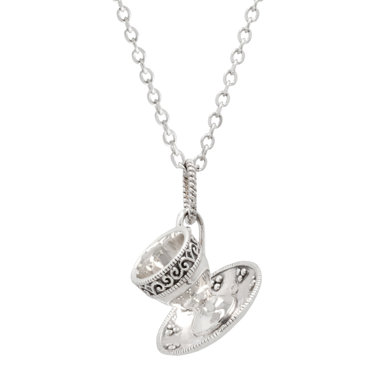 小さなティーカップをモチーフにしたペンダント。繊細な細工を施したシルバーの輝きが胸元を華やかに彩ります