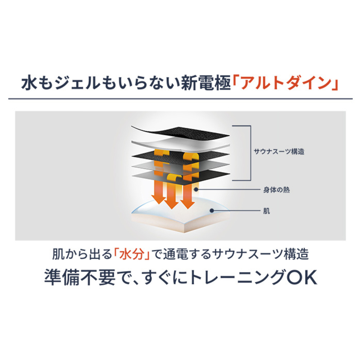 ジェルシートや、使用前の水の吹きかけが不要*。肌表面の水分で通電する、サウナスーツ構造の電極アルトダインを採用しています