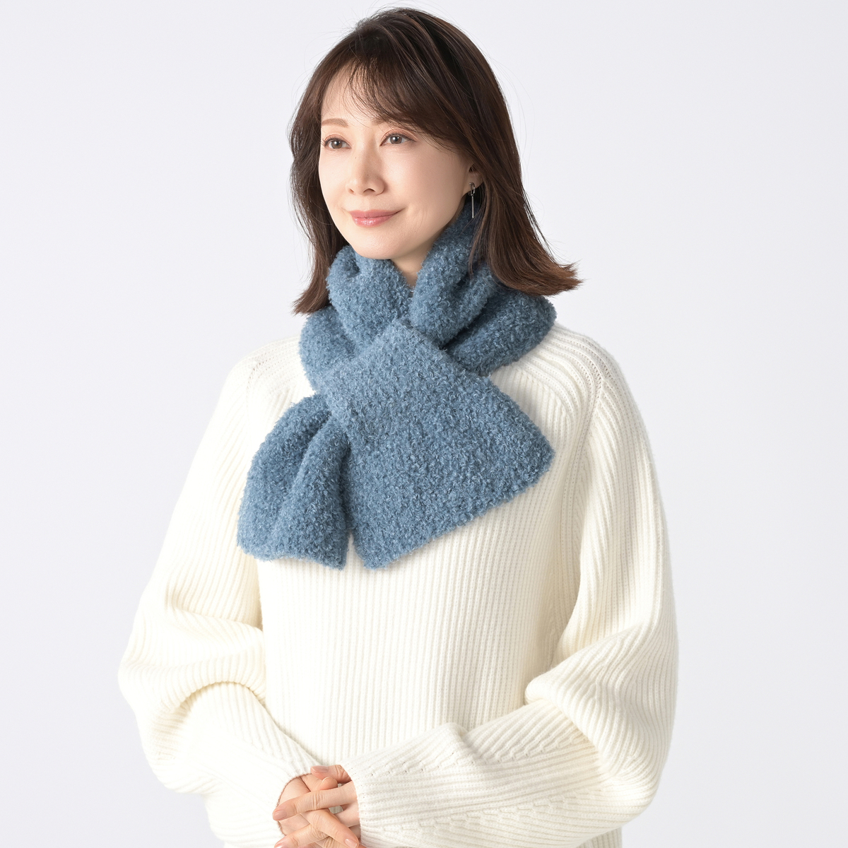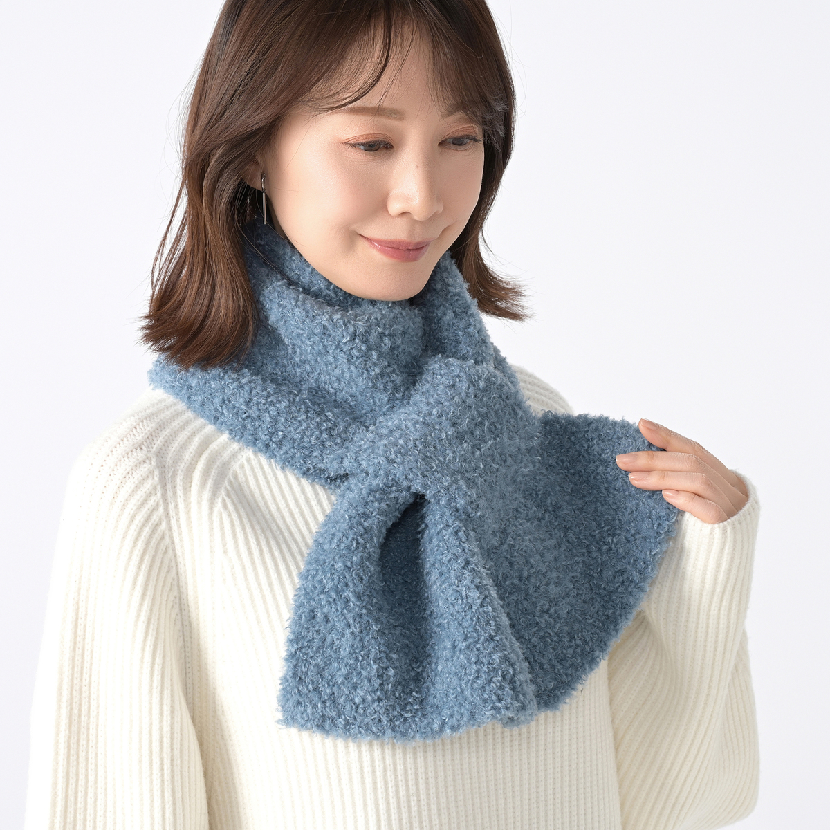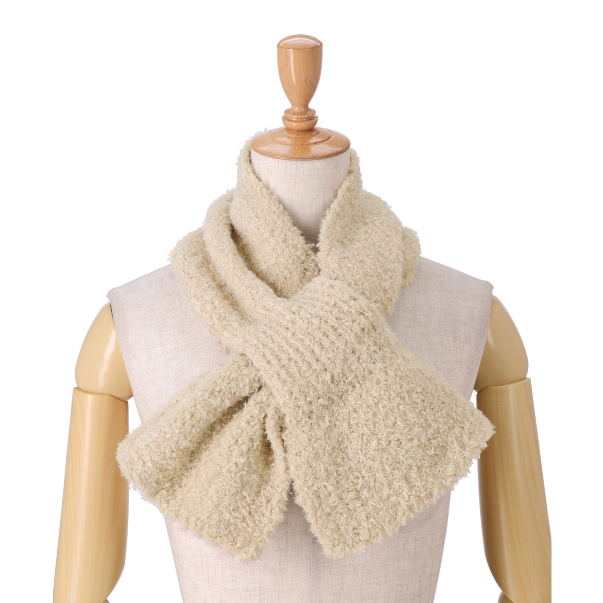 伸縮性のあるニットのマフラー。差し込む仕様で簡単に着脱できます