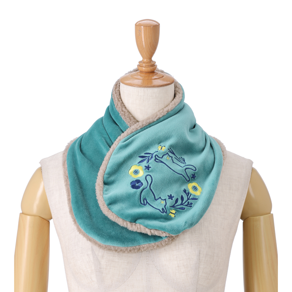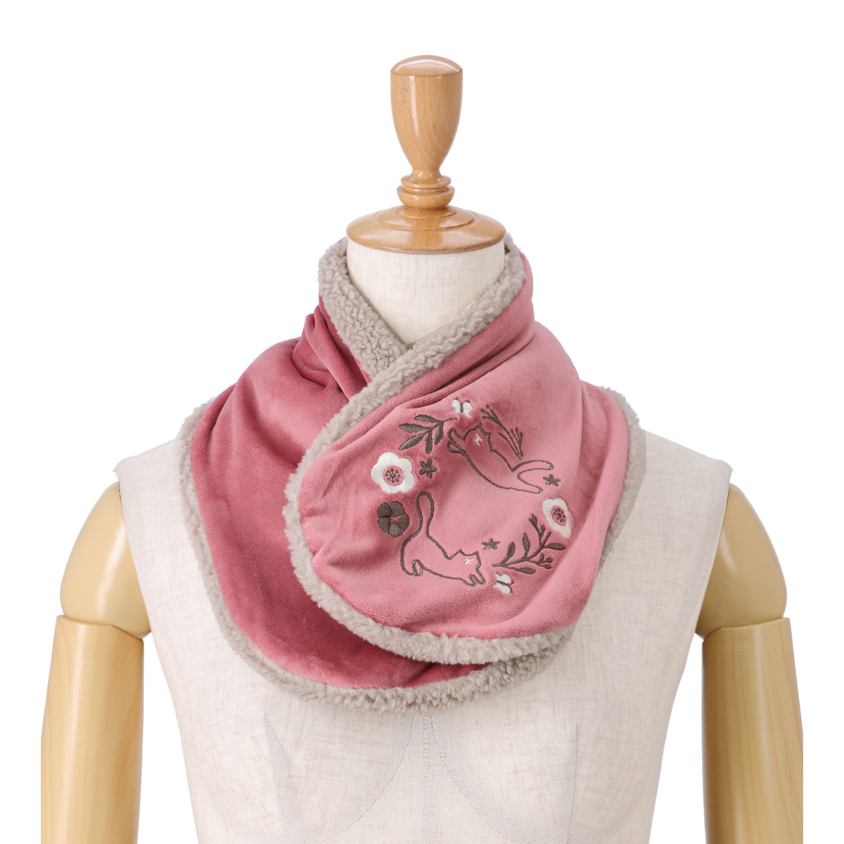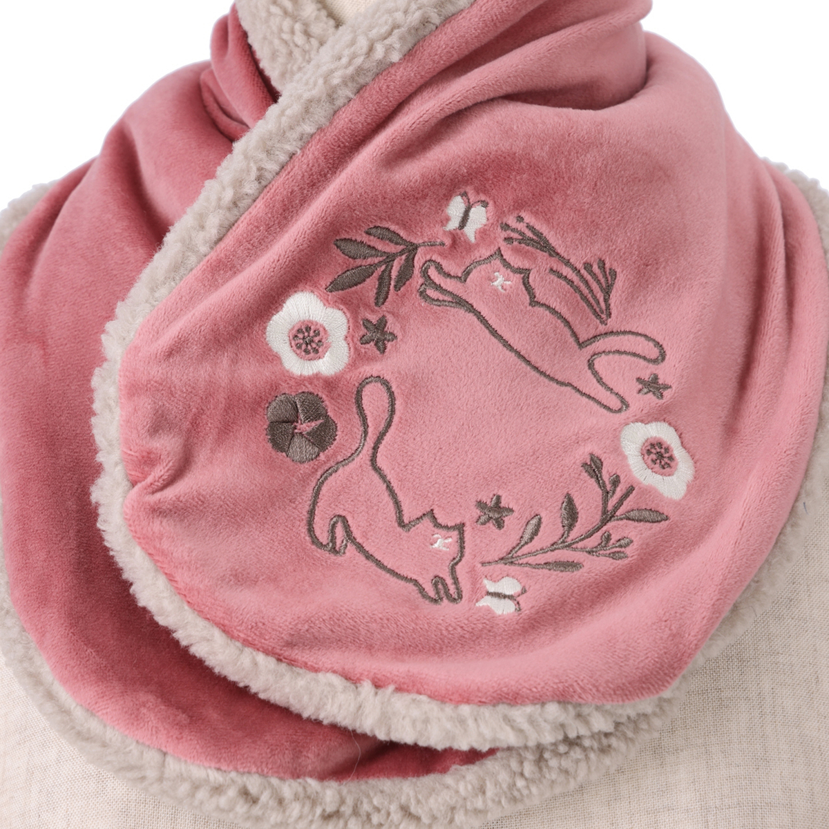 ねことお花の刺繍がかわいいティペット。裏側はボア生地で暖かな着け心地です