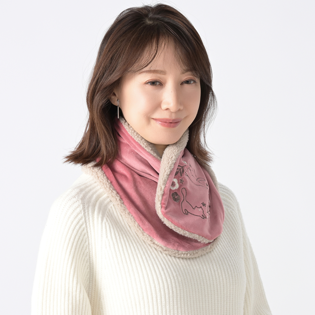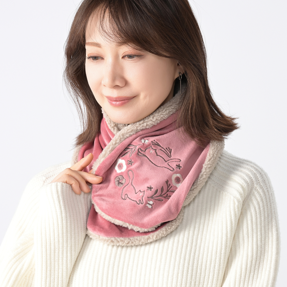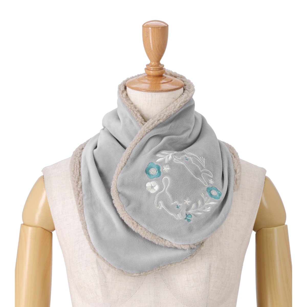 ねことお花の刺繍がかわいいティペット。裏側はボア生地で暖かな着け心地です
