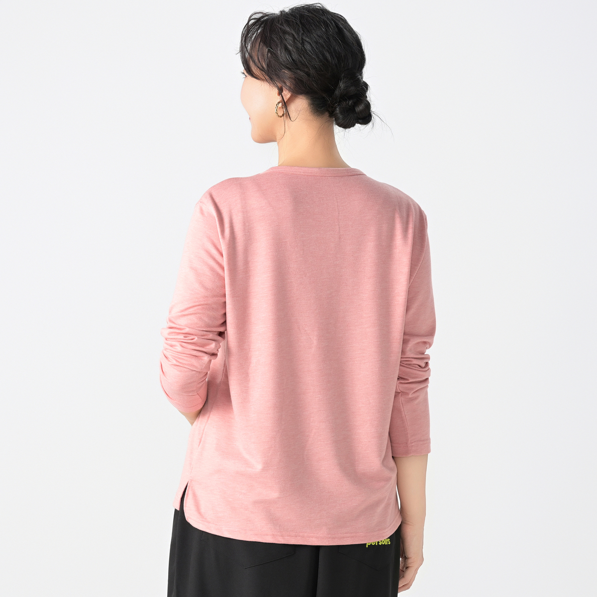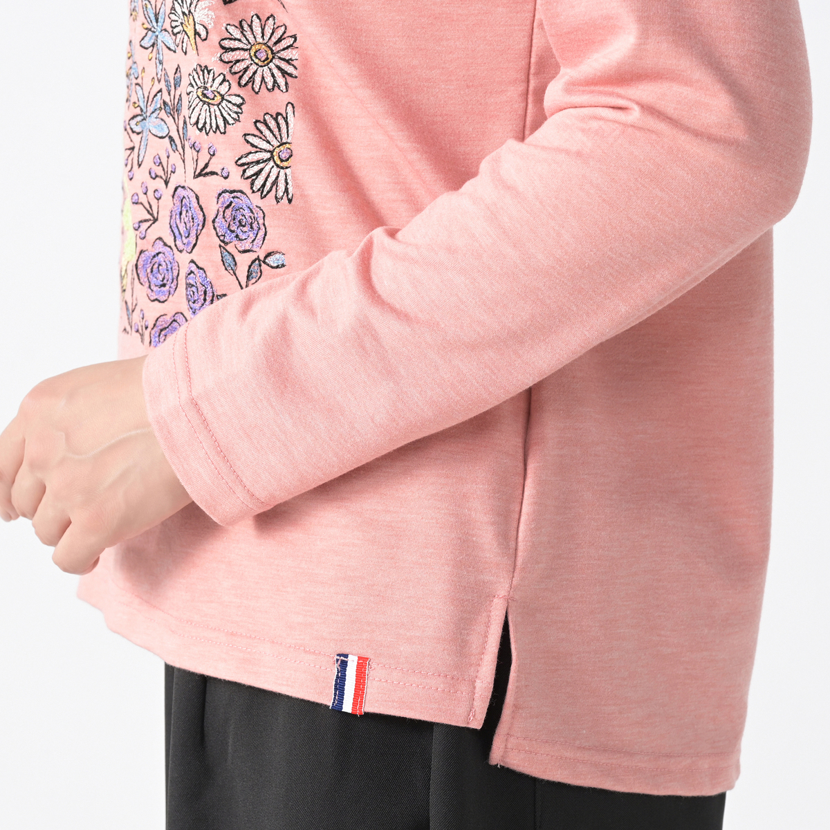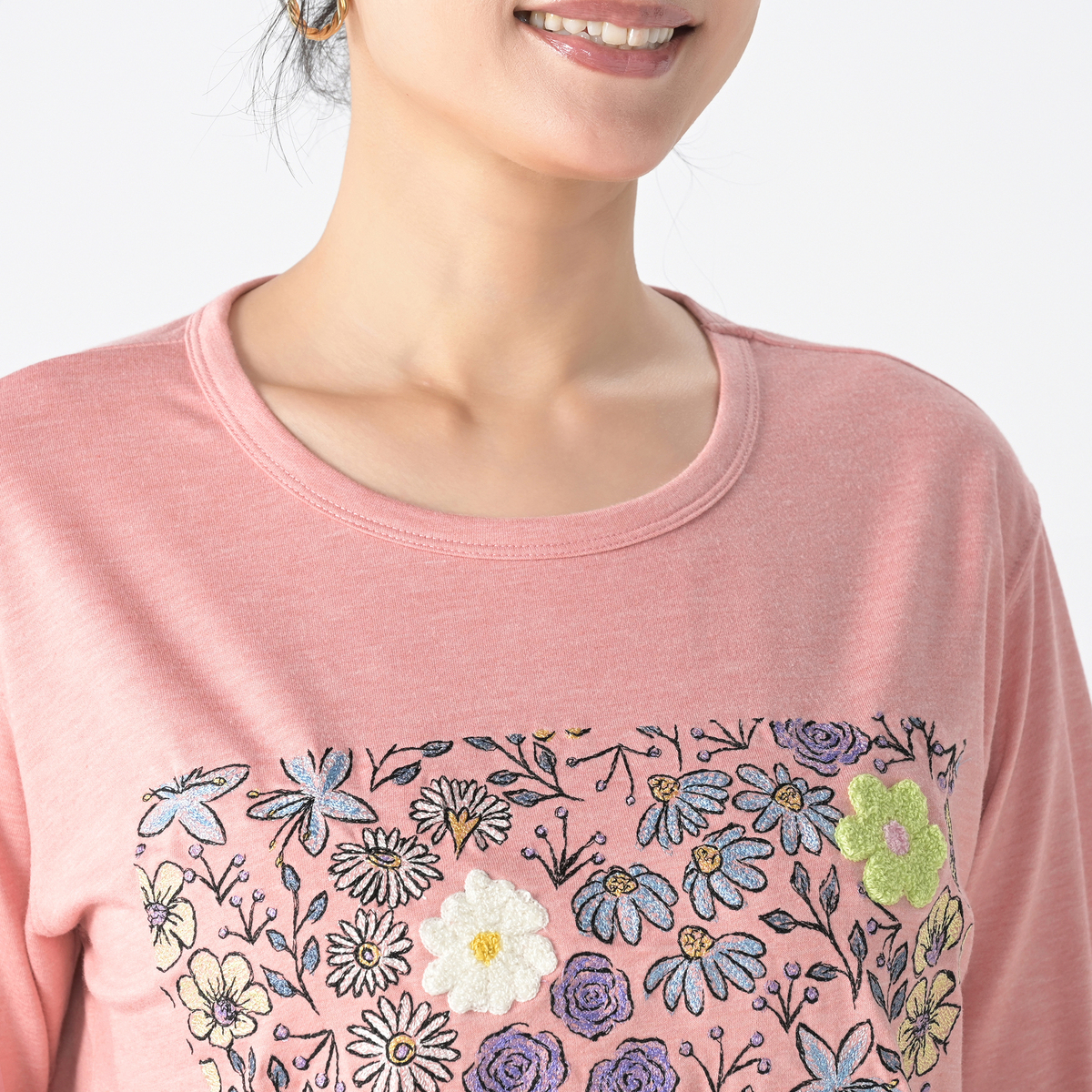 柔らかなカットソー素材を使い、胸元に繊細な花柄刺繍をあしらった長袖Tシャツです。ほどよい厚みで一枚でも重ねても着やすく、華やかな雰囲気を日常にプラスします