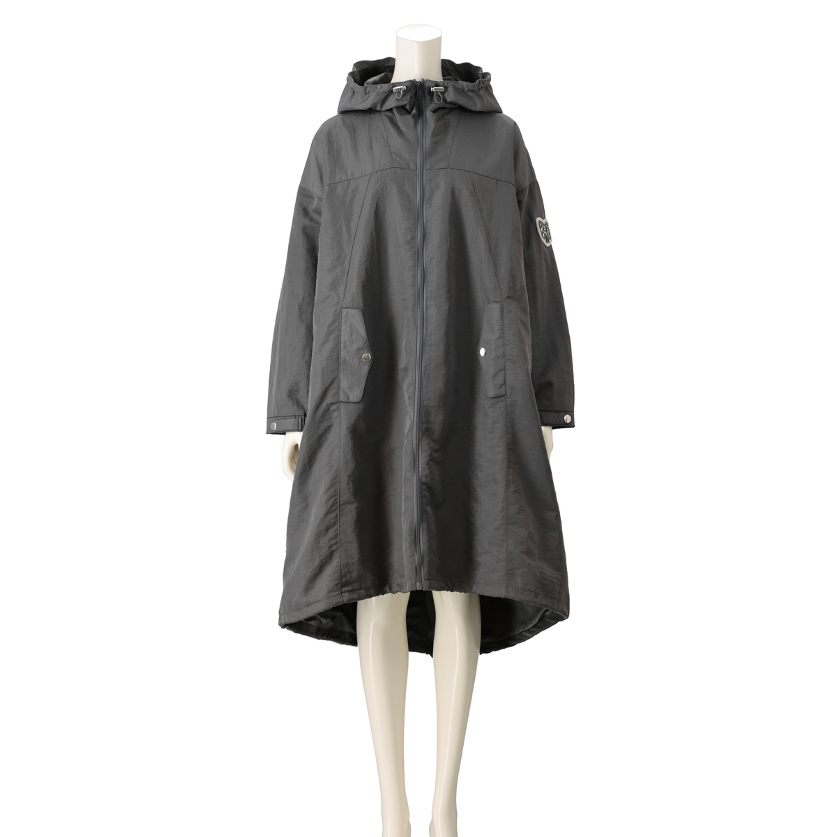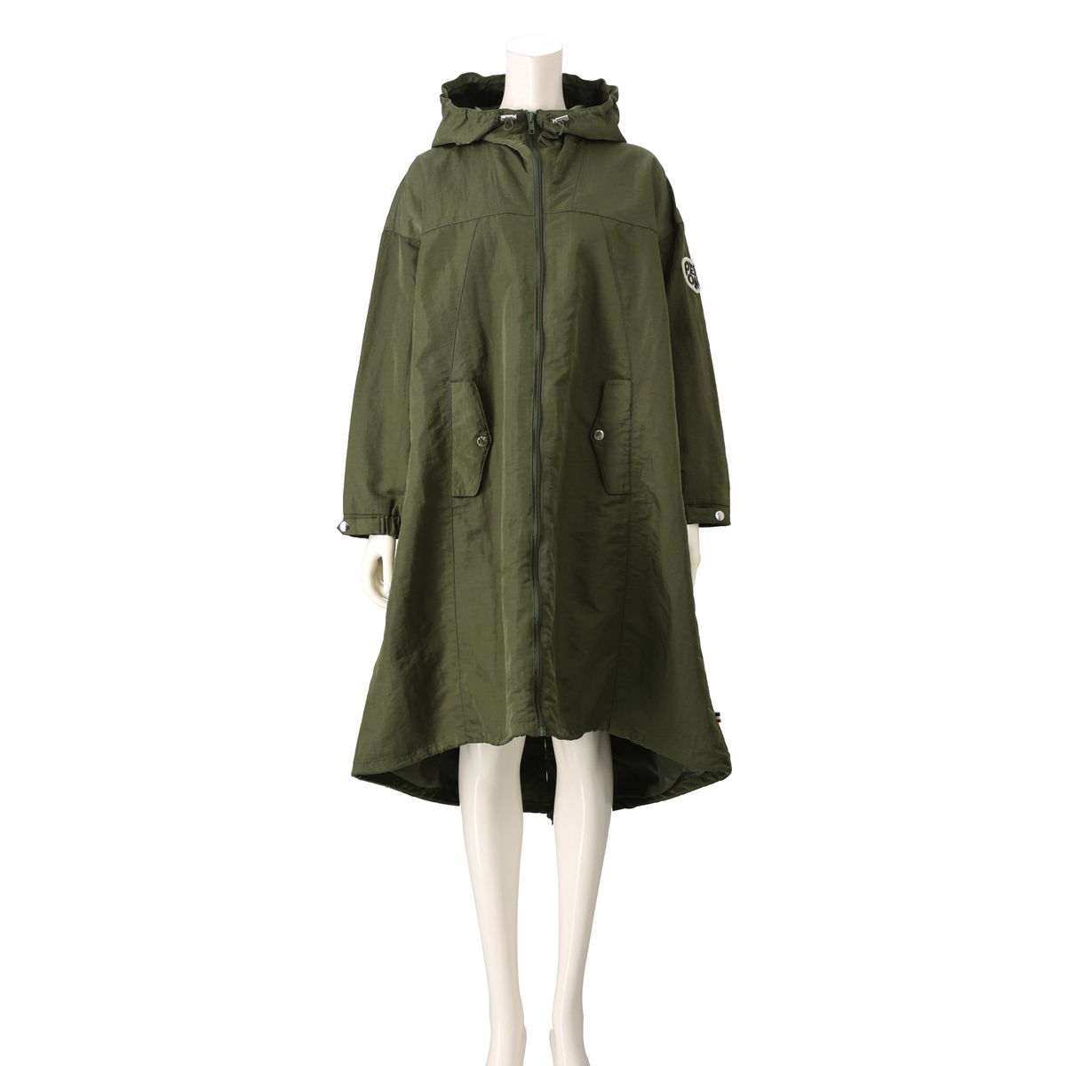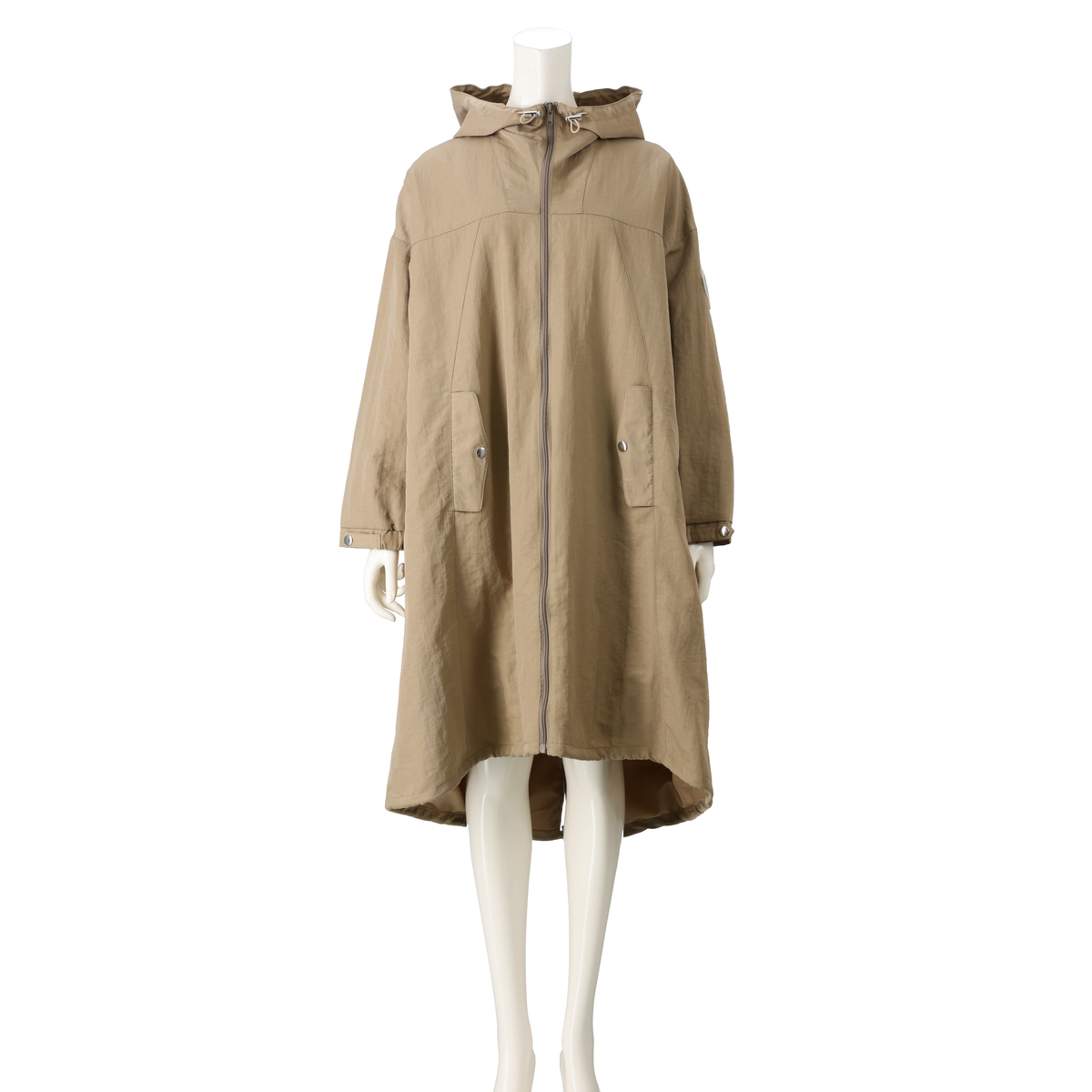 フード付きフレアーシルエットのロングコートです。程よい厚みのナイロン素材に裏地付きで、気温の変化が気になる季節にも重宝。ゆとりある作りで厚手のトップスも重ねやすく、デイリーに活躍します