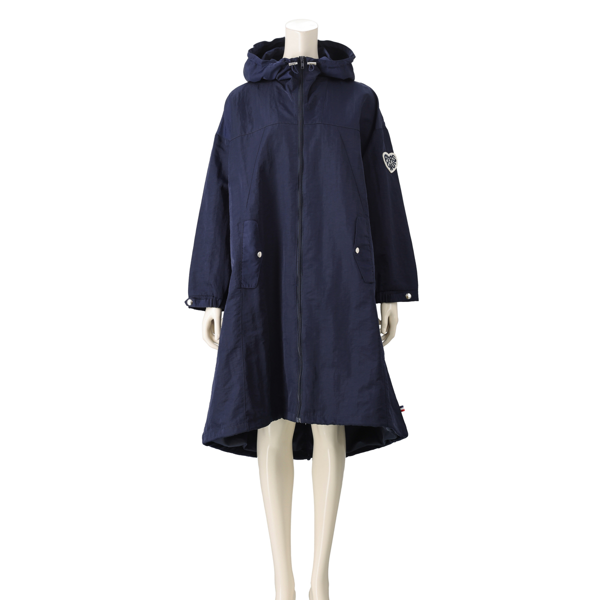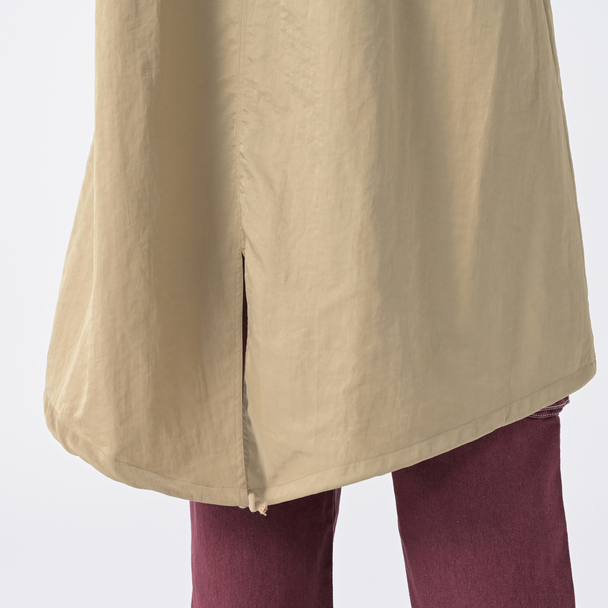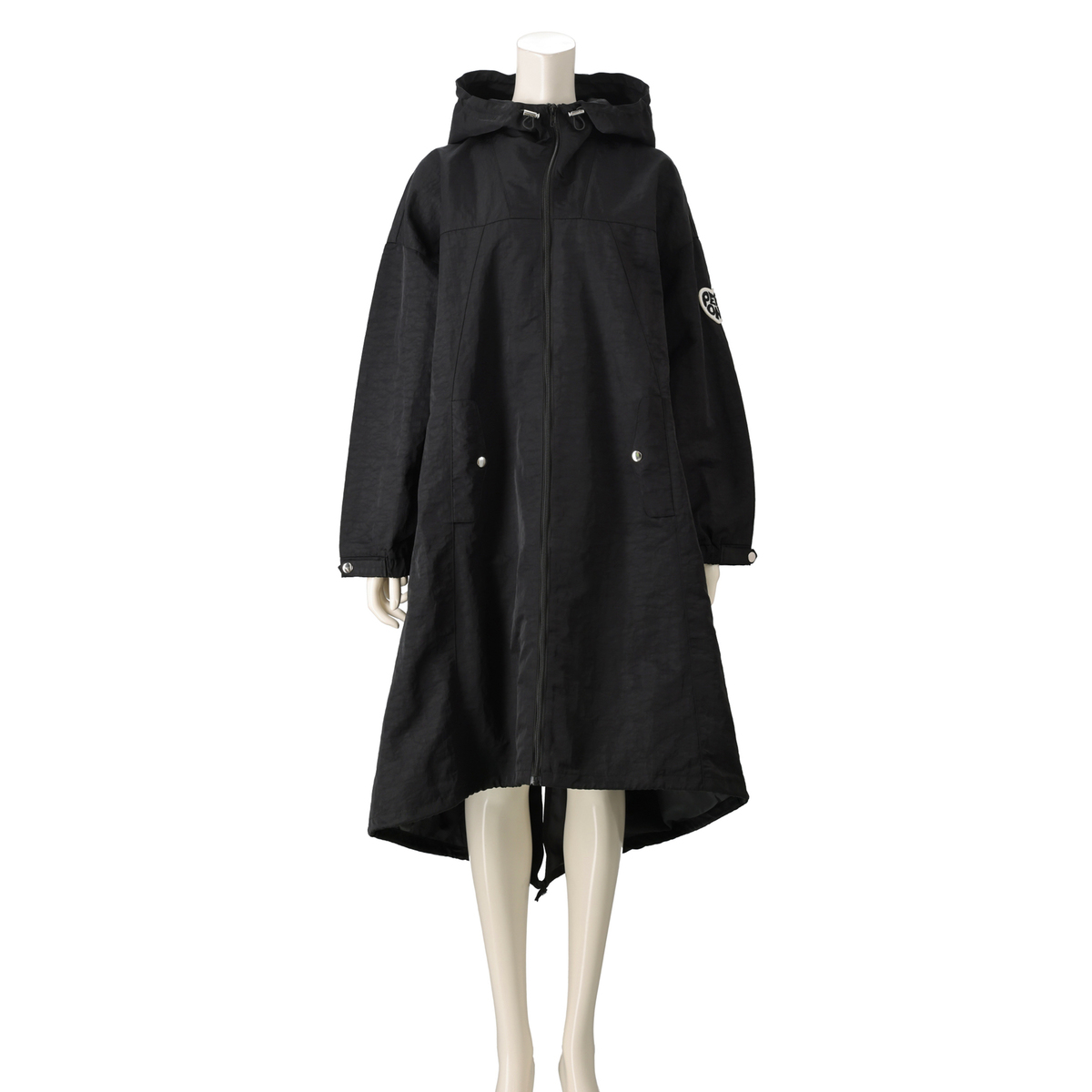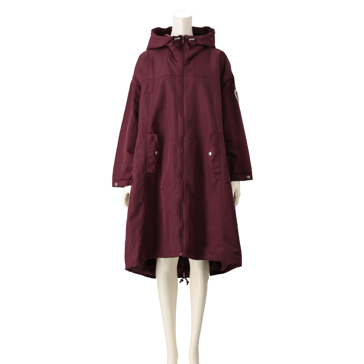 フード付きフレアーシルエットのロングコートです。程よい厚みのナイロン素材に裏地付きで、気温の変化が気になる季節にも重宝。ゆとりある作りで厚手のトップスも重ねやすく、デイリーに活躍します