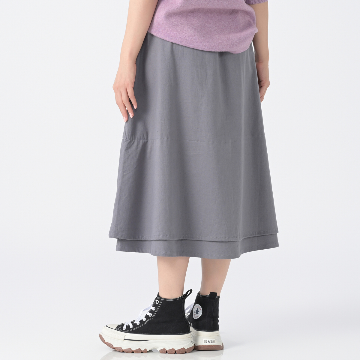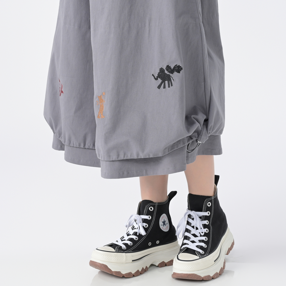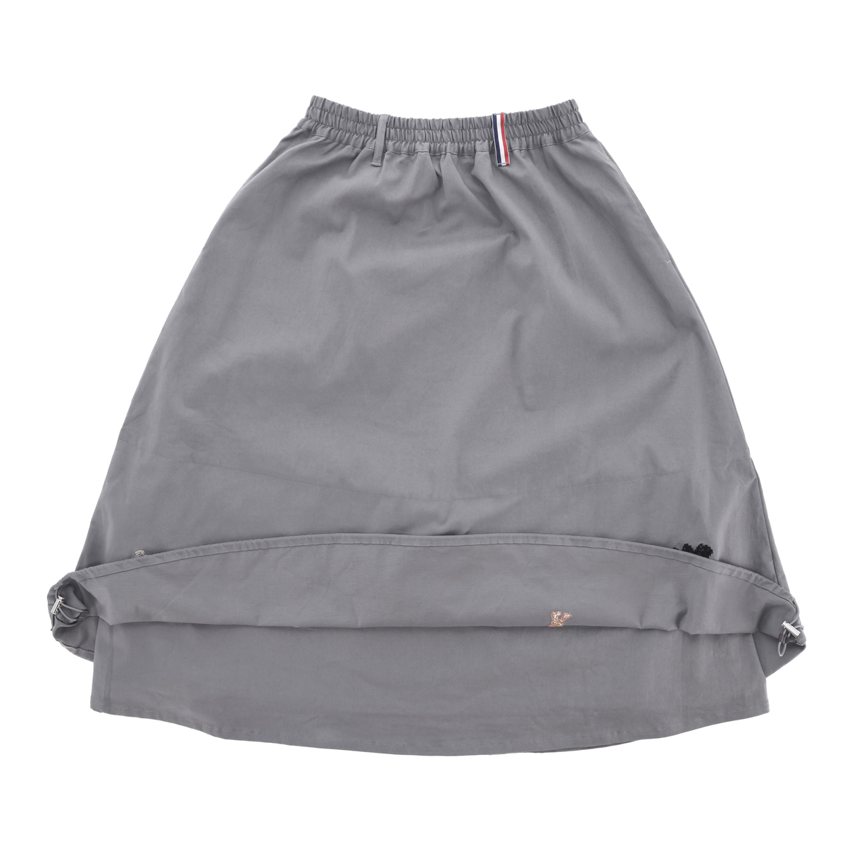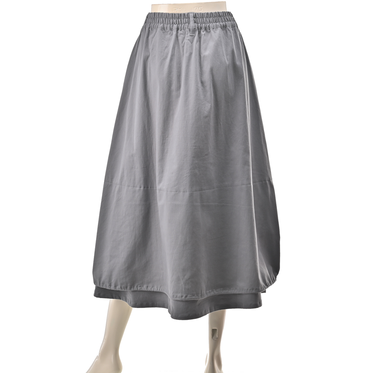 ふんわりとしたバルーンシルエットが魅力のロングスカート。レイヤード風のデザインで、裾はスピンドルで調整可能。ユニークなディテールが目を引き、コーディネートにお洒落なアクセントを添える、大人可愛い一枚です