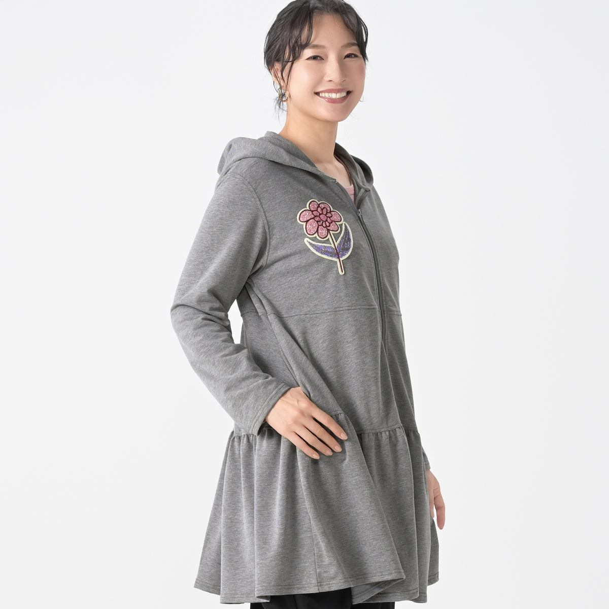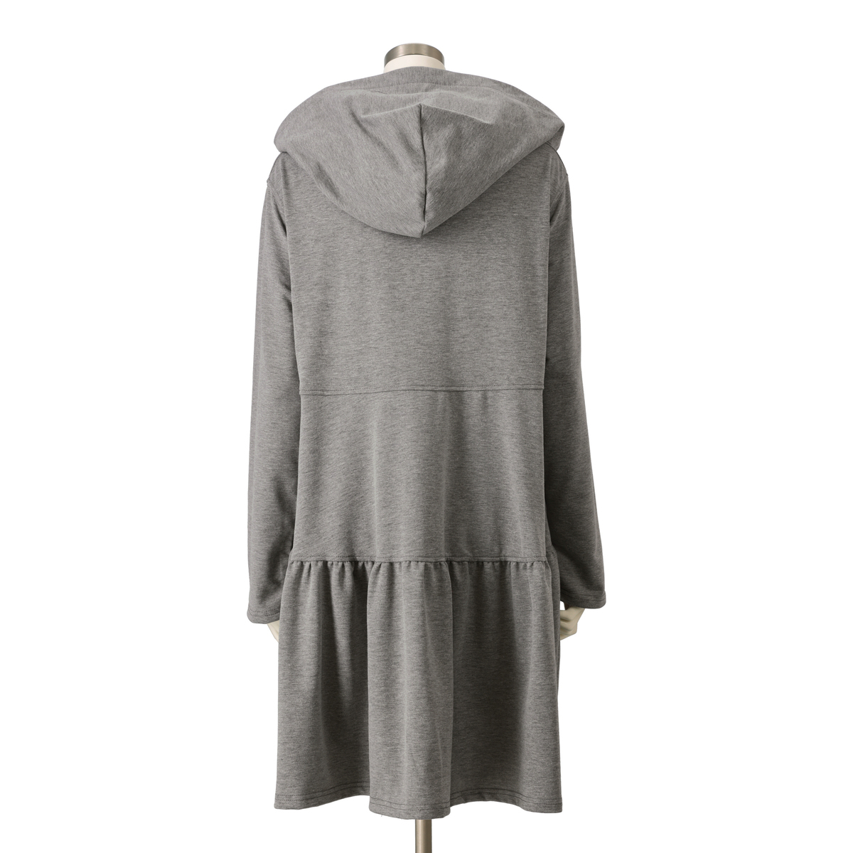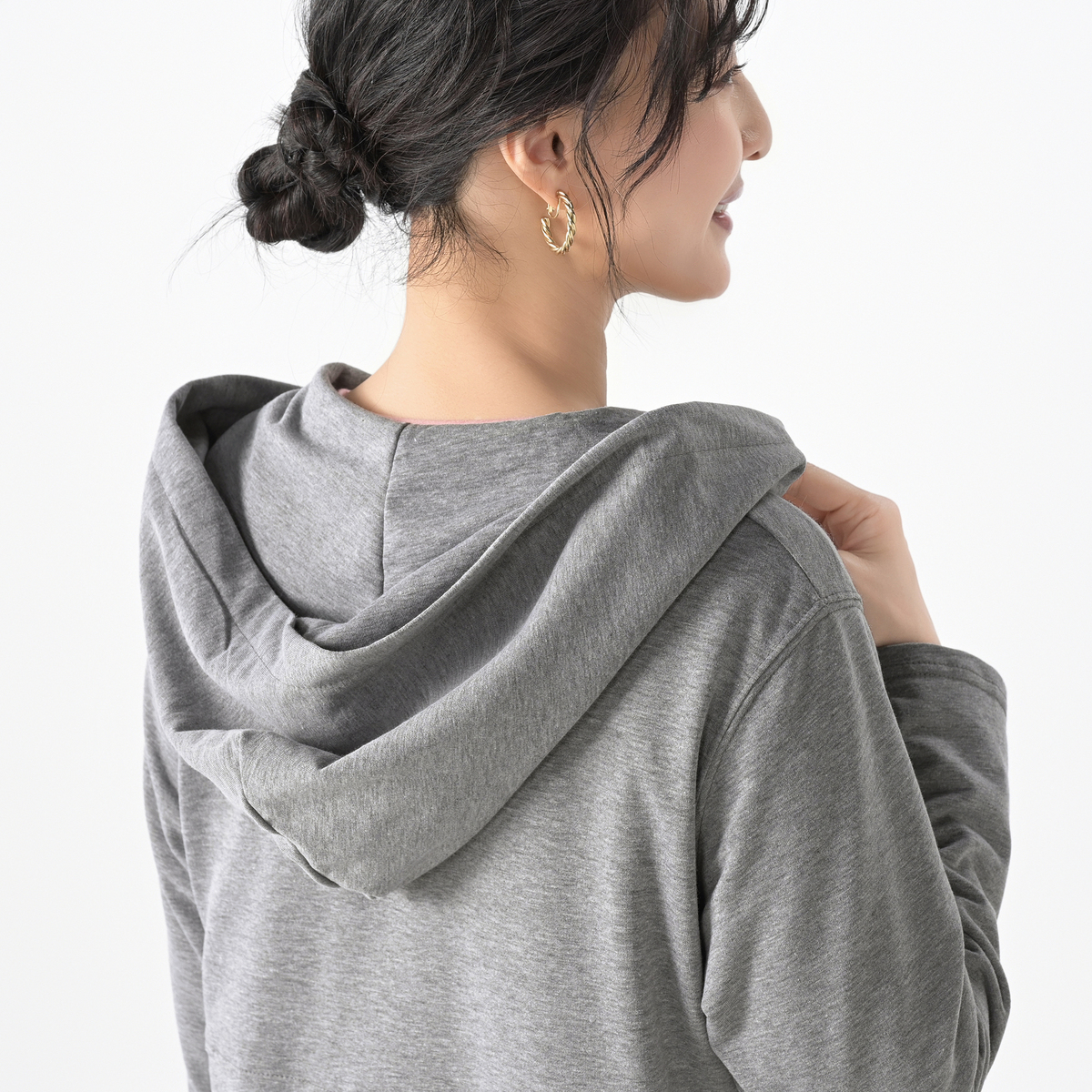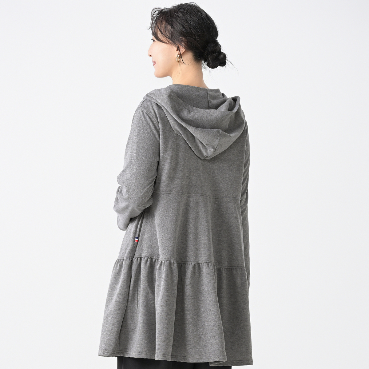 やや薄手の裏毛素材を使用した、チュニック丈のティアードデザインパーカー。膝上丈でハーフコート感覚の着こなしが楽しめる一枚です。バスト下の切替え位置を高めに設定することで、自然とスタイルアップが叶い、すっきりとした印象でお召しいただけます