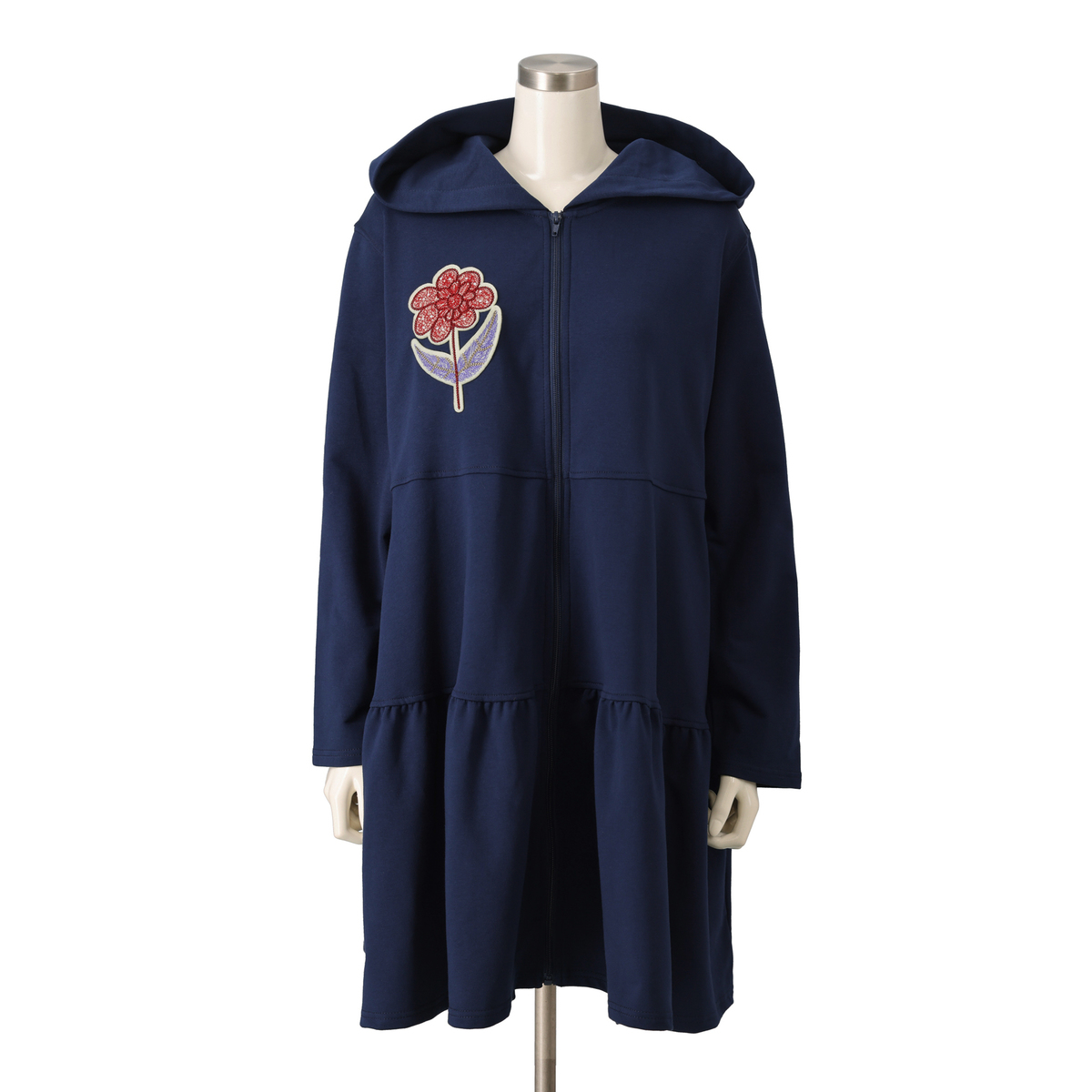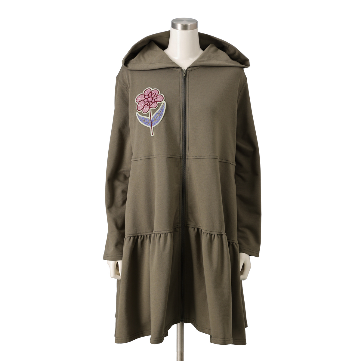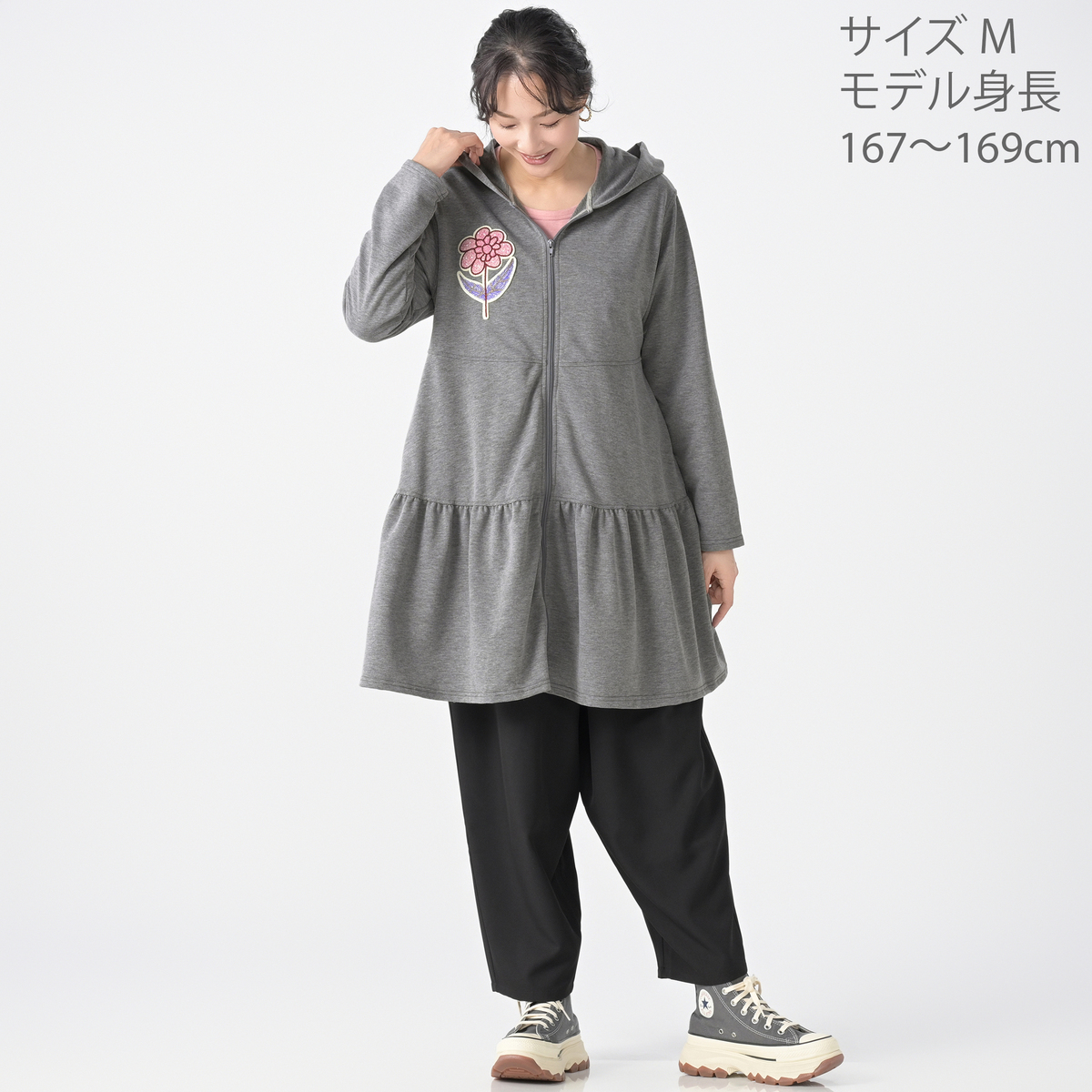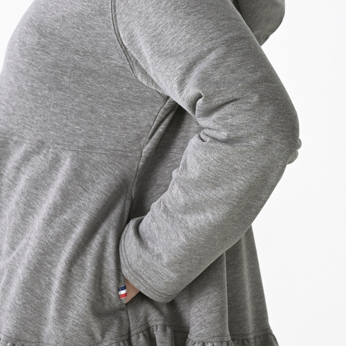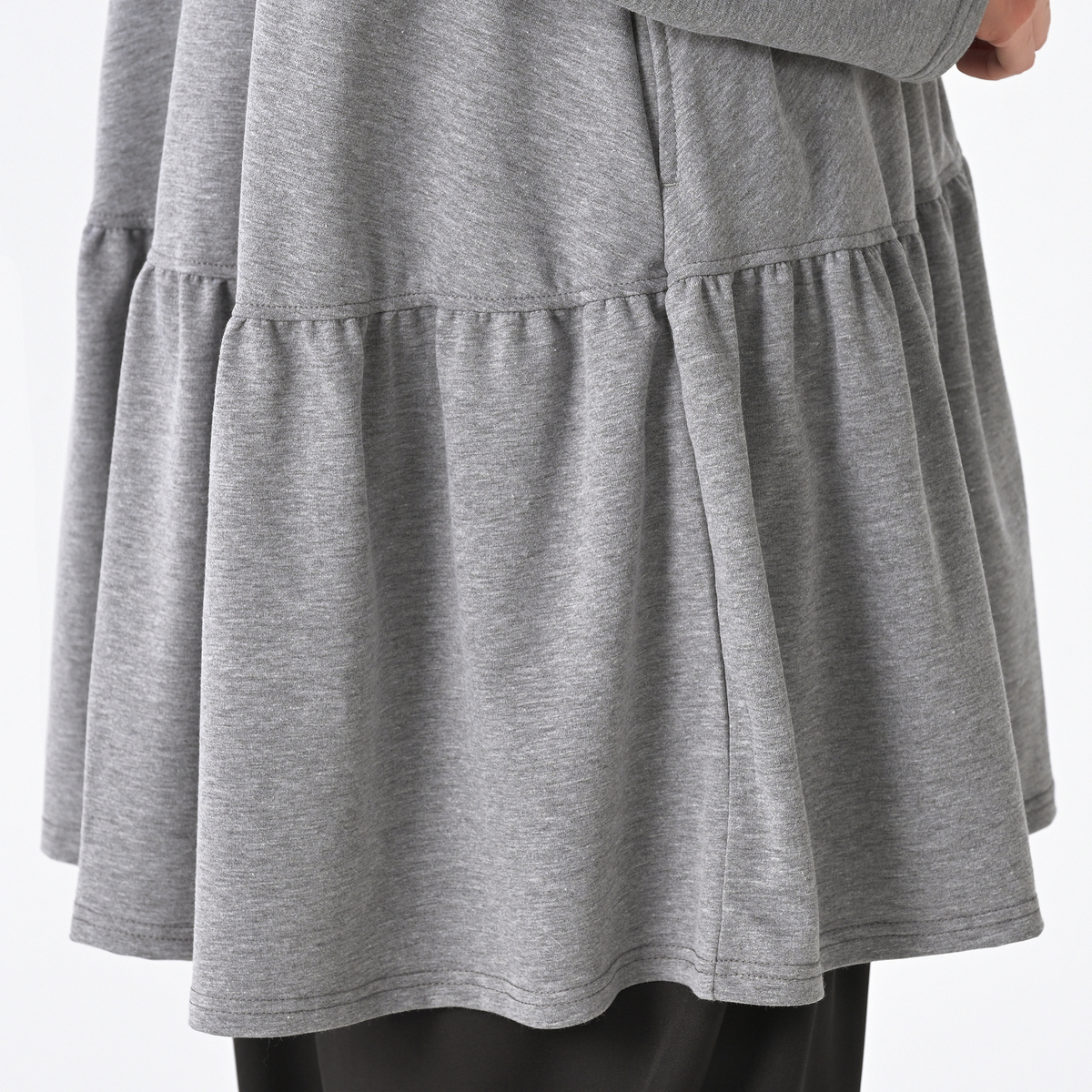 やや薄手の裏毛素材を使用した、チュニック丈のティアードデザインパーカー。膝上丈でハーフコート感覚の着こなしが楽しめる一枚です。バスト下の切替え位置を高めに設定することで、自然とスタイルアップが叶い、すっきりとした印象でお召しいただけます