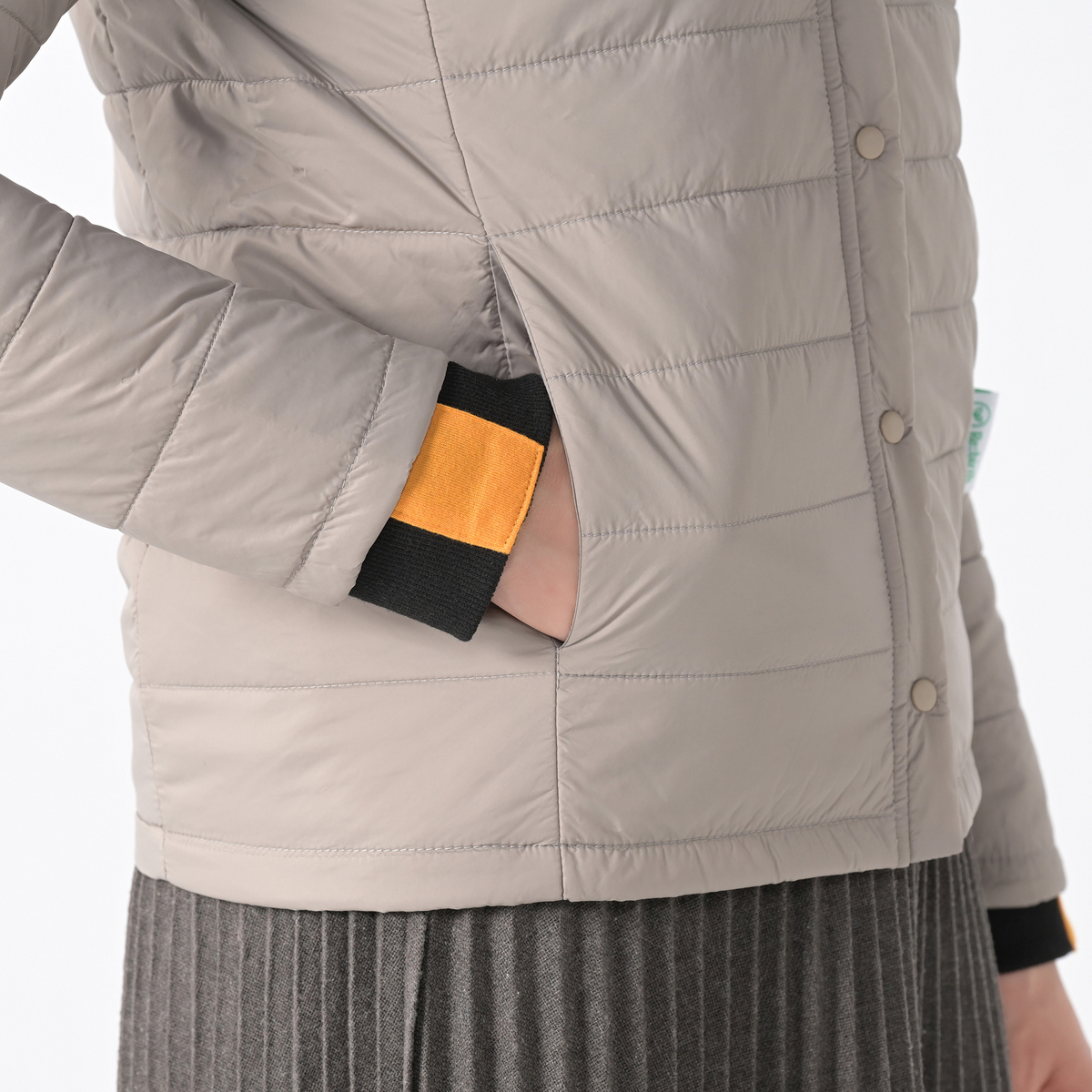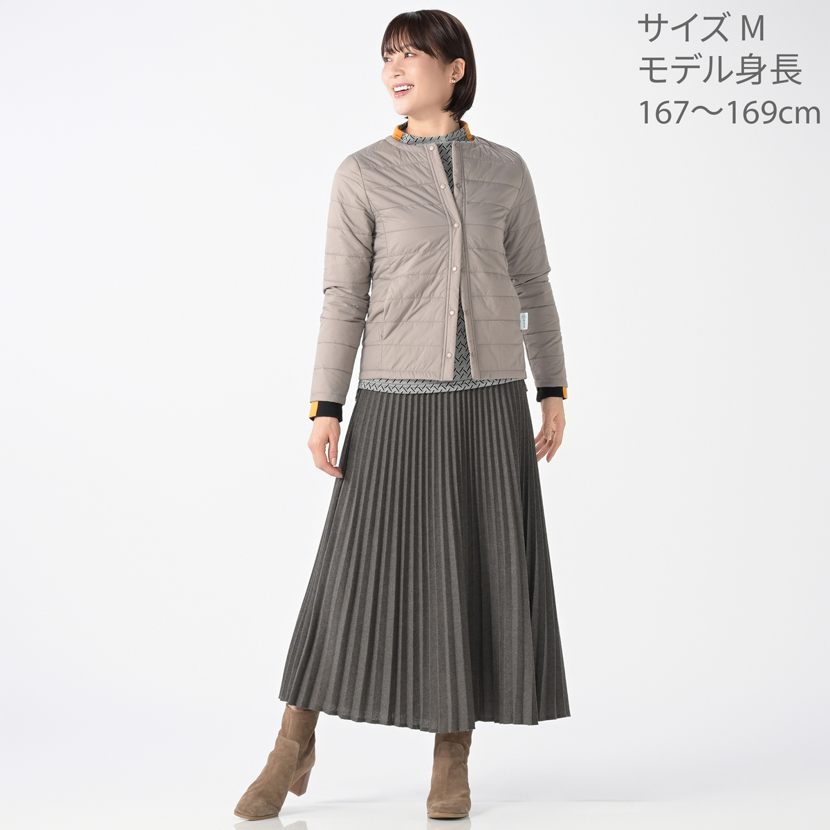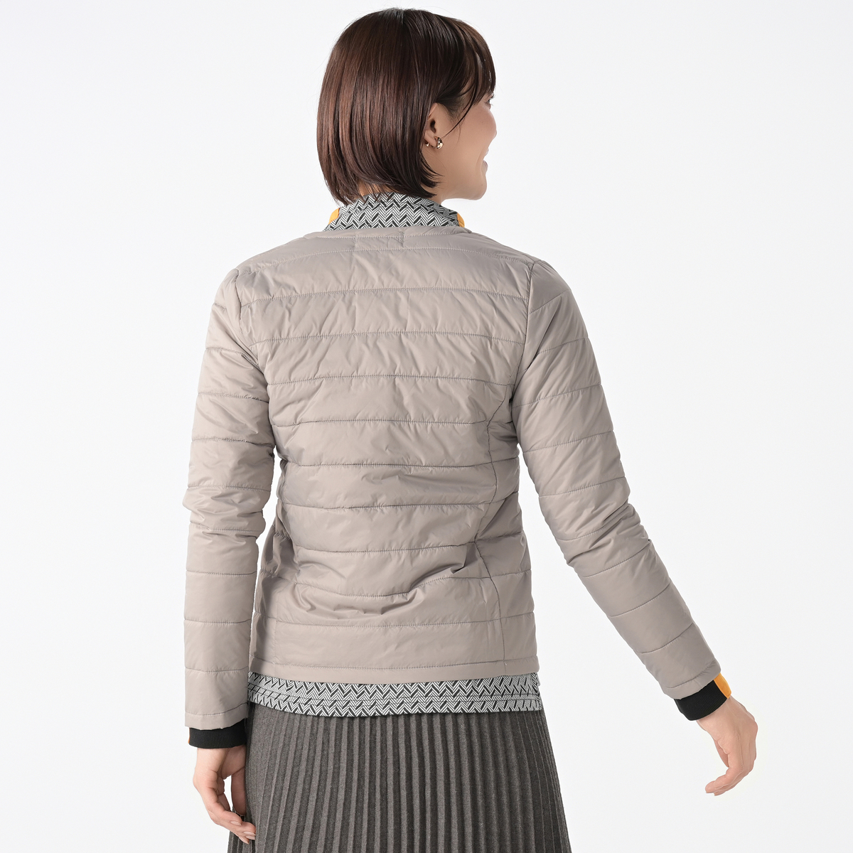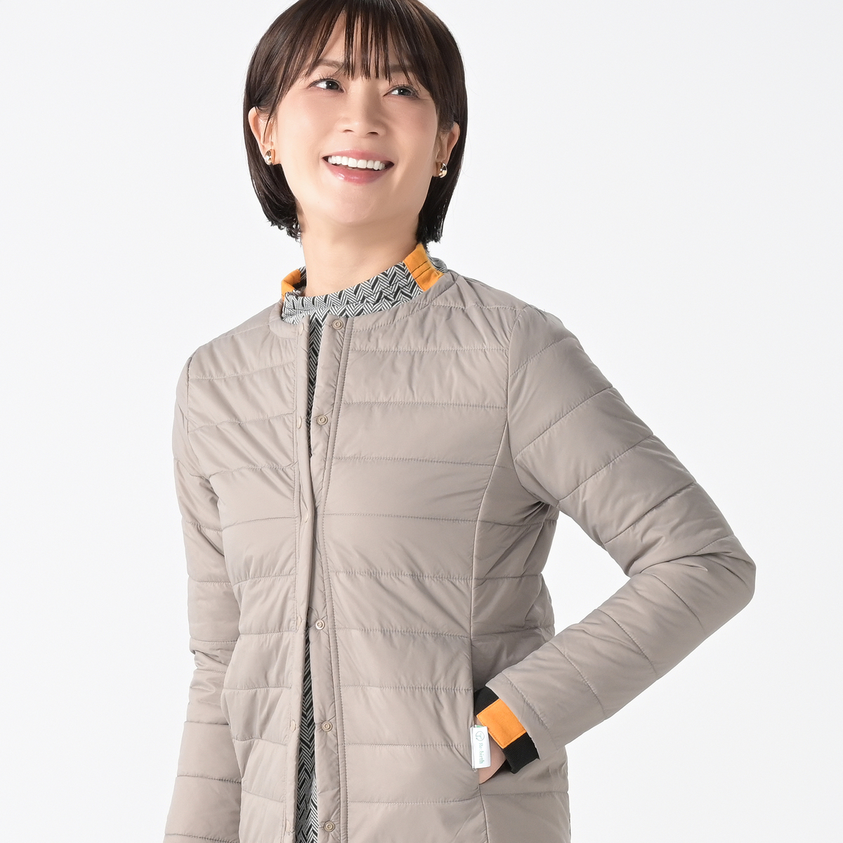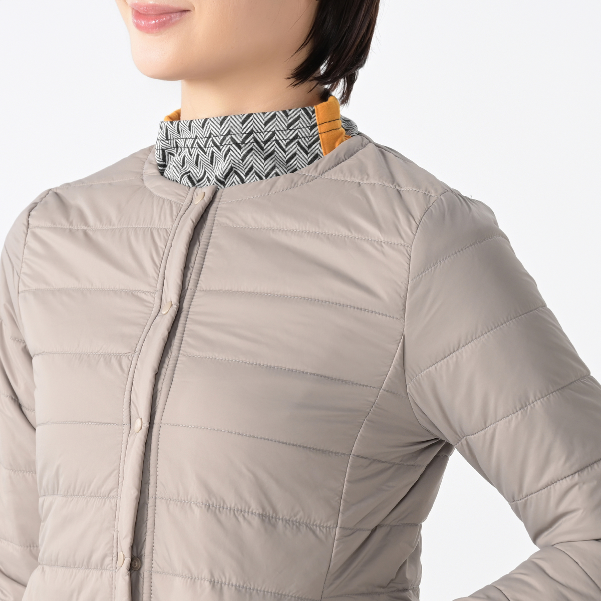 首元はすっきりとしたノーカラー仕様。インナーコートとしても、一枚で羽織っても使いやすいデザインです。軽やかな着心地で、立体感のあるフォルムが美しく、シルエットも崩れにくく。余計な装飾を省いたミニマルなデザインが、どんなスタイルにも自然に馴染みます