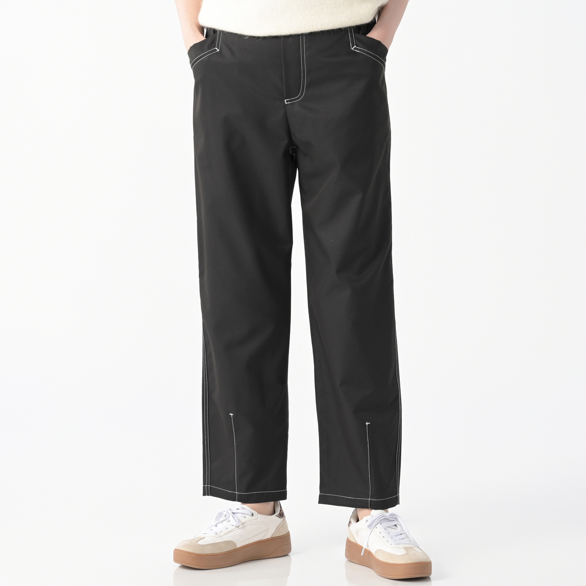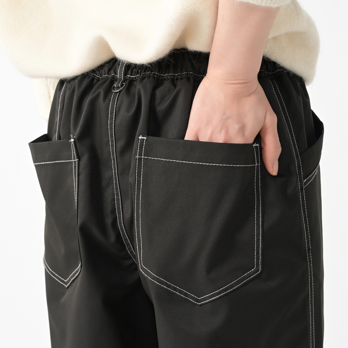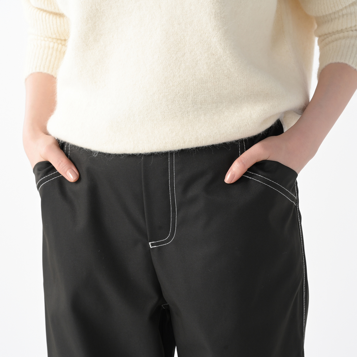 配色ステッチがさりげないアクセントとなったパンツ。脚のラインを拾いにくいコクーンシルエットに仕上げました。配色ステッチで縦のラインが強調され、脚長効果も期待できるデザイン。ウエストは総ゴム仕様で、フロントはフラットに、フェイク前立てですっきりした見た目に仕上げています