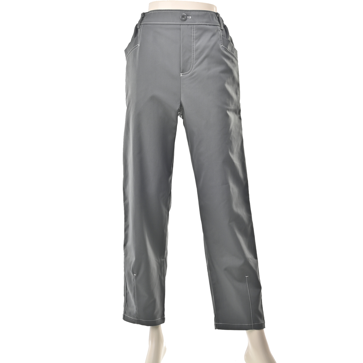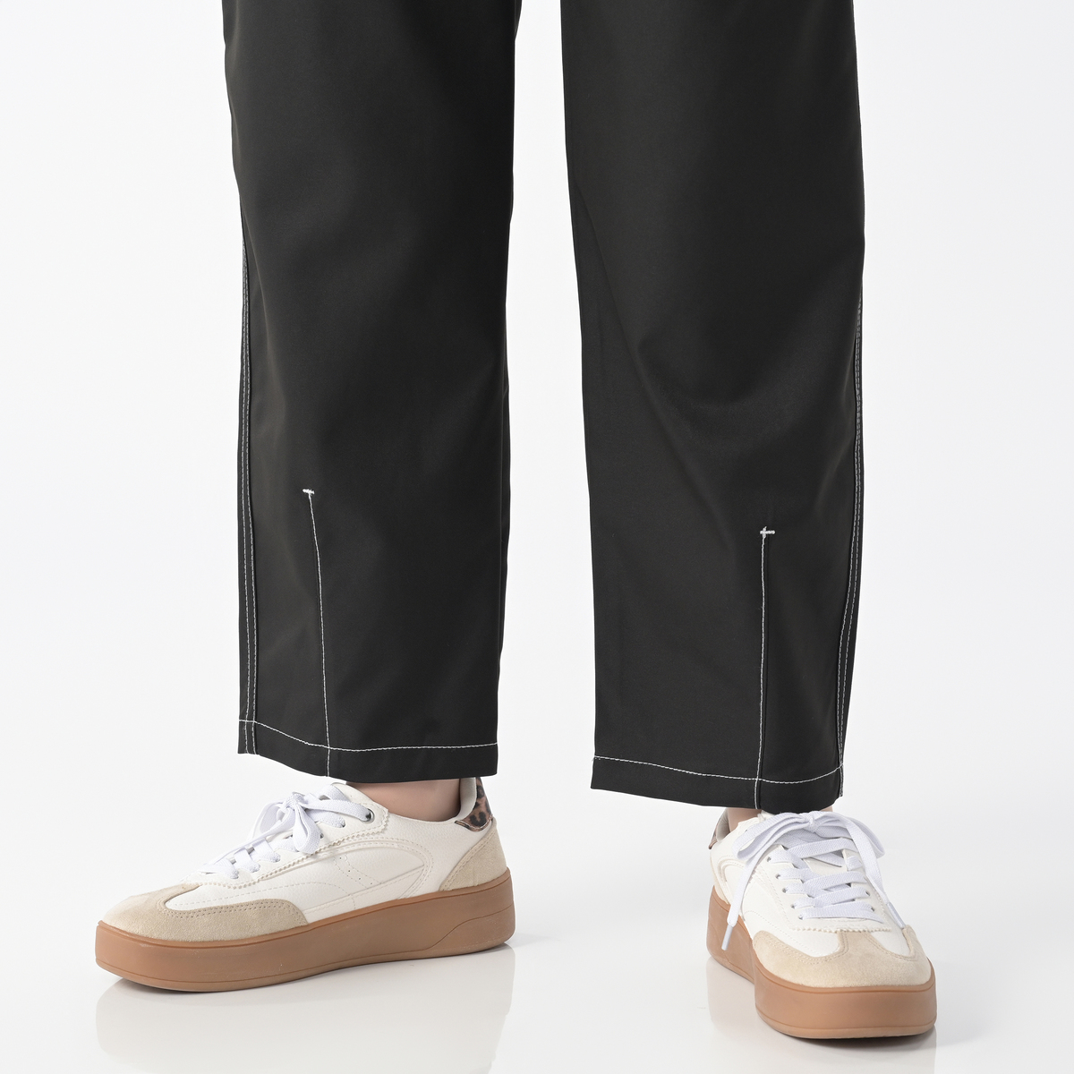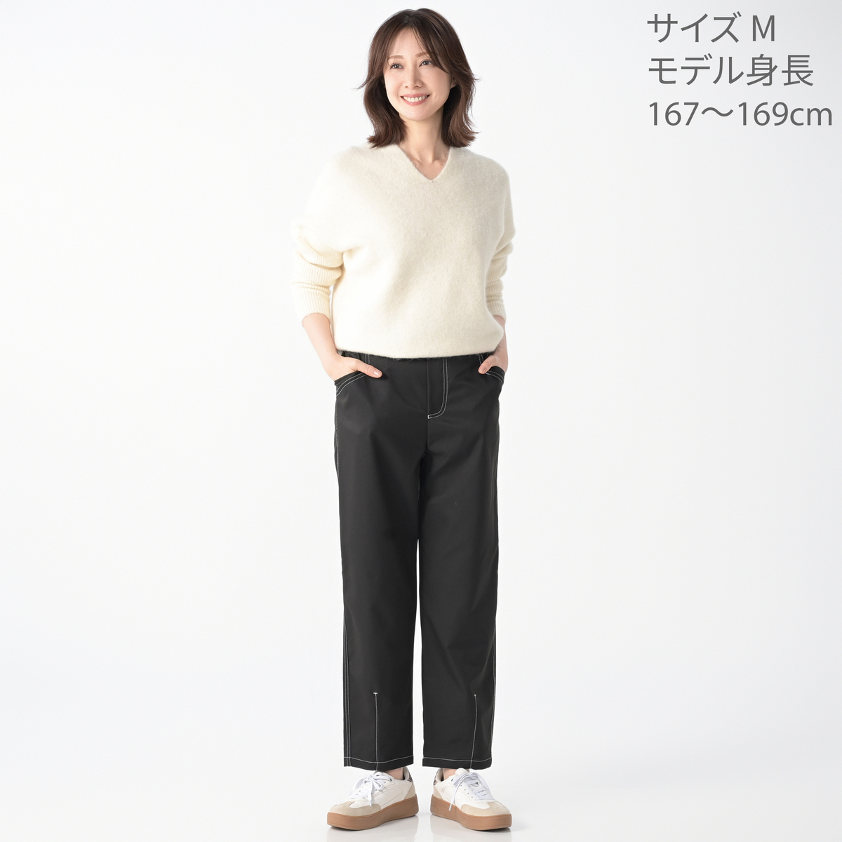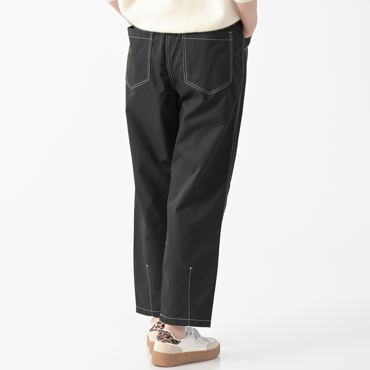 配色ステッチがさりげないアクセントとなったパンツ。脚のラインを拾いにくいコクーンシルエットに仕上げました。配色ステッチで縦のラインが強調され、脚長効果も期待できるデザイン。ウエストは総ゴム仕様で、フロントはフラットに、フェイク前立てですっきりした見た目に仕上げています