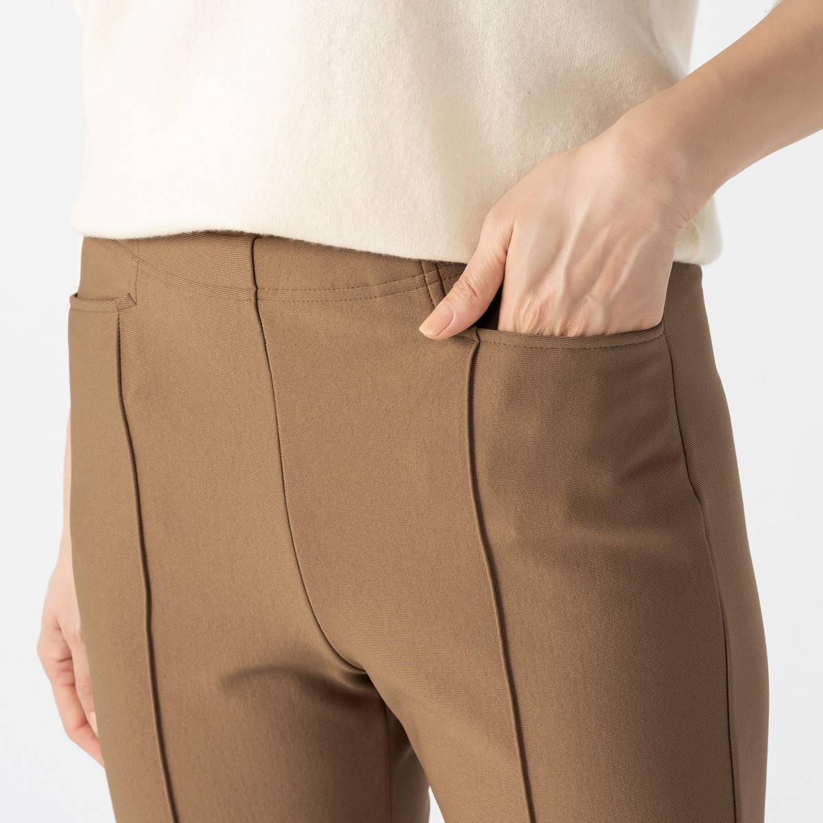 360度伸縮する国産素材を使用し、優しく上品な風合いで快適な着心地と美しいシルエットの維持を両立。裏面には深起毛を施し、空気層が生まれることで高い保温効果を発揮。ウエストには、締め付け感がソフトでひっくり返りにくく、肌触りの良いBBワッフルゴムを使用しました