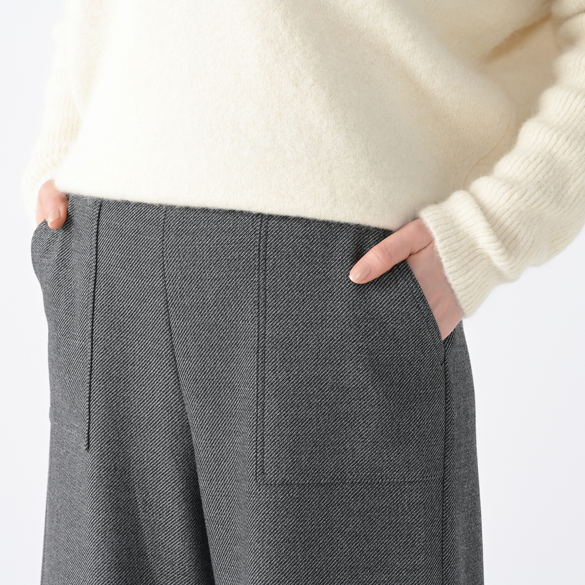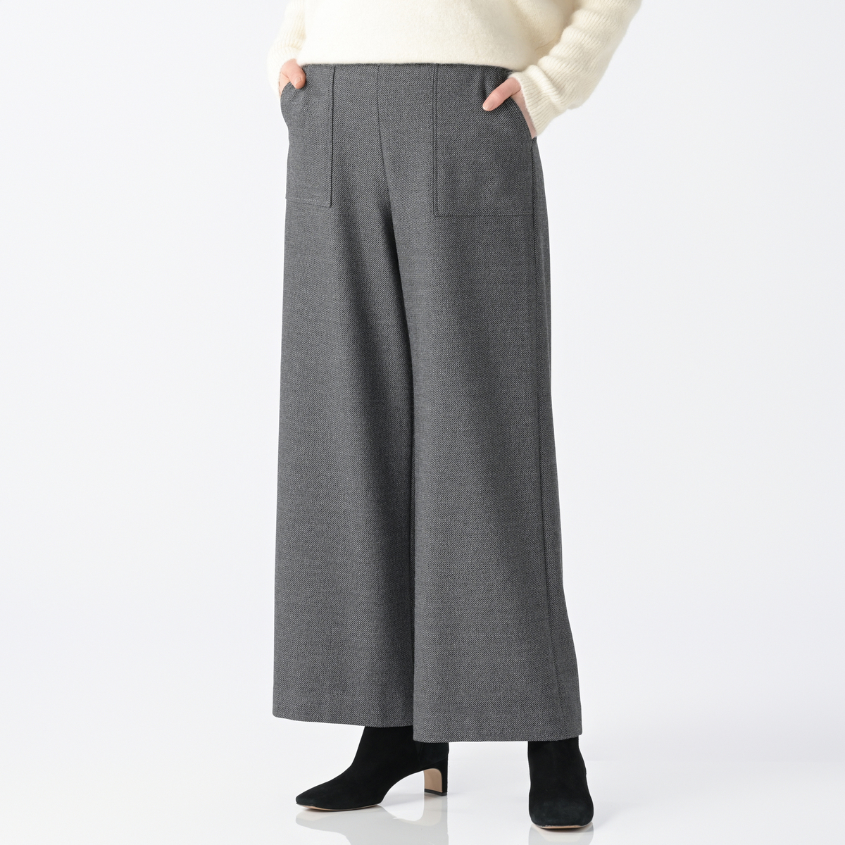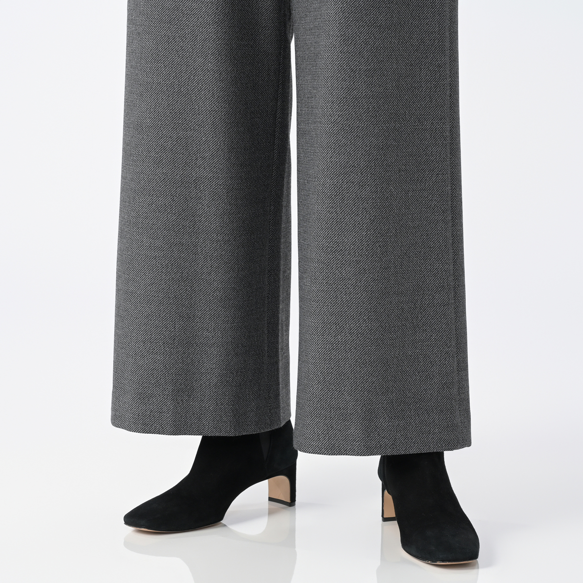 上品なツイード調生地で仕立てたワイドパンツ。株式会社マキムラの匠パターンナーが作り出す立体パターンにより、広がり過ぎない美しいシルエットに仕上げました
