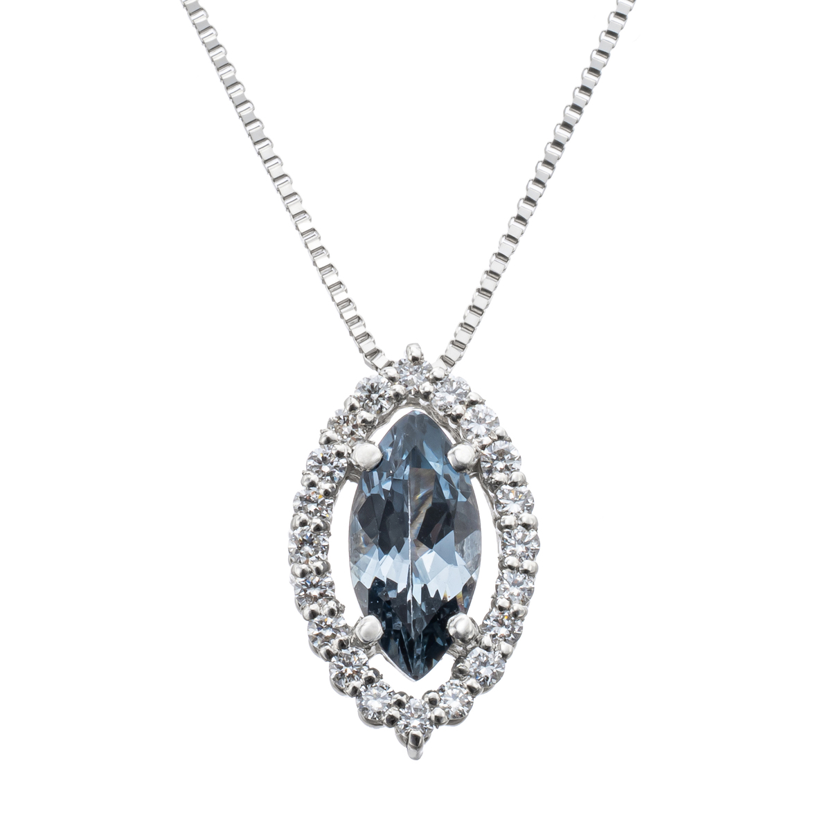 プラチナカラーのスピネルをあしらったペンダント。ダイヤモンドの煌めきも添えて、シンプルで合わせやすいデザインに仕上げました。デイリー使いから華やかなシーンまで幅広く活躍してくれます