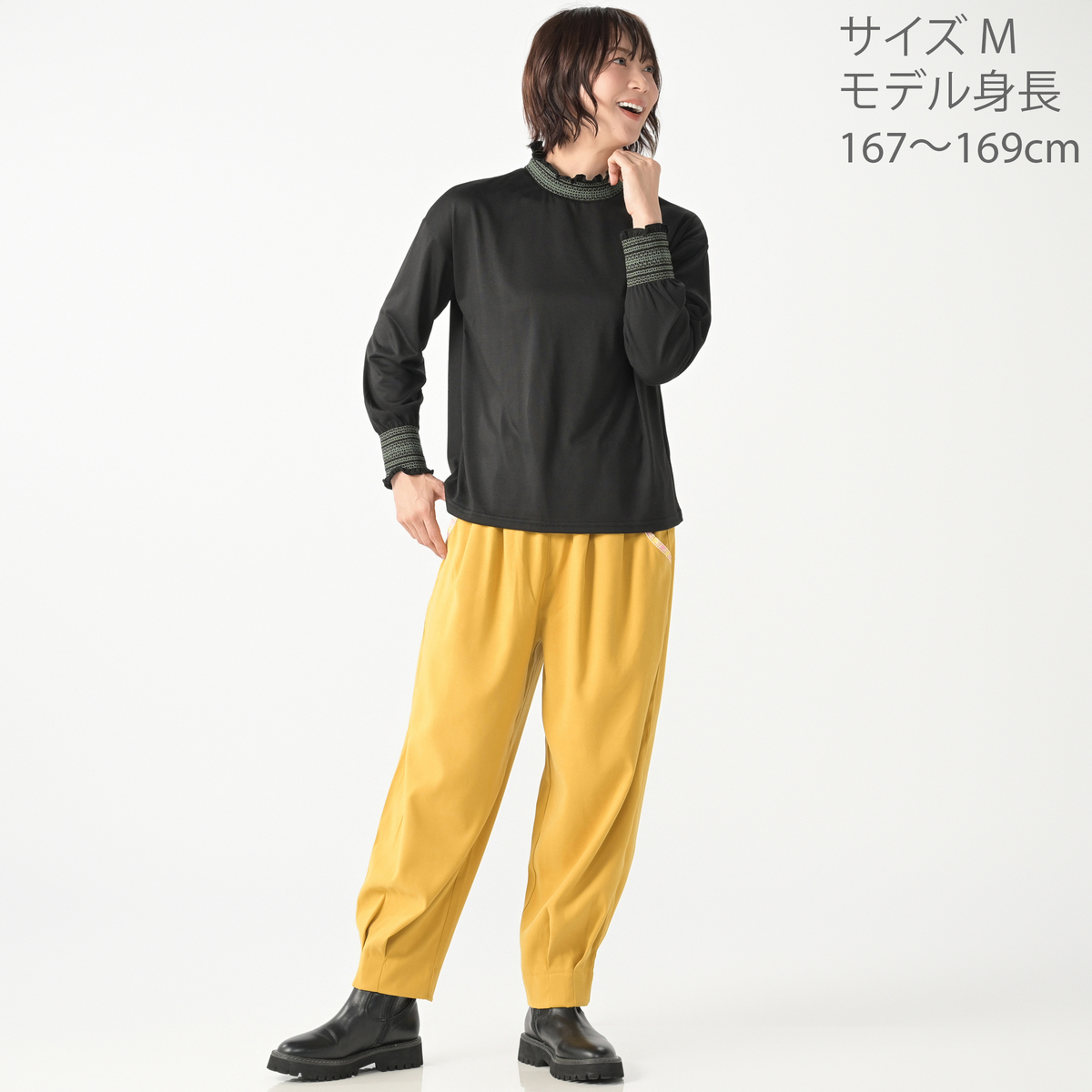 スモッキング刺繍が首元と袖口に施された、ふんわり暖かなプルオーバー。ピーチスキン加工の天竺素材は、ほんのりとした起毛感の柔らかな着心地。ゆったりシルエットに、刺繍の立体感がアクセントになり、全体のバランスを美しく整えてくれます