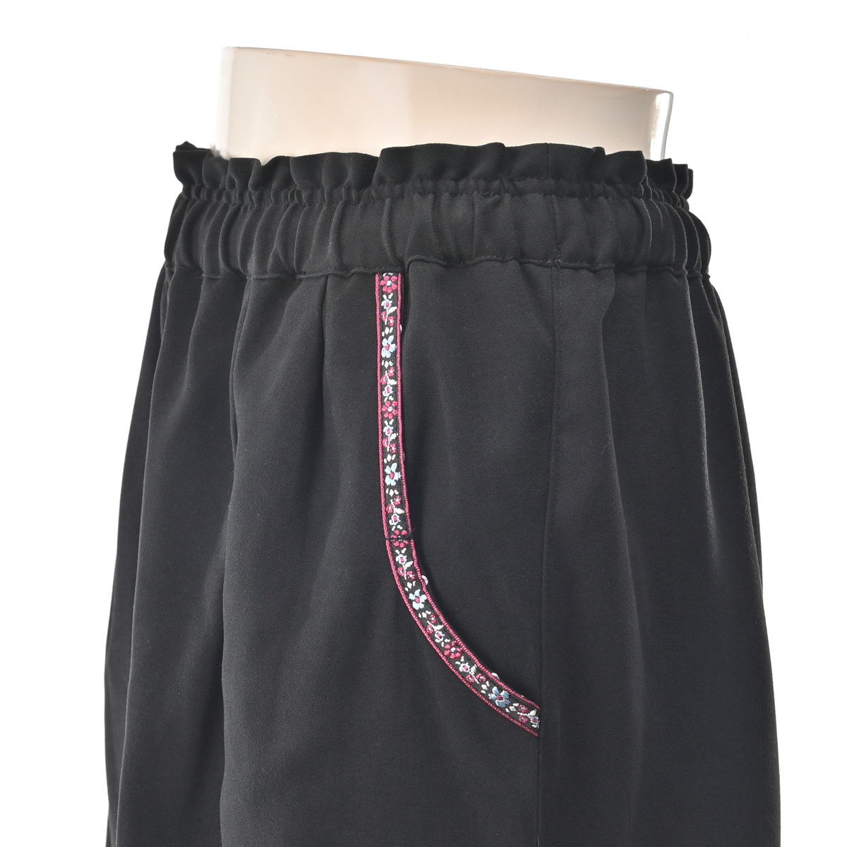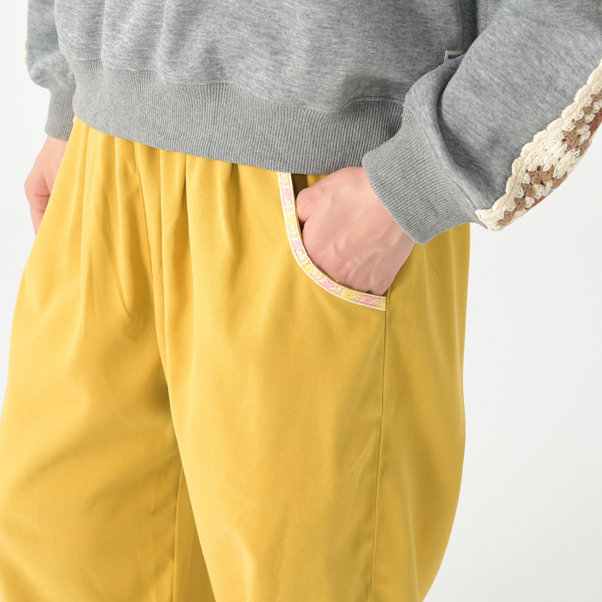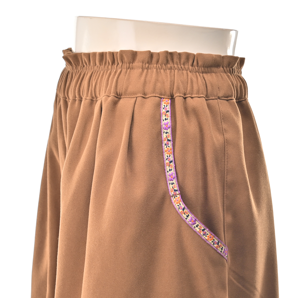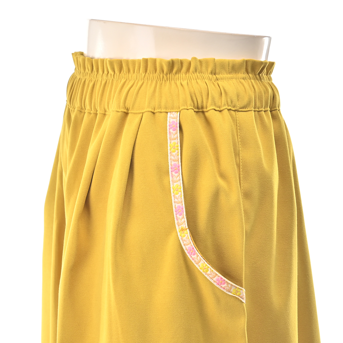 本体生地はバックサテン素材を使用。花を基調としたチロリアンテープをポケット口に配し、さりげないエスニックポイントに。シンプルなトップスと合わせるだけで、装いにほんの少しの華やぎを添えてくれます