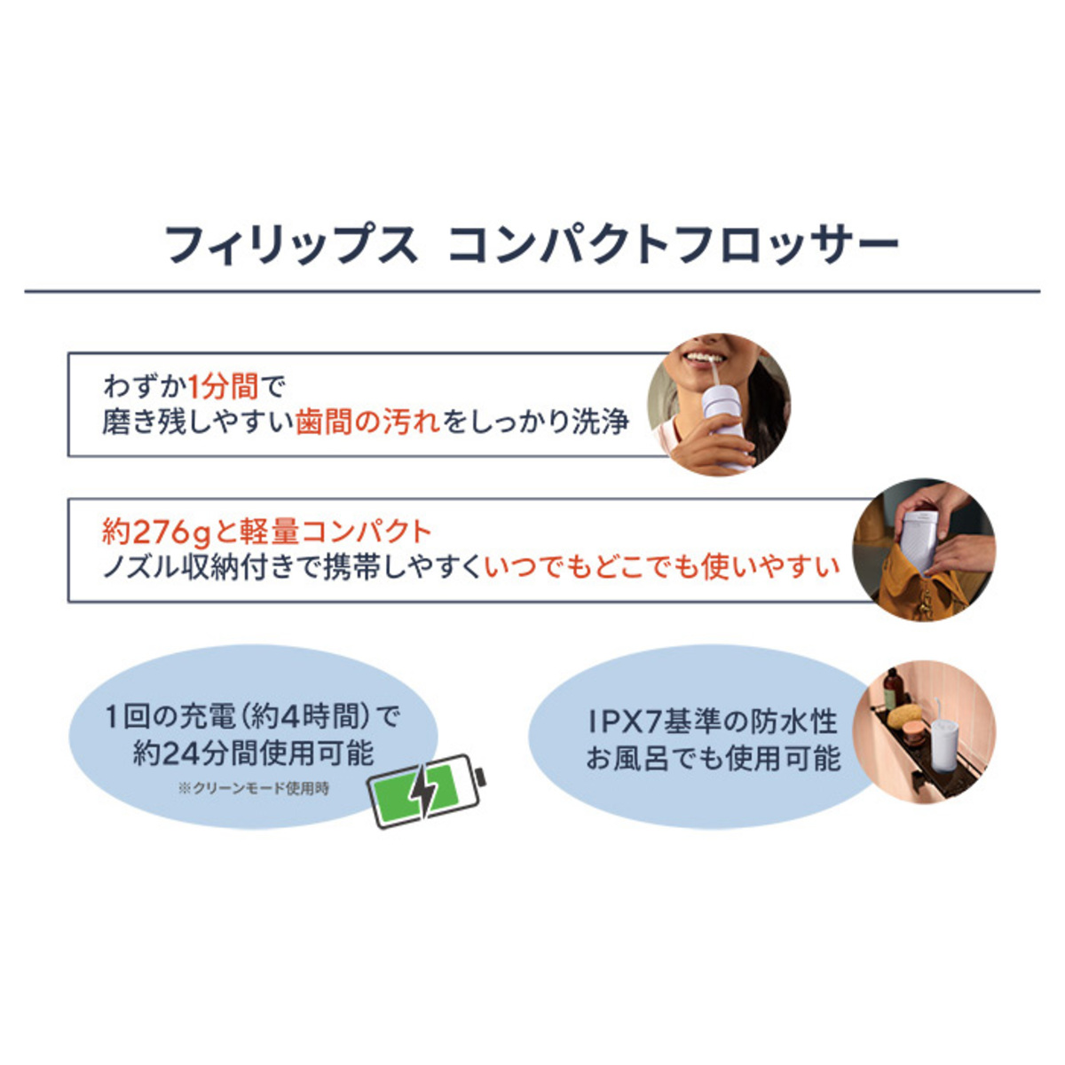[サイズ] 幅6.5×奥行7×高さ14.5cm [重量] 276g [容量] 約200ml [材質] 本体:ABS USBカバー部:Silicone rubber 水タンク:MBS [充電時間] 約4時間充電で約24分(※クリーンモード使用時)使用可能 [使用方法] 1、水タンクに注水したら、ノズルの先端をシンクに向けます。ハンドルの電源ボタンを押して、製品の電源をONにします。シンクに水を噴霧させます。ノズルから水が出たら、電源をOFFにします 2、ノズルの先端を口の中に入れます。シンクに上体を乗り出してから、水はねを防ぐために、唇からノズルの先端にかぶせるように部分的に閉じます。口からシンクへと水が流れ出るよう、十分な隙間を開けて下さい ※ハンドル使用時はノズル取り外しボタンを押さないように、ハンドルを持つ位置を調整して下さい 3、ハンドルの電源ボタンを押して製品の電源をONにします a、ノズルの先端が歯ぐきに沿って90度の角度になるように向けます b、上または下の奥歯から始めて、ノズルの先端を歯ぐきに沿ってスライドさせながら、それぞれの歯間で短時間動きを止めます [お手入れ] 1、使い終わったら、製品の電源をOFFにします 2、ノズルを引っ張りながら取り外しボタンを押し、ノズルを取り外します 3、ノズルの先端をぬるま湯で洗い流します 4、注水口のフタを開き、中身を空にします。水タンクは、ぬるま湯と中性洗剤を用いて手洗いできます ※必要に応じて、ハンドルは柔らかい布を使って拭きとりをして下さい 5、ノズル・ハンドル表面・水タンクの水切り、乾かします 6、ノズルをハンドルに挿入し保管します ■取り扱い説明を充分にご確認の上、ご使用下さい 【ベトナム製】 [注意事項] ※治療中の歯や不安定な入れ歯など口腔内に気になる症状がある場合は、その部位での使用はしないで下さい ※水道水かぬるま湯以外(うがい液など)は使用しないで下さい ※過去2カ月間を目安に口腔内の治療や歯ぐきの手術を受けられた場合は、本製品をご使用になる前に、あらかじめ歯科医師にご相談下さい [セット内容] <フィリップスソニッケアーコンパクトフロッサー1000> ・ソニッケアーコードレスパワーフロッサー ・充電ケーブル ・スタンダードノズル ・コンフォートノズル ※ACアダプターは付属しません <フィリップス ソニッケアー コンパクトフロッサー ノズル 2本入り> ・スタンダードノズル ・コンフォートノズル ※本製品は口腔洗浄器です。歯間や歯の表面から食べかすを取り除くことで虫歯を予防し、歯ぐきの健康を促進することを目的としています。本製品は一般家庭向け商品であり、1日1回以上の使用を想定しています ※本製品をご使用の結果、万一激しい出血があった場合や、本製品を使い始めて1週間経過後も出血が認められる場合には、ご使用を中止し、歯科医師にご相談下さい ※健康面で不安なことがある場合はご使用の前にかかりつけの医師にご相談下さい ※水道水かぬるま湯以外(うがい液など)は使用しないで下さい ※ハンドル本体は防水加工をしており、水場や浴室でも使用できますが、水や液体の中に浸けないで下さい(故障の原因となります)。水場や浴室で使用する場合は電源コネクタ受部にカバーが完全に装着されていることを確認して下さい ※ハンドル使用時はノズル取り外しボタンを押さないように、ハンドルを持つ位置を調整して下さい ※USB電源アダプタは同梱されておりません ※ノズルは6カ月ごとに交換して下さい。また、破損した場合はすぐに交換して下さい