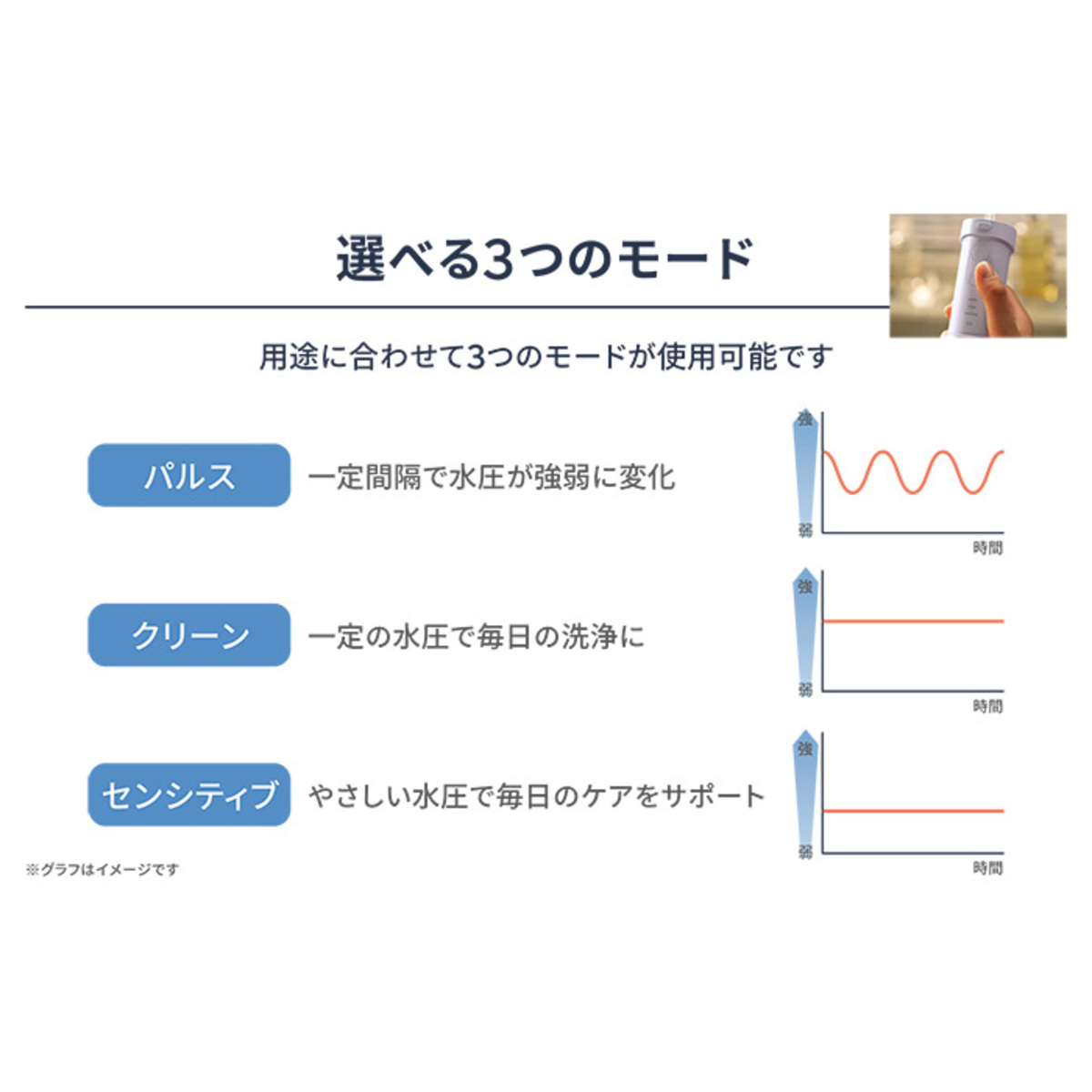3つのモードと2種類のノズルで、用途やお好みに合わせた口腔ケアが可能です。ペーサー機能が15秒経過すると一時的に水流を止めて洗浄区分の変更をお知らせするので、適切なフロス時間で口腔内全体をくまなく洗浄。IPX7防水仕様で浴室でも使えます(*5)