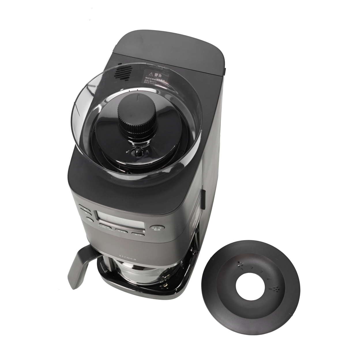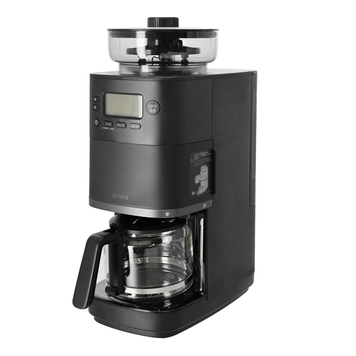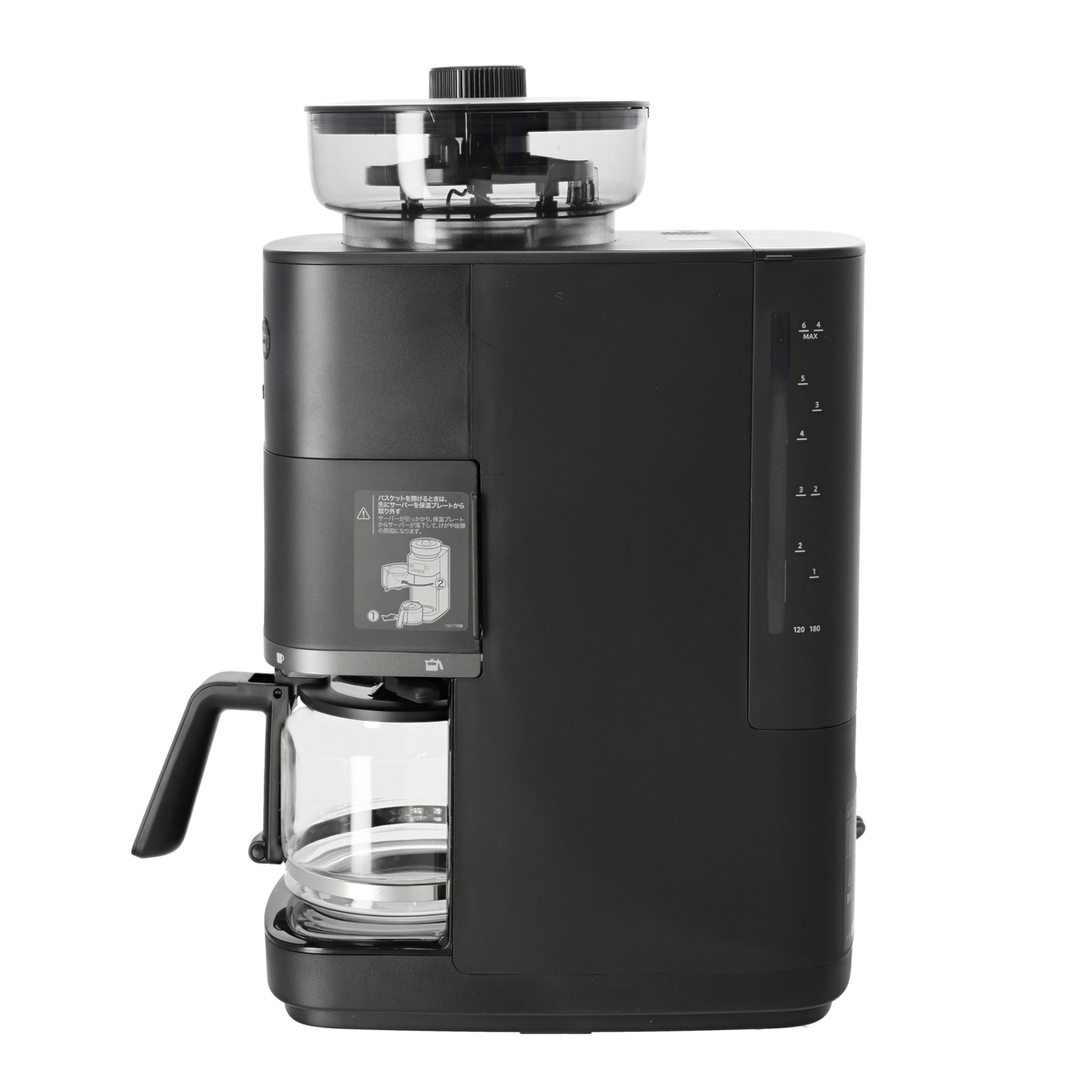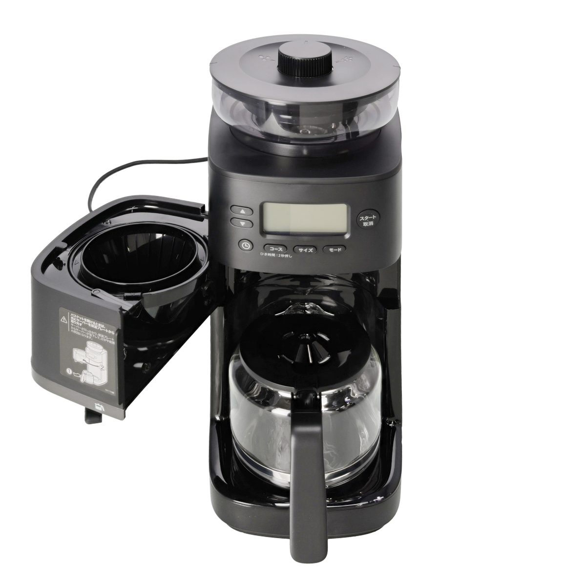 [商品内容] ・本体 ・お手入れブラシ [サイズ] 幅16.6×奥行27.3×高さ42.1cm(サーバー含まず) [重量]4100g [容量]830ml [コード長さ]1.2m [消費電力]750W [材質] PP樹脂、ABS樹脂、AS樹脂 [使用方法] 準備 市販の台形型フィルターを用意し、バスケットに取り付けます コーヒー豆またはコーヒー粉を入れます ・コーヒー豆の場合: ホッパーふたを外し、ホッパーに豆を入れます。ダイヤルを回して、豆の挽き具合を無段階で調節します ・コーヒー粉の場合: フィルターに直接、杯数に合わせた粉を入れます 給水タンクに水を入れ、本体に取り付けます ■取り扱い説明を充分にご確認の上、ご使用下さい 【中国製】 [注意事項] ※分解、修理、改造は絶対に行わないでください ※お子様や、取り扱いに不慣れな方だけで使用させないでください ※本体や操作部に水をかけたり、水につけたりしないでください ※蒸気が出るところや保温プレートに手や顔を近づけないでください ※サーバー、給水タンク、ホッパーふたがない状態では使用しないでください ※穴や隙間に指や金属物を入れないでください ※異常が発生した場合は、すぐに使用を中止し、電源プラグを抜いてください ※濡れた手で電源プラグの抜き差しをしないでください ※電源プラグは根元まで確実に差し込んでください ※お手入れをする際は、必ず電源プラグをコンセントから抜いてください ※不安定な場所や熱に弱い敷物の上、熱源や火気の近くでは使用しないでください ※使用中や使用後しばらくは、高温部に直接触れないでください ※抽出中にサーバーやマグカップを外さないでください ※給水タンクに水が入っていない状態で通電する「空だき」をしないでください ※給水タンクに水以外のものを入れたり、沸かしたりしないでください ※2回連続で使用した後は、30分間休ませてから使用してください ※ミルにコーヒー豆以外のものを入れないでください ※使用中にホッパーふたやバスケットを開けないでください ※屋外で使用しないでください ※テーブルなどからはみ出した状態で使用しないでください ※カーペットや布製のテーブルクロスの上では使用しないでください [お手入れ] 毎日のお手入れ ・バスケット: 使用後、バスケットを本体から外し、コーヒー粉を捨てます。流水でコーヒー粉を洗い流してください ・サーバー: サーバー内のコーヒーかすを捨て、洗剤をつけたスポンジなどで洗浄します ミルお手入れモード 本体に何もセットされていない状態で電源プラグを差し込みます 《モード》ボタンで「ミルお手入れ」を選択します 《スタート/取消》ボタンを押すと、ミルが回転してコーヒー粉を落とします 本体が冷めてから、ミルブラシでミルを掃除します クリーニングモード バスケットをセットし、給水タンクに水を入れます 《モード》ボタンで「クリーニング」を選択します 《スタート/取消》ボタンを押すと、内部を洗浄します。終了音が鳴るまでお待ちください その他の部分のお手入れ ・給水タンク、じかマグ切り替えレバー: 中性洗剤をつけたスポンジなどで洗い、水で十分にすすぎます ・本体: 乾いた柔らかい布で拭いてください。汚れがひどい場合は、水で薄めた中性洗剤を布に含ませて拭き、その後乾いた布で拭き取ります