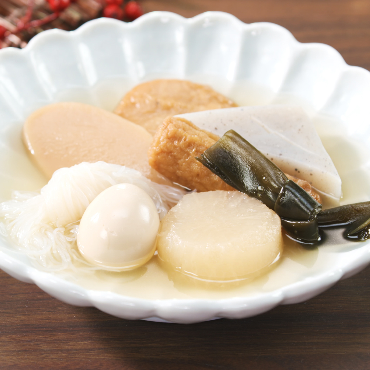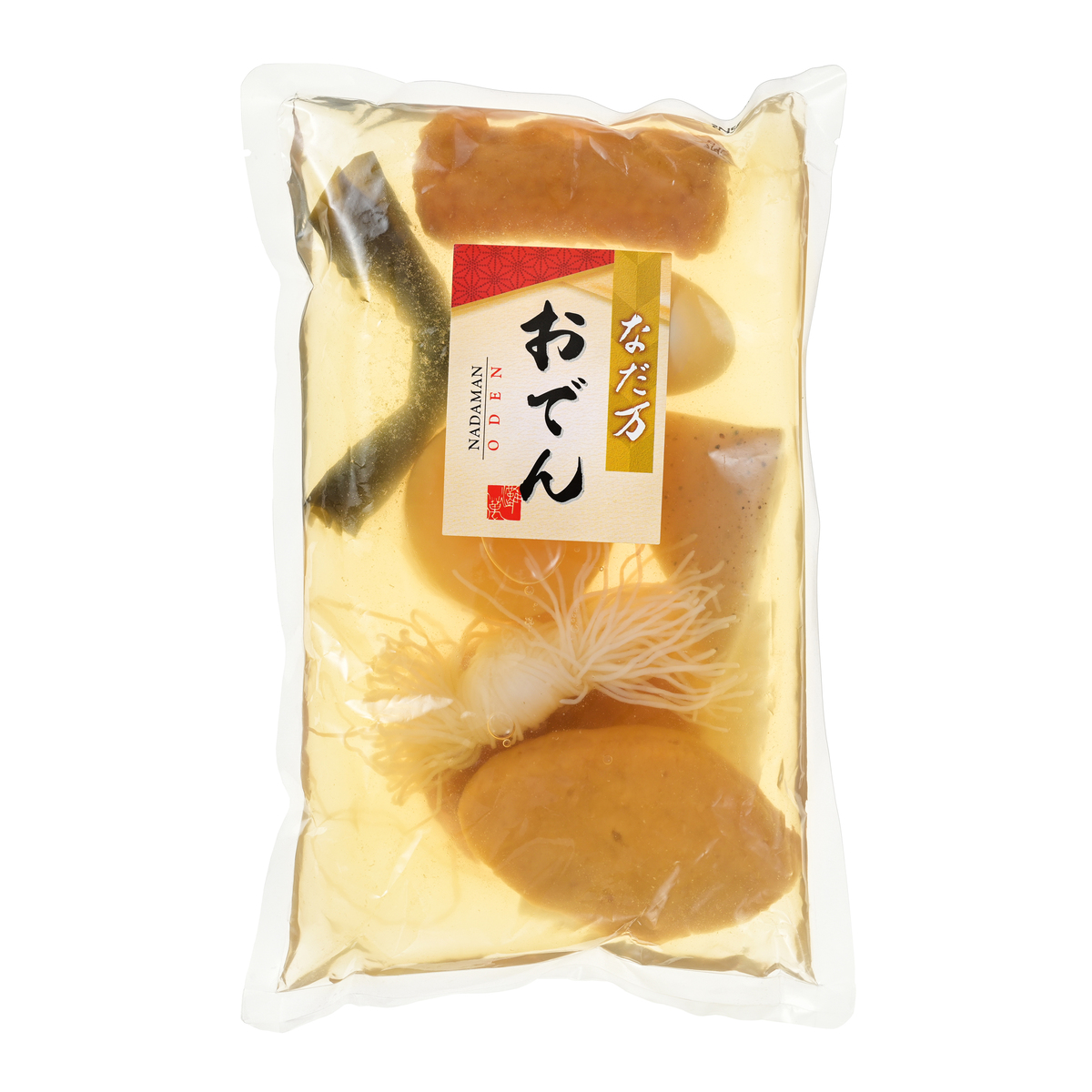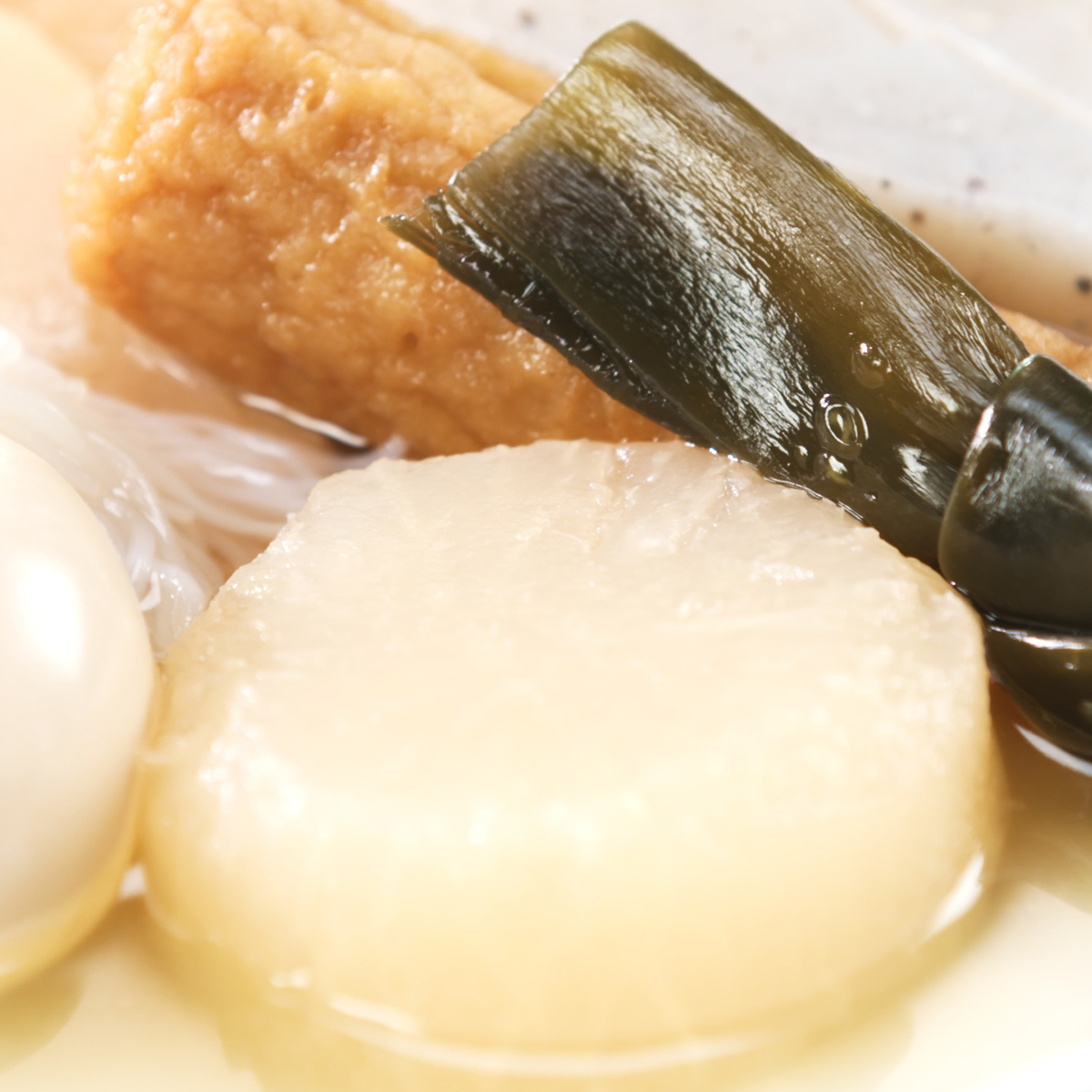 具材は海老真丈、魚真丈、大根、卵、結び白滝、昆布、ごぼう巻、こんにゃくの8種入り。それぞれの具材を活かした優しい味わいです