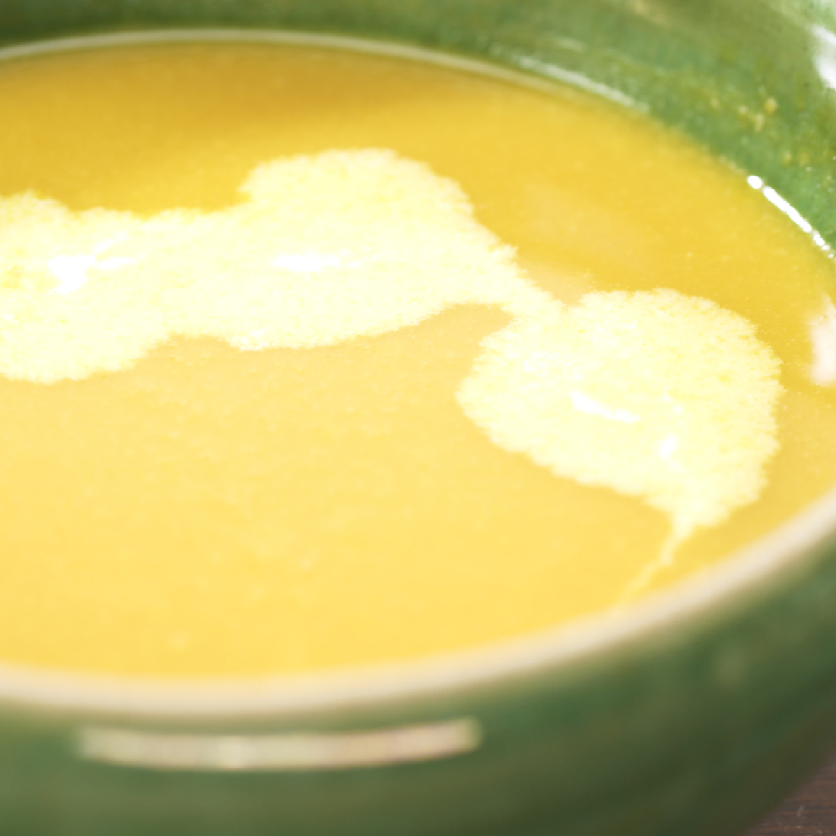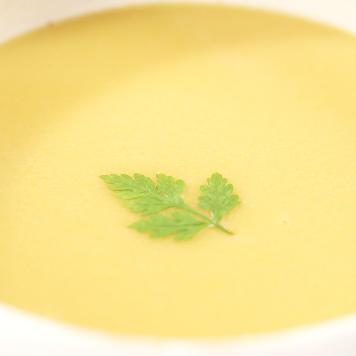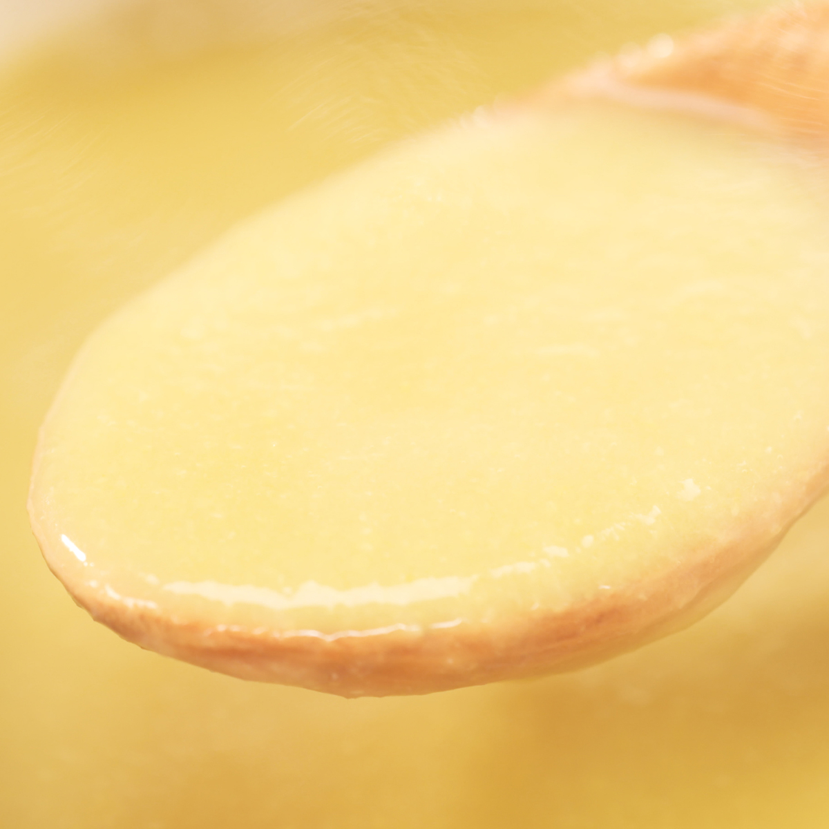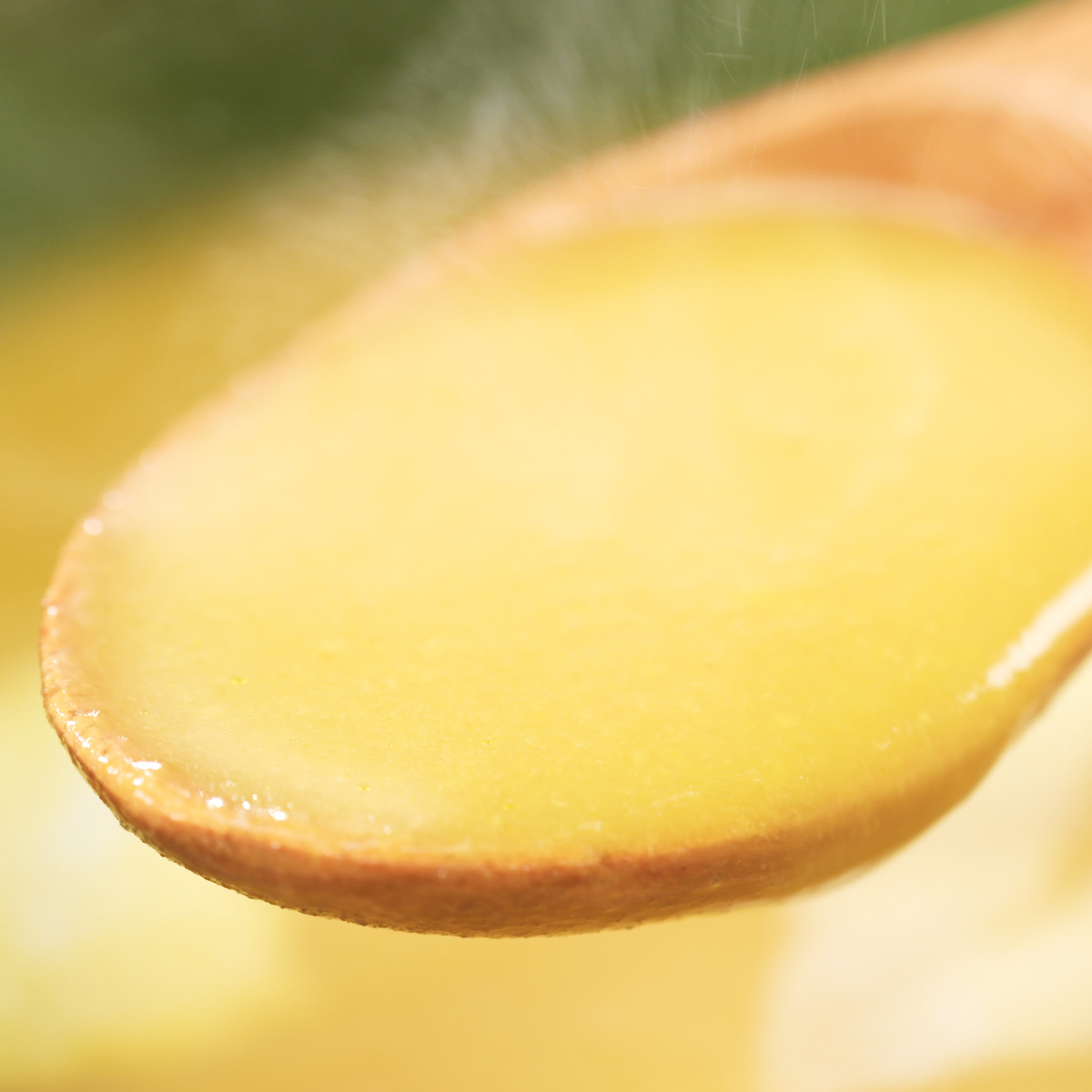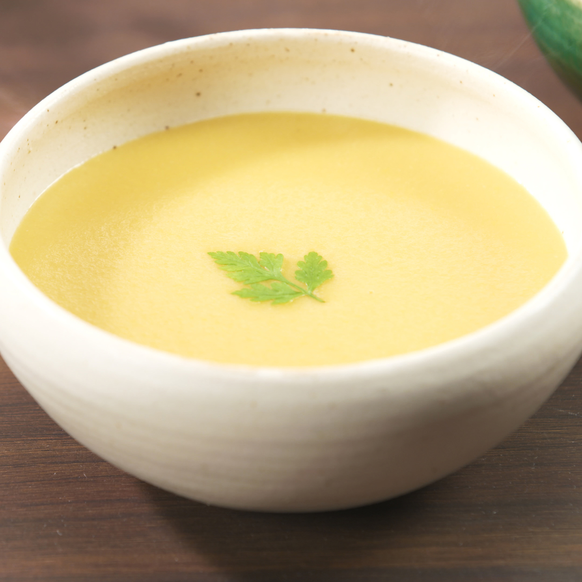 じゃがいもなどの野菜をすり潰し、昆布エキスや鰹節エキスなどで和の旨味を加えた、ポタージュ仕立ての和風スープです。日本の伝統調理法「すり流し*」をベースに、白味噌などの調味料を絶妙に組合せ、素材本来の味わいを活かしながら、コクのある濃厚な味に仕上げました。温めても冷しても美味しくお召し上がりいただけます