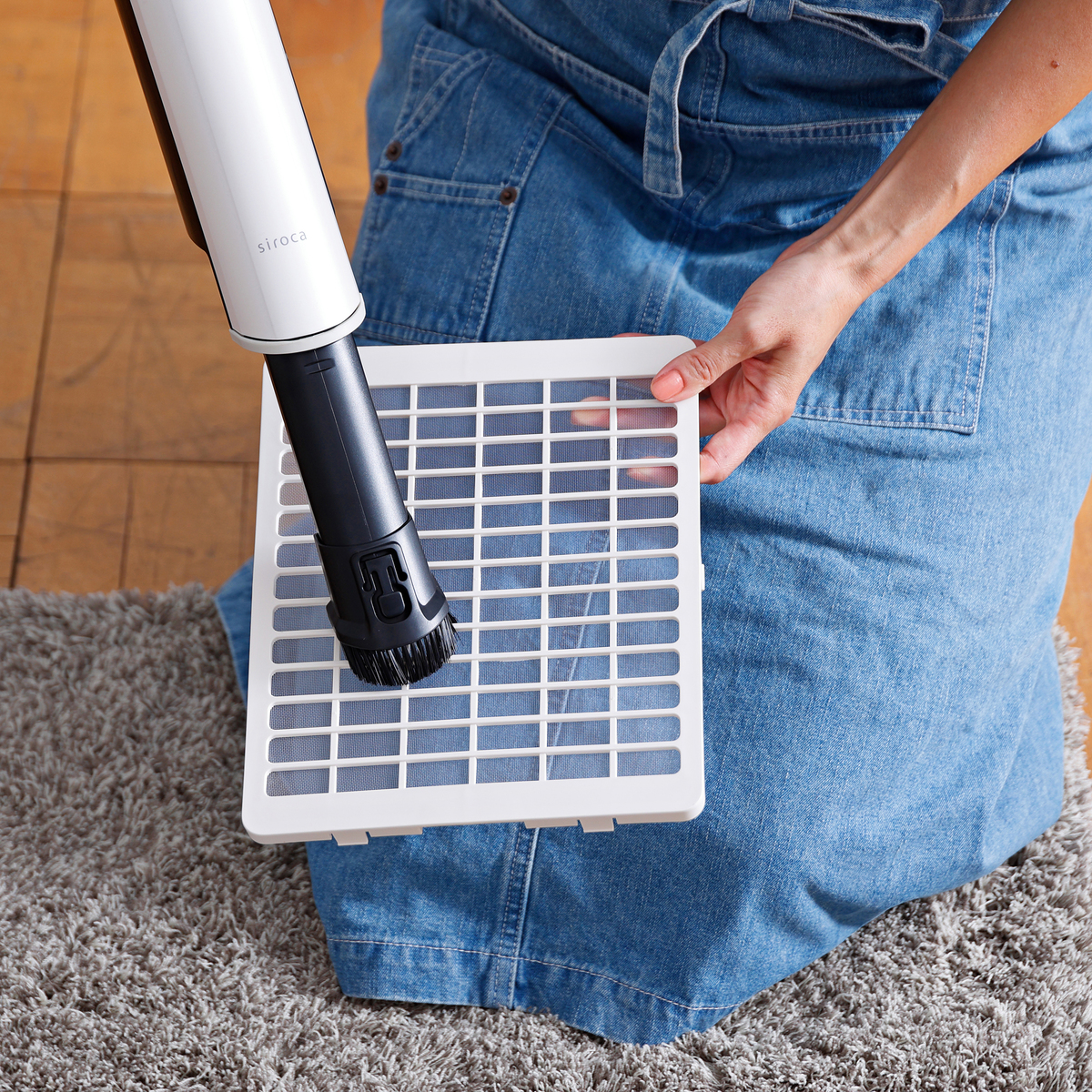 本体の前ガードは取り外し可能で、ホコリなど、反射板の汚れが気になるときにサッとお掃除でき、いつでも清潔にお使いいただけます**。背面のフィルターは、ネジなしで外せて水洗いに対応しています***