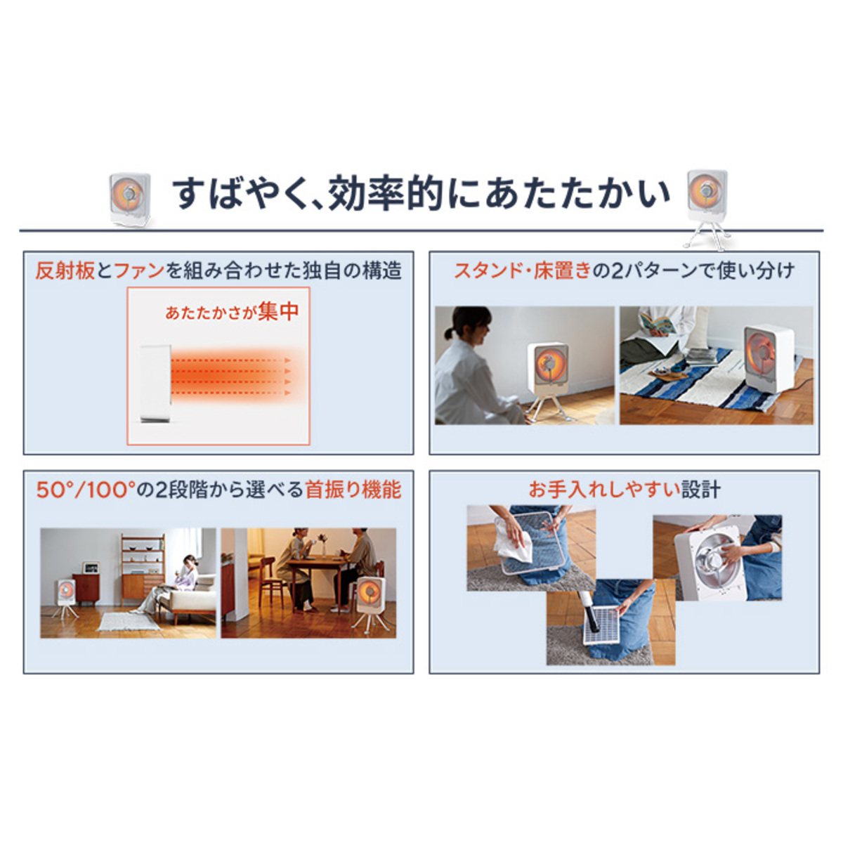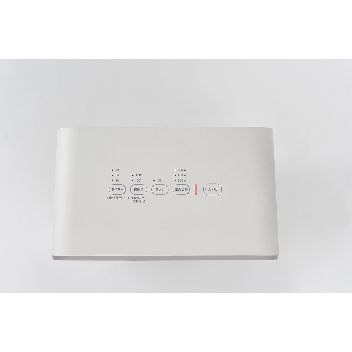 スタンドと床置きの2通りで設置でき、50度・100度の首振り運転やファンのON/OFF切替も可能です。出力は200W・400W・600Wの3段階に調整でき、シーンや用途に合わせて細かく使い分けられます