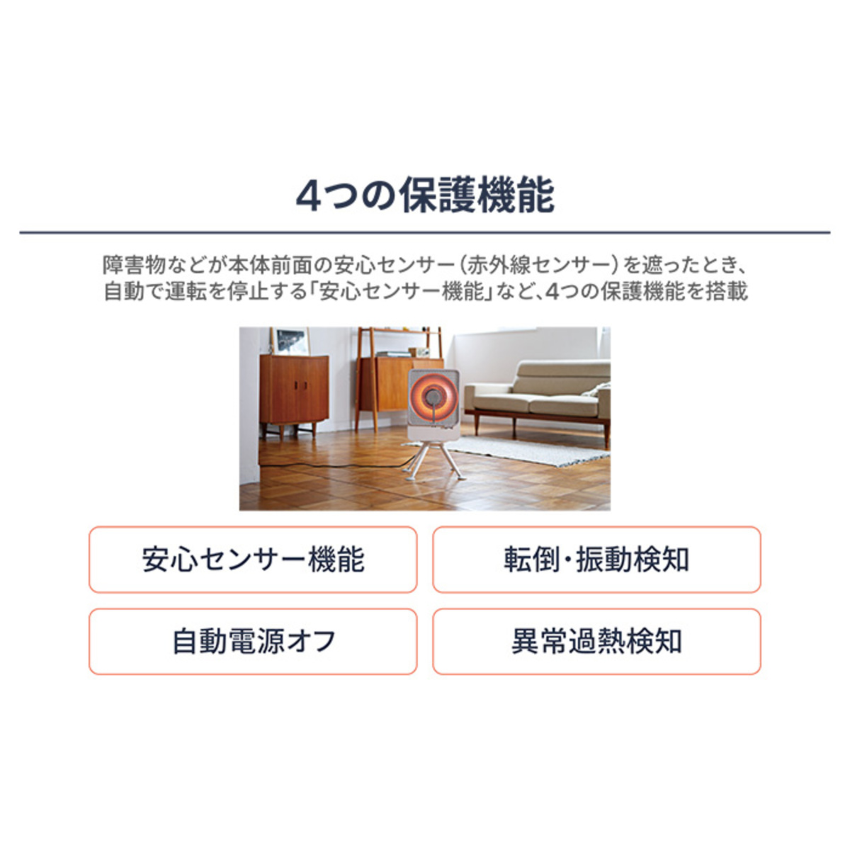 1・2・4時間の切タイマー機能付きで、設定時間が経過すると自動停止します。障害物などが本体前面の安心センサー(赤外線センサー)を遮ったとき、自動で運転を停止する機能や*、転倒・振動検知、異常過熱検知、自動電源オフなどの機能を備え、チャイルドロックも設定できます