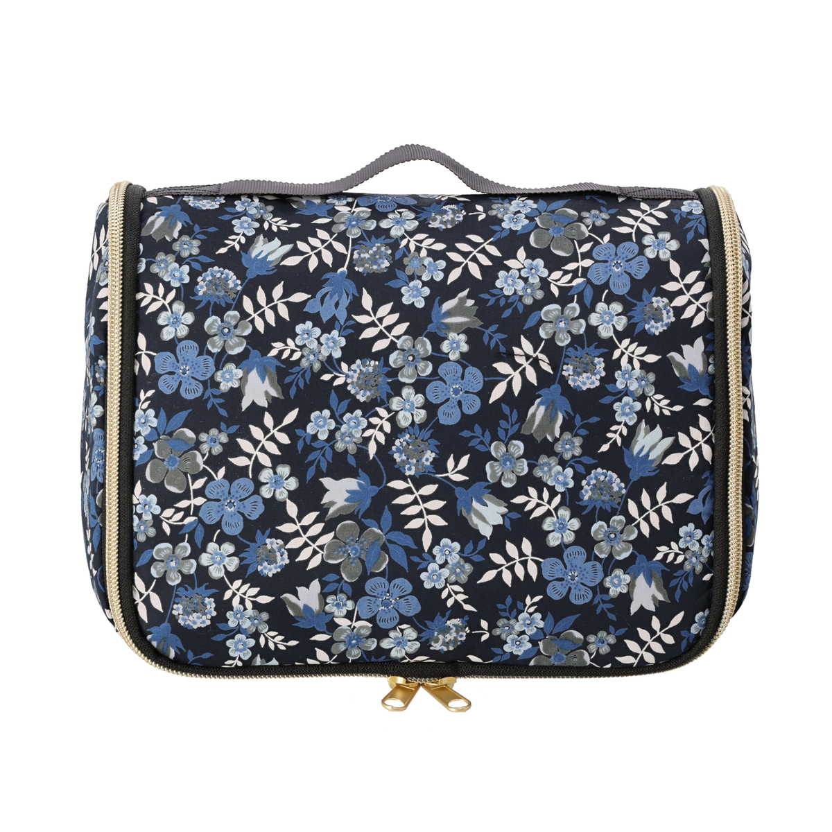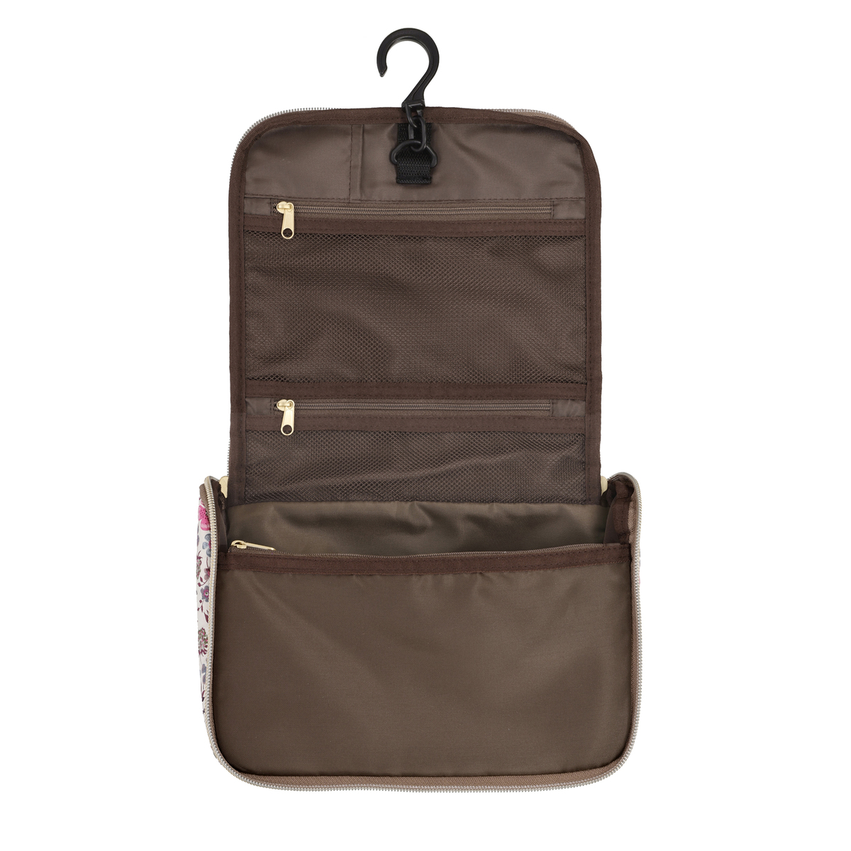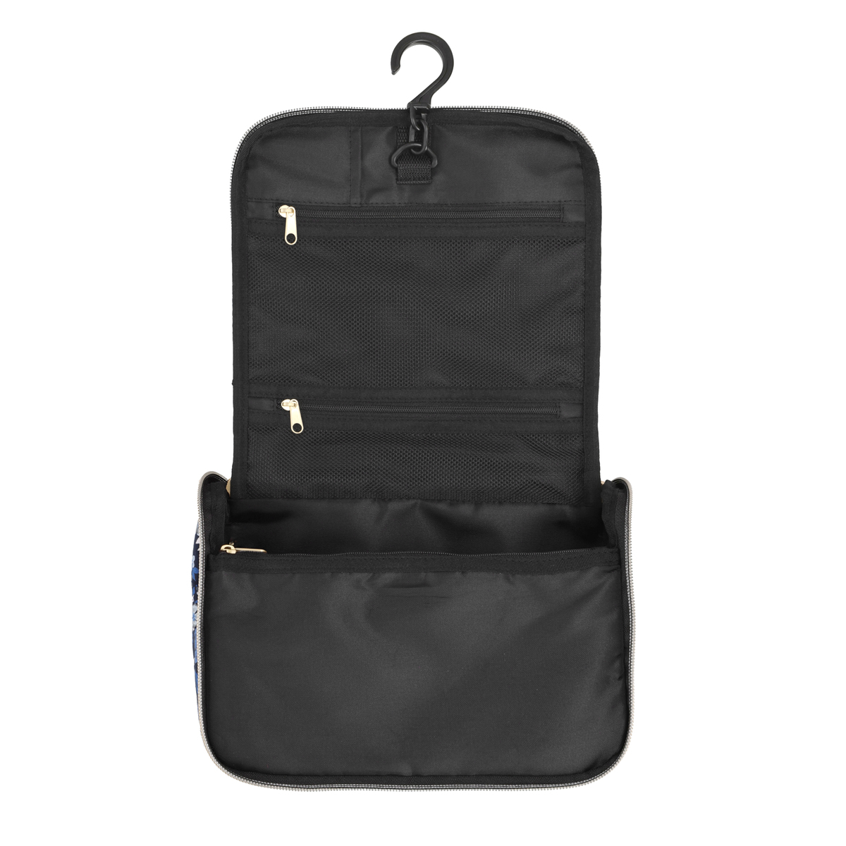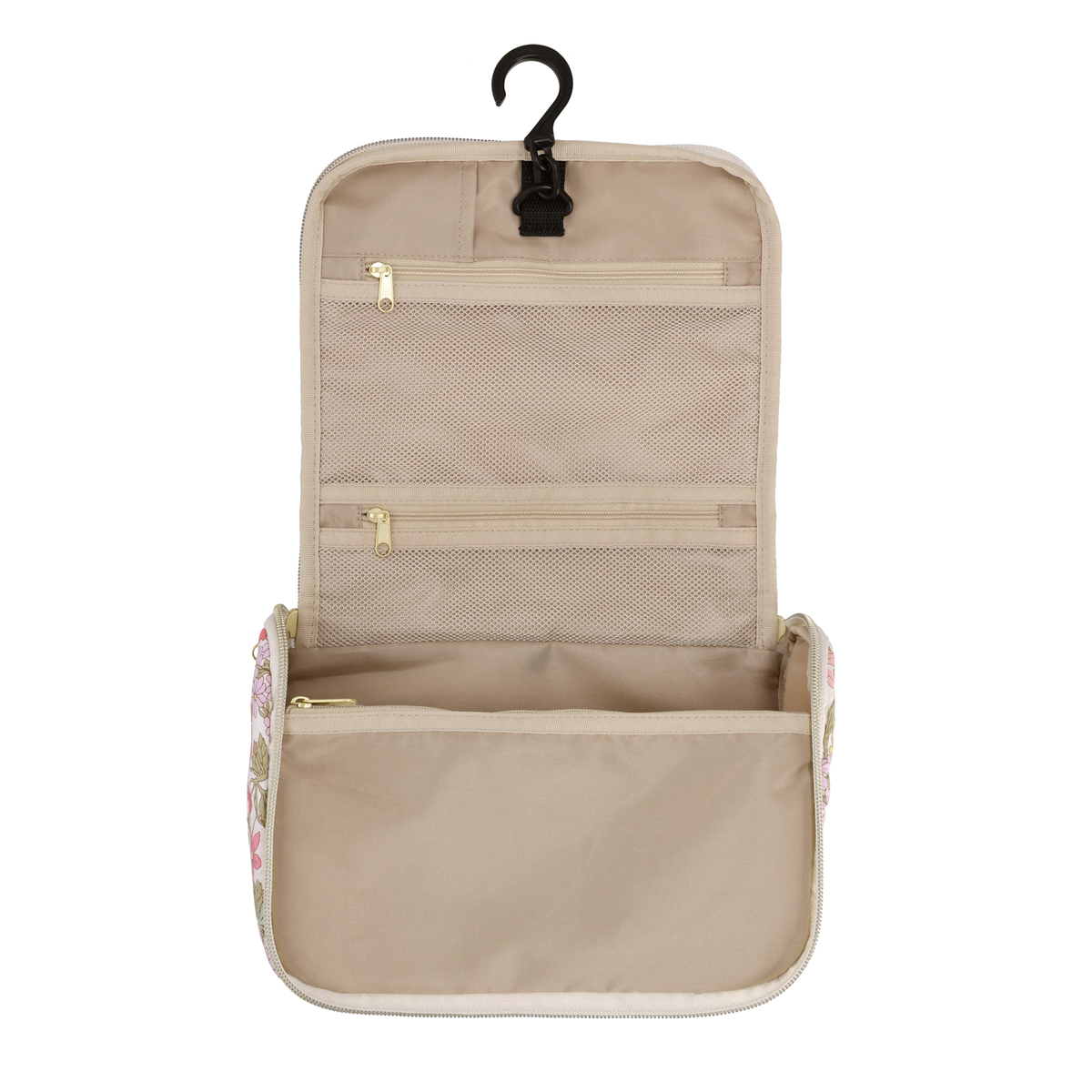 ファスナーを開くと縦長になり、S字フックでバスルームのタオル掛けなどに吊るせます。シャンプーや洗顔、化粧水などのボトルを立ててホールドできる、ゴム付きオープンポケットを備えています