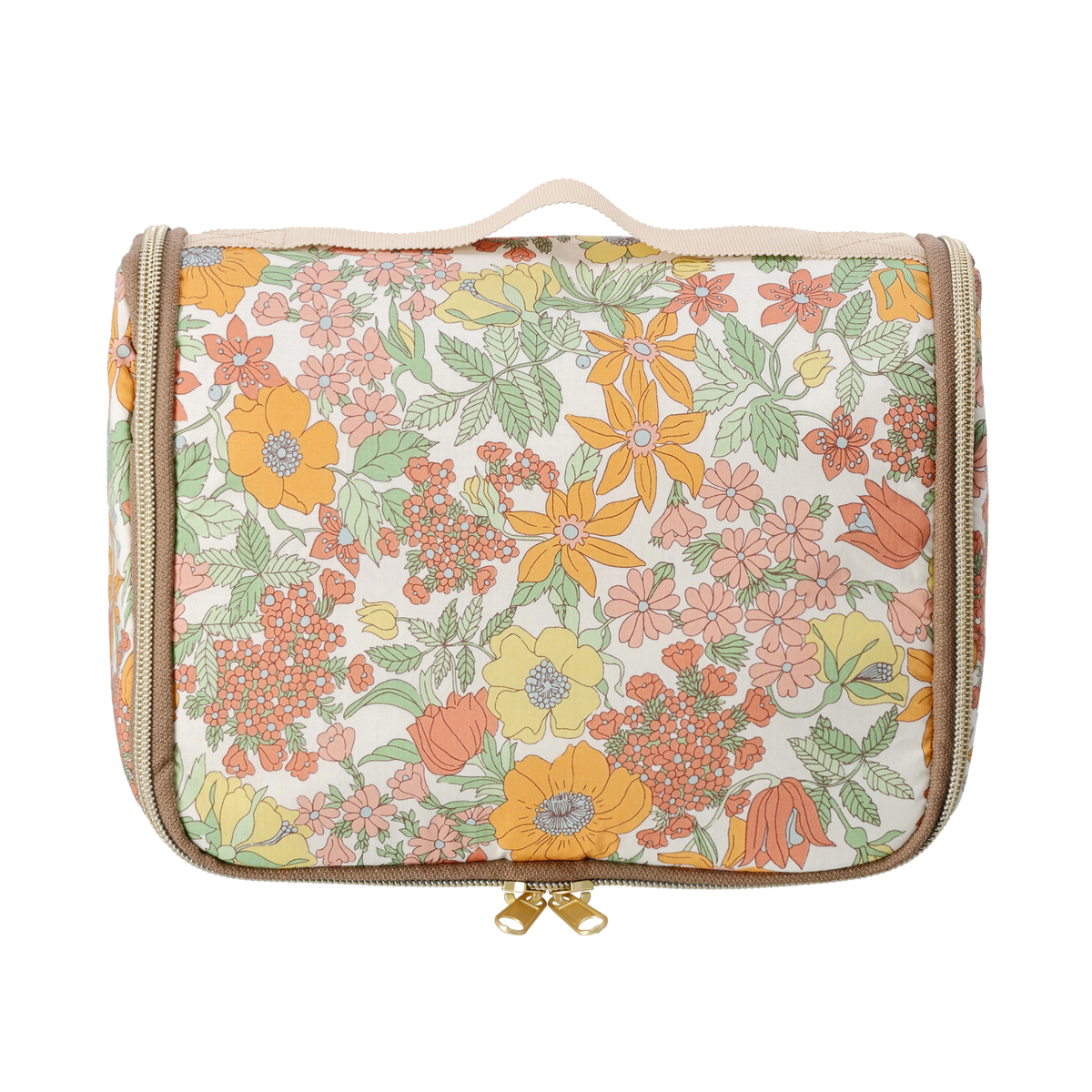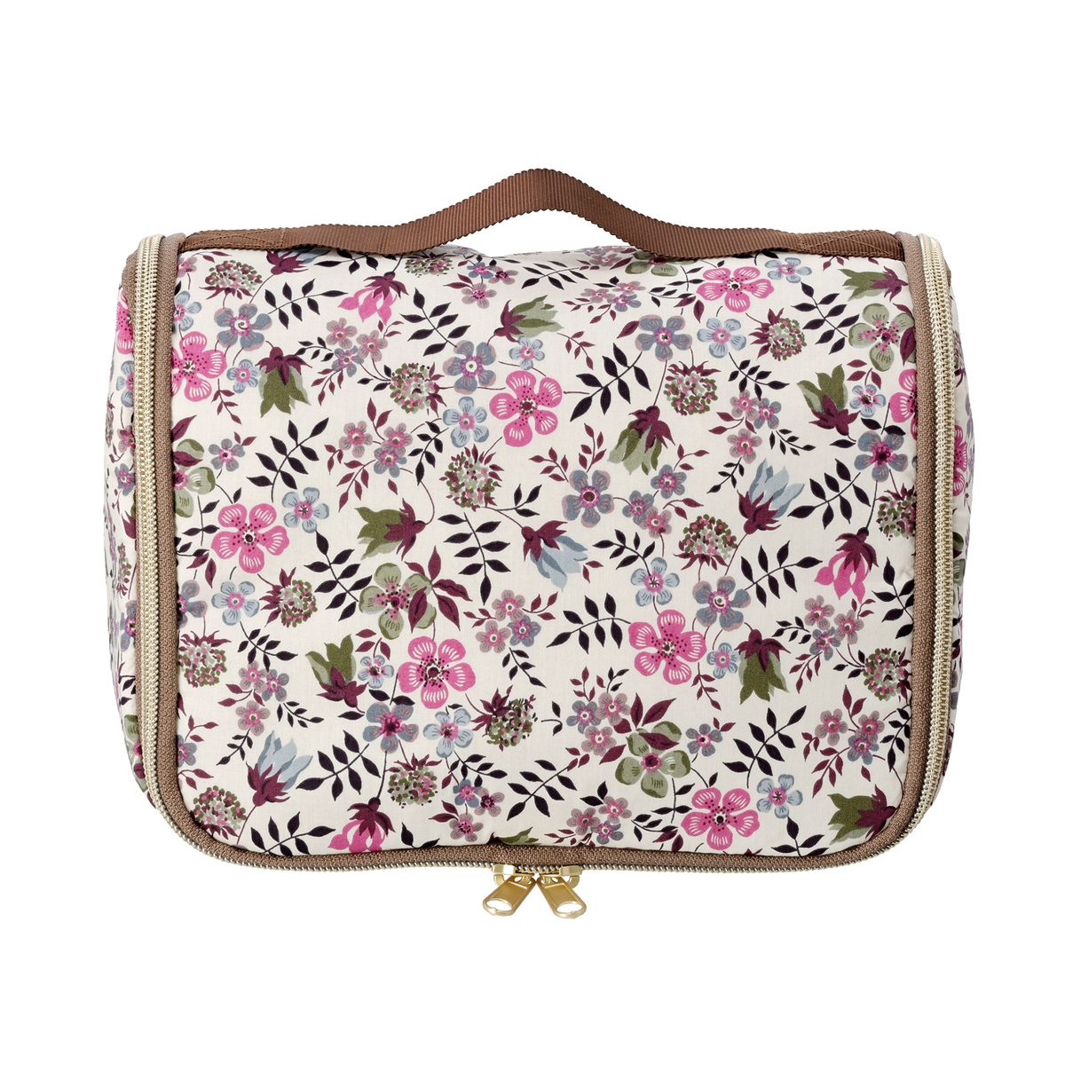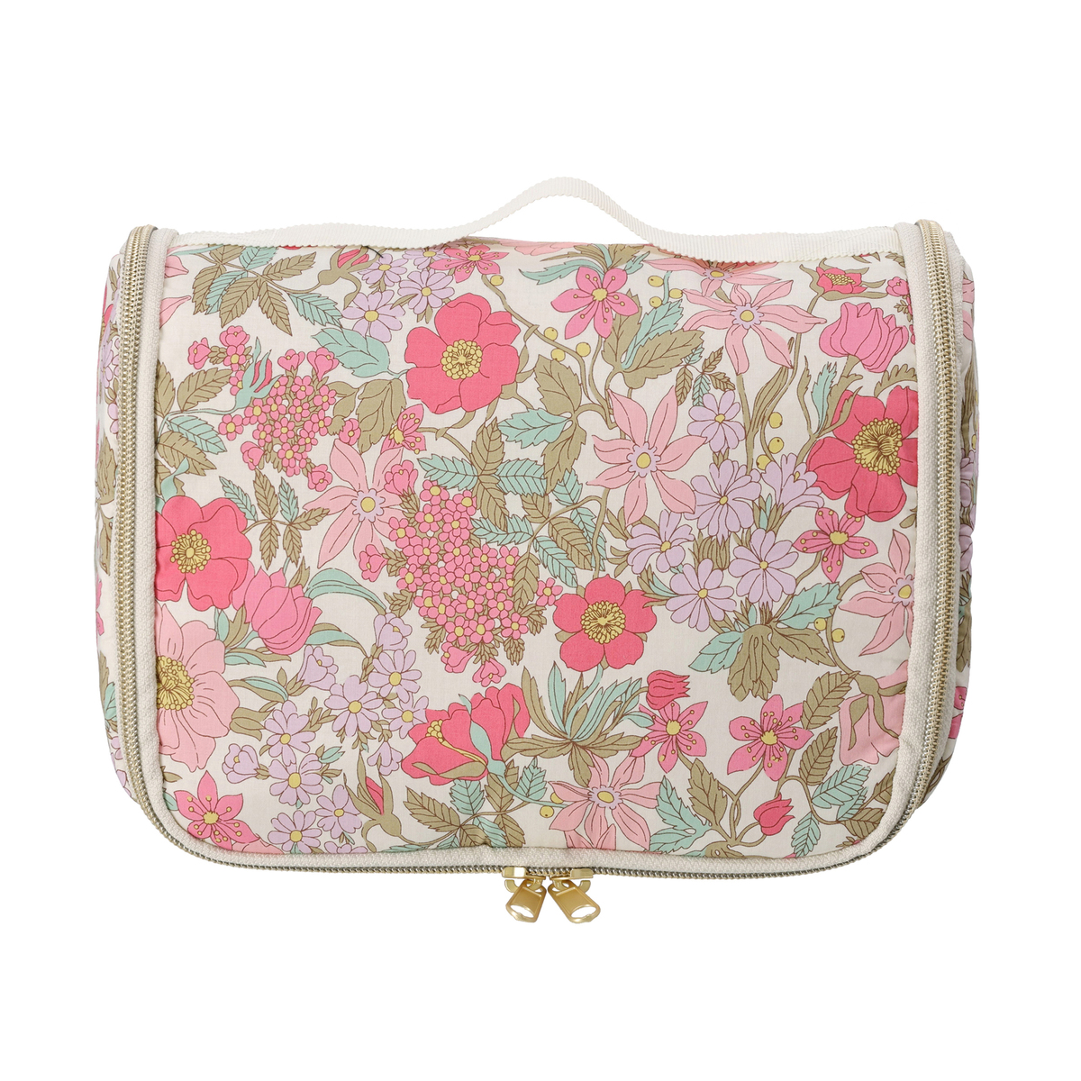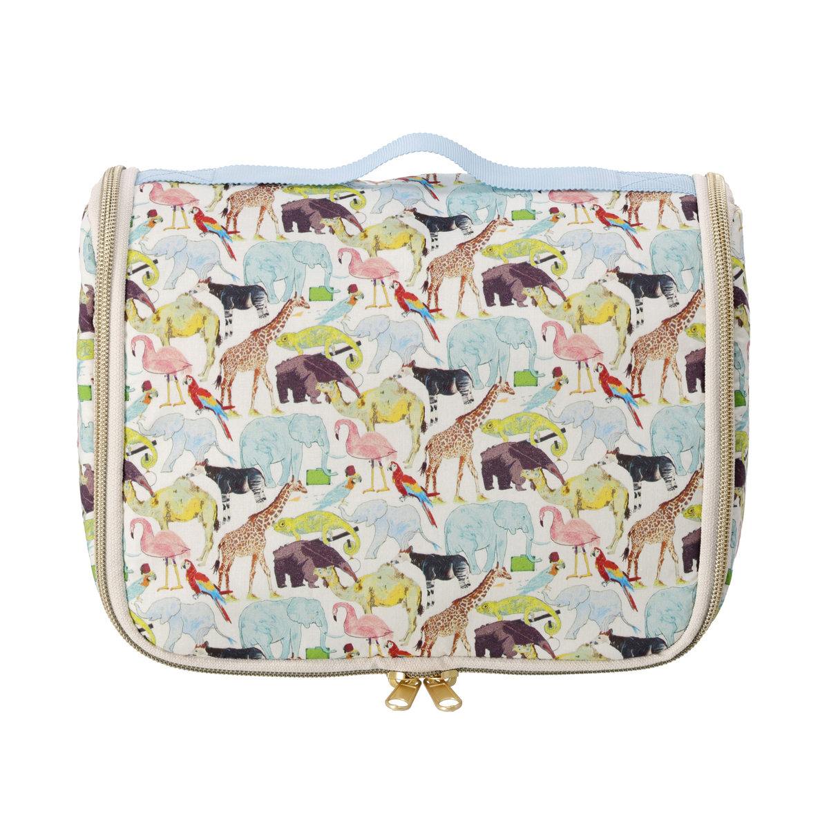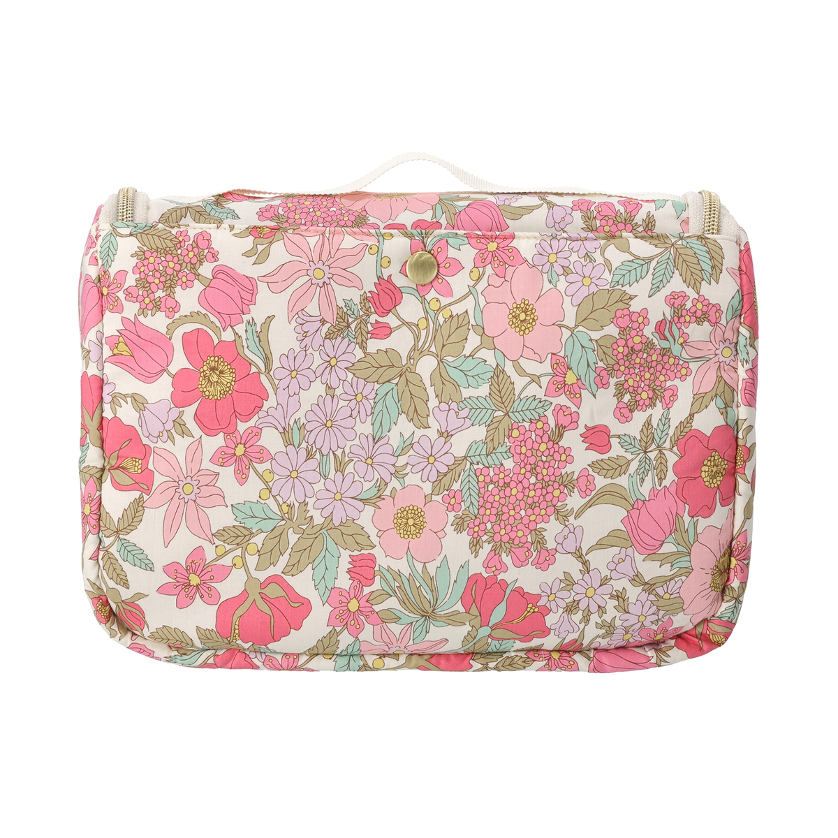 ファスナーを開くと縦長になり、S字フックでバスルームのタオル掛けなどに吊るせます。シャンプーや洗顔、化粧水などのボトルを立ててホールドできる、ゴム付きオープンポケットを備えています