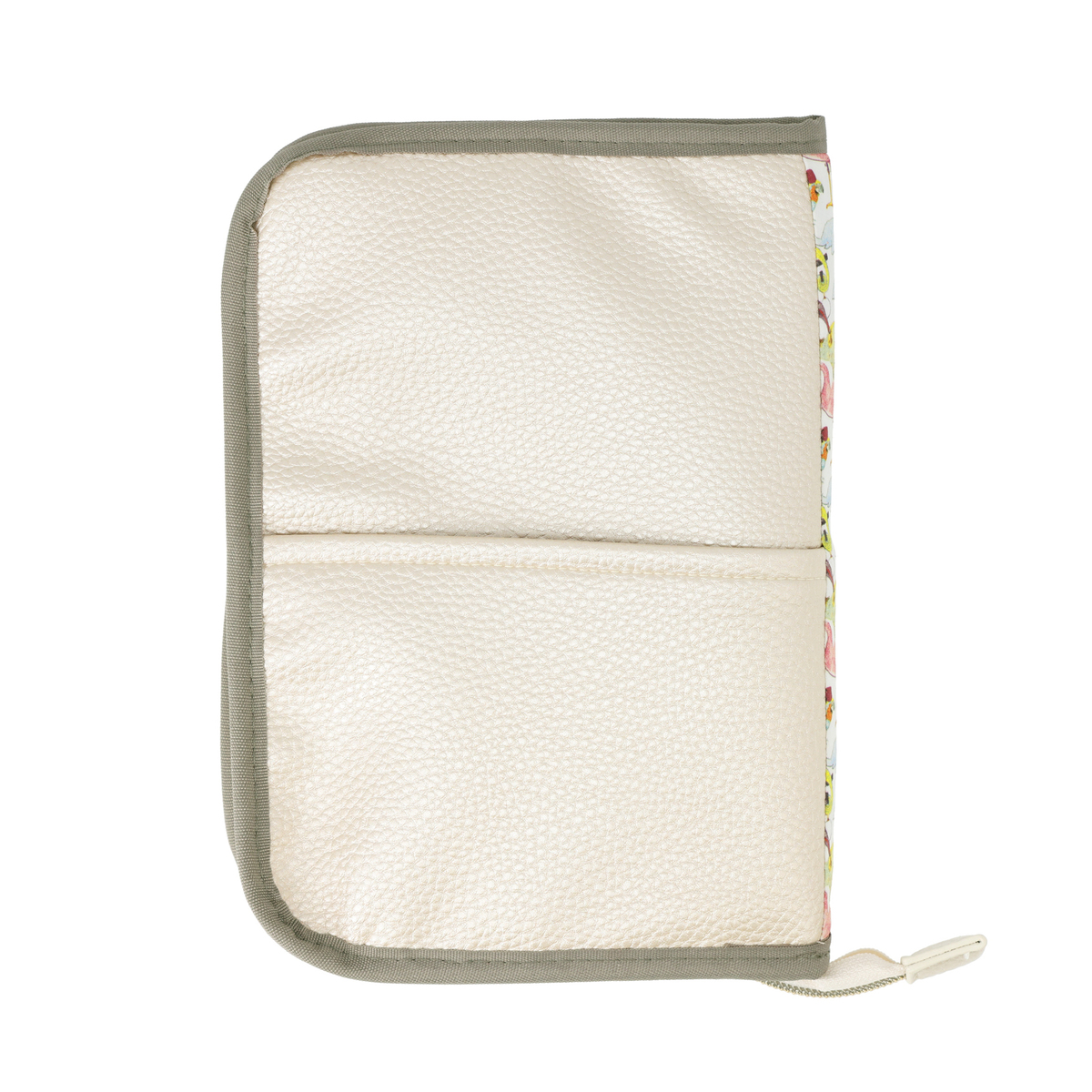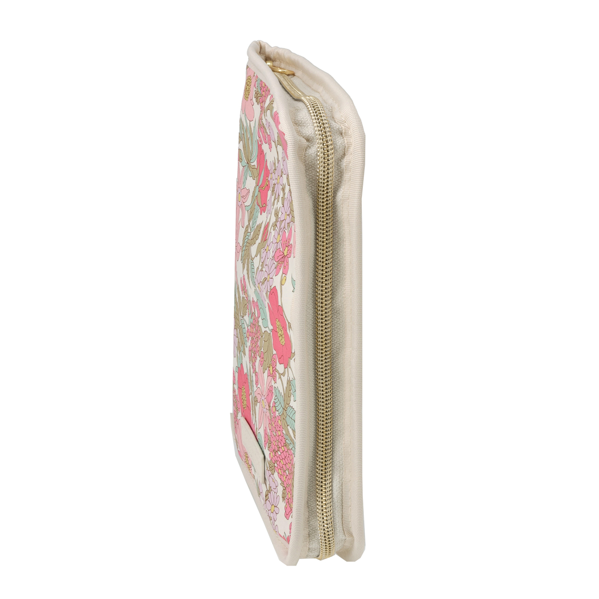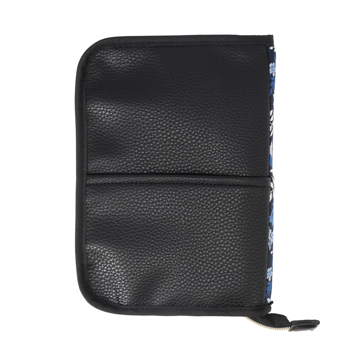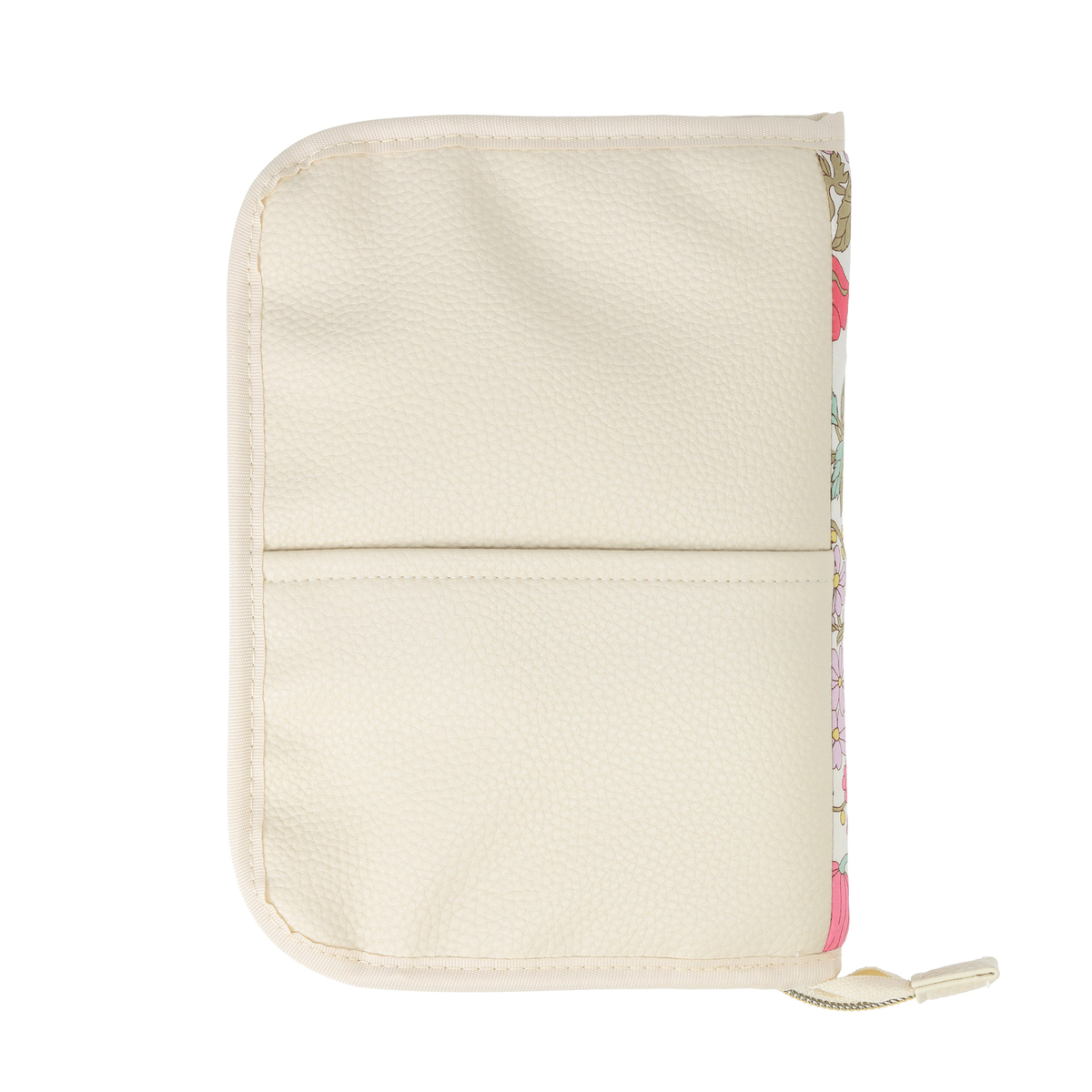 繊細で華やかなリバティプリントを使用したマルチケースです。パスポートや通帳、お薬手帳などが入るサイズ感。中央にファスナー付きポケットがあり、その前後は透明窓とオープンポケット仕様。他にも、メッシュのファスナーポケットやL字ポケットがあり、処方箋などを入れておくのに便利です