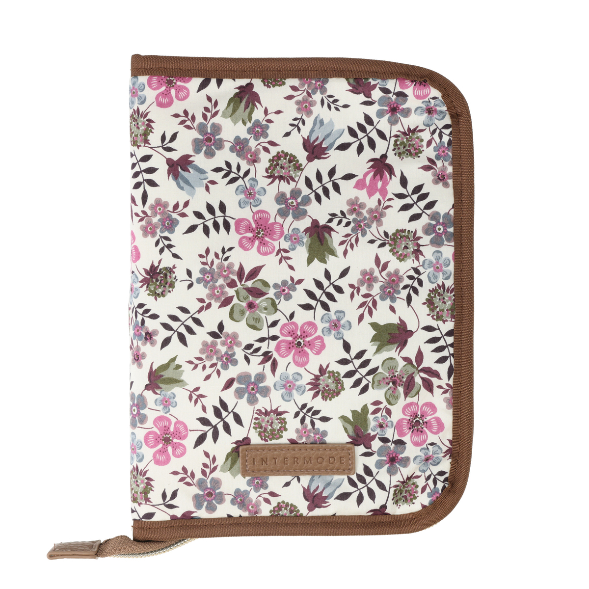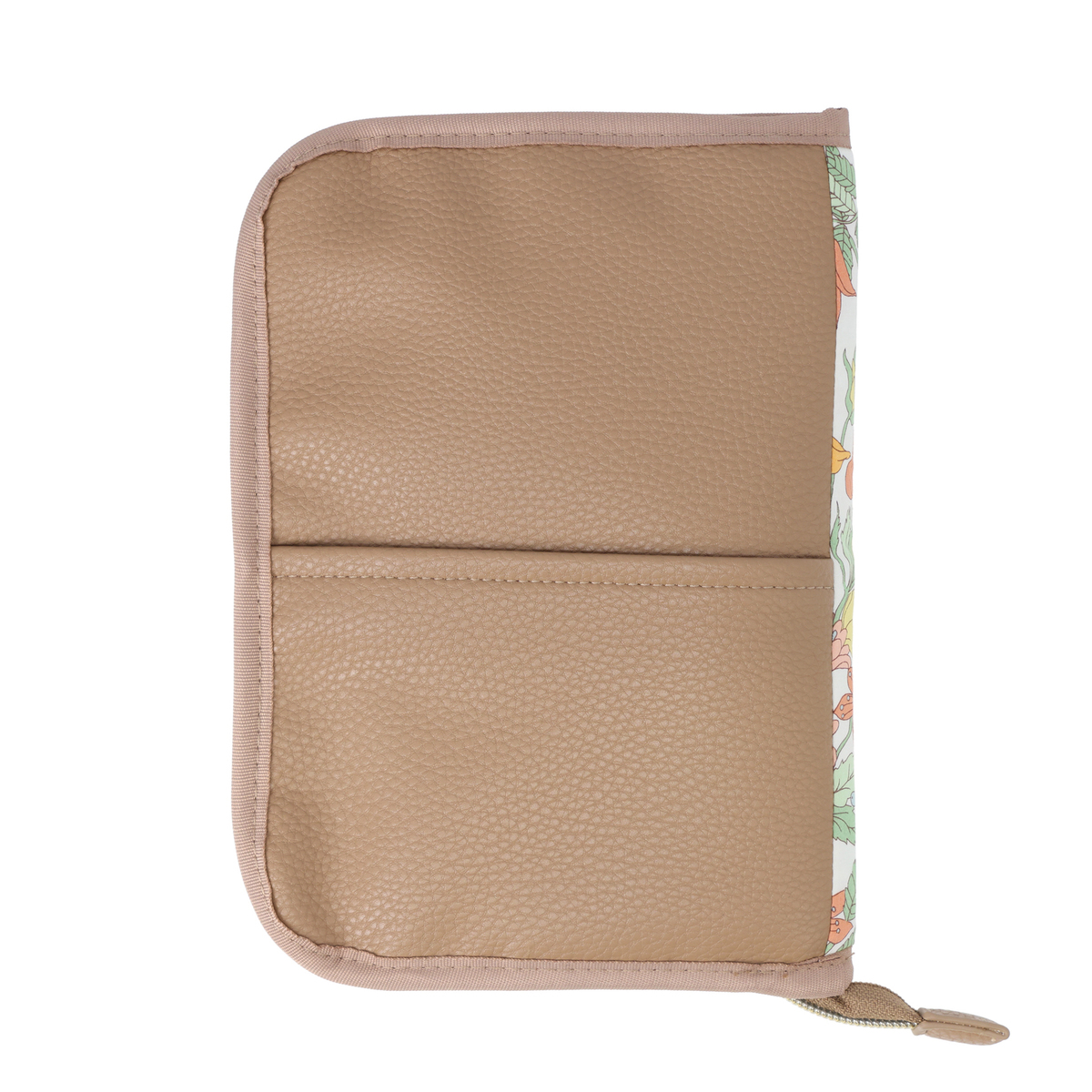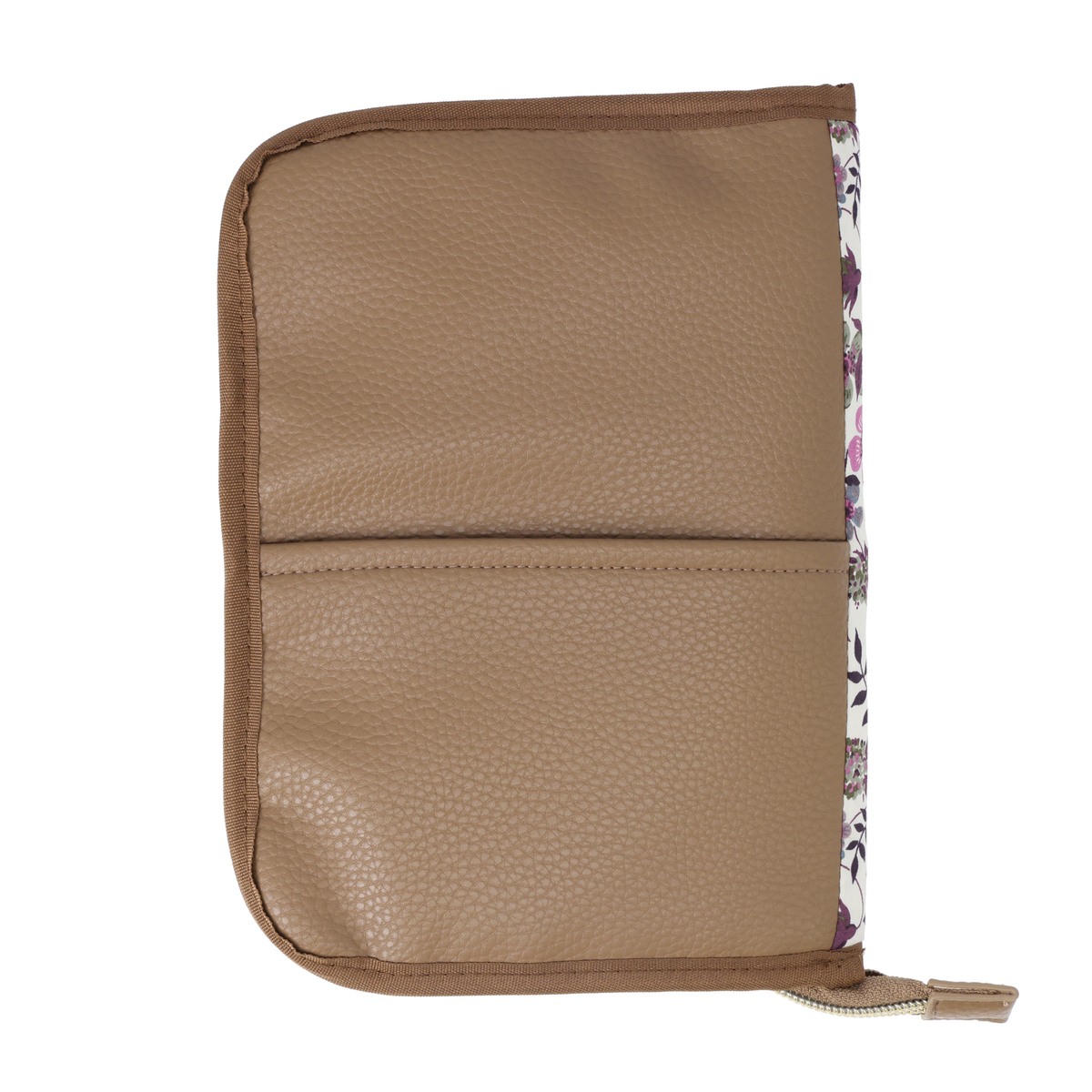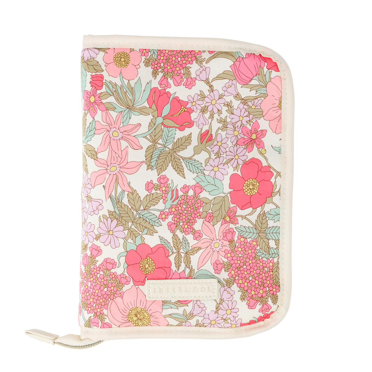 繊細で華やかなリバティプリントを使用したマルチケースです。パスポートや通帳、お薬手帳などが入るサイズ感。中央にファスナー付きポケットがあり、その前後は透明窓とオープンポケット仕様。他にも、メッシュのファスナーポケットやL字ポケットがあり、処方箋などを入れておくのに便利です