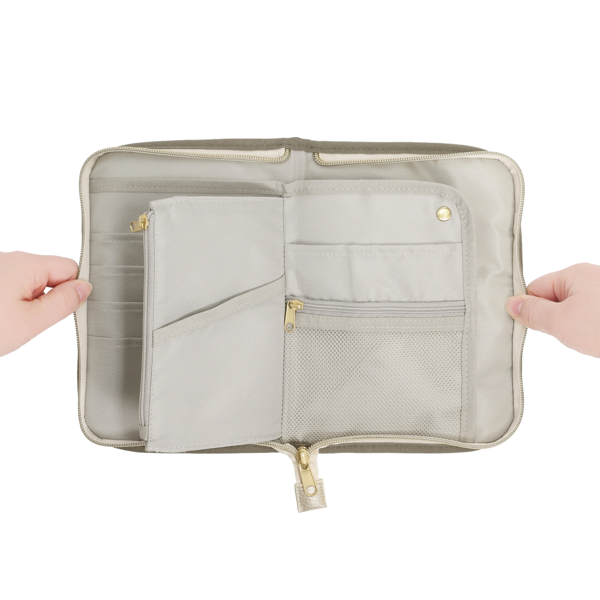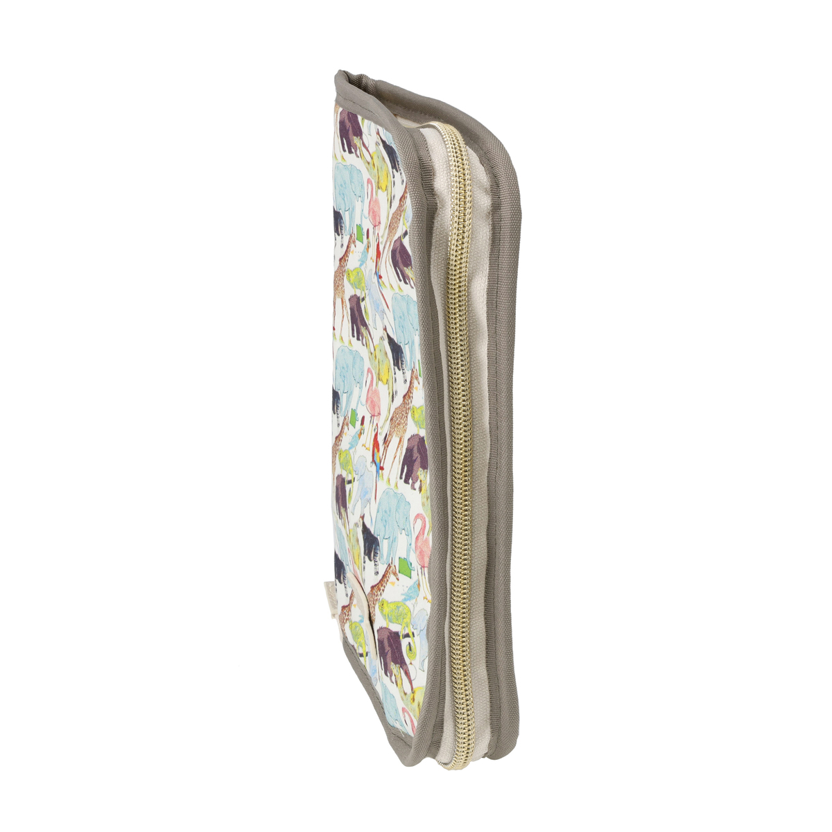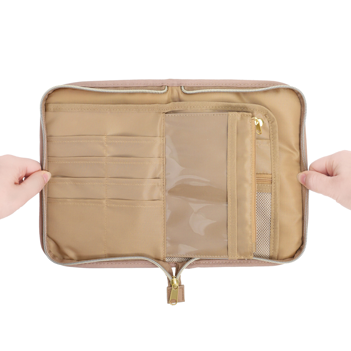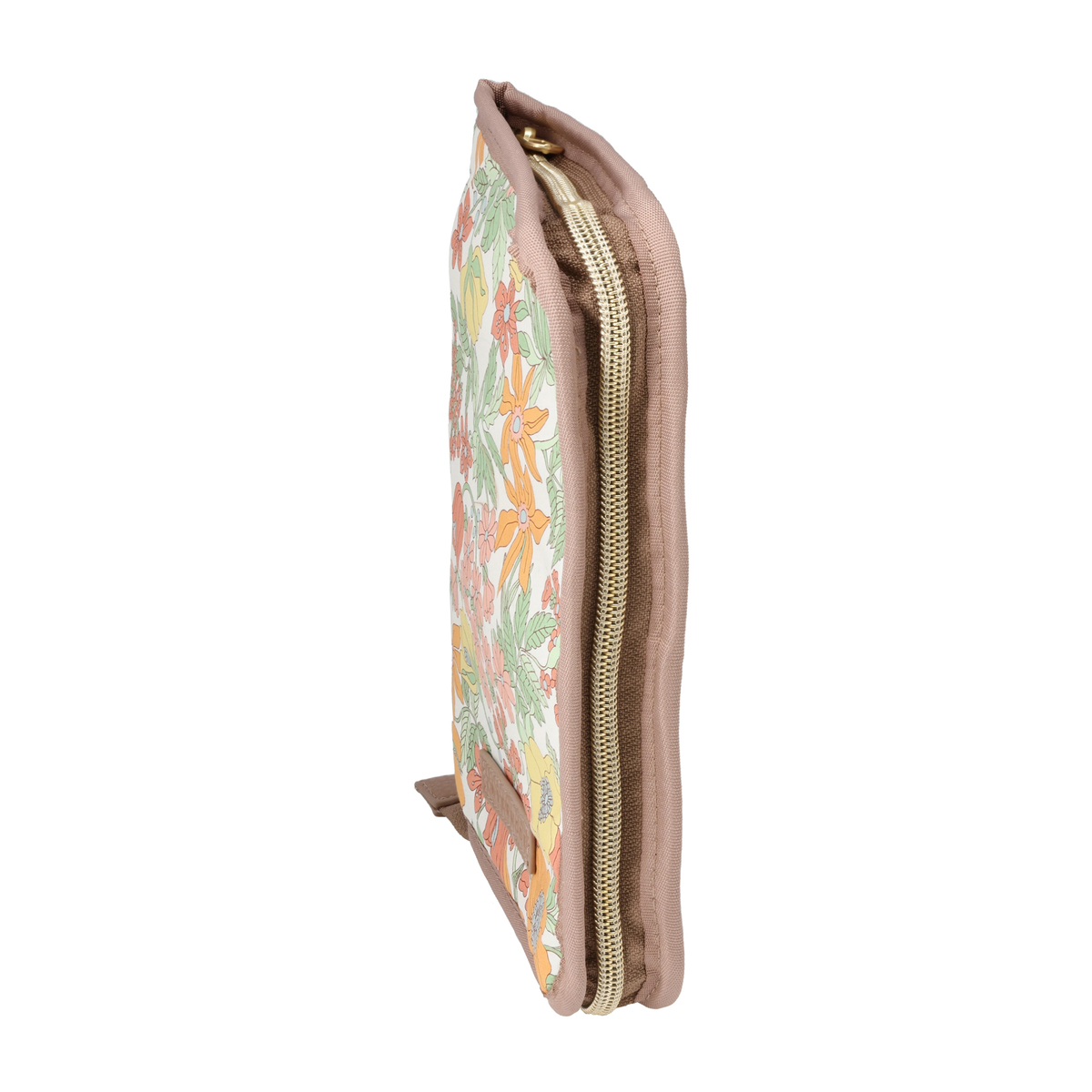 繊細で華やかなリバティプリントを使用したマルチケースです。パスポートや通帳、お薬手帳などが入るサイズ感。中央にファスナー付きポケットがあり、その前後は透明窓とオープンポケット仕様。他にも、メッシュのファスナーポケットやL字ポケットがあり、処方箋などを入れておくのに便利です