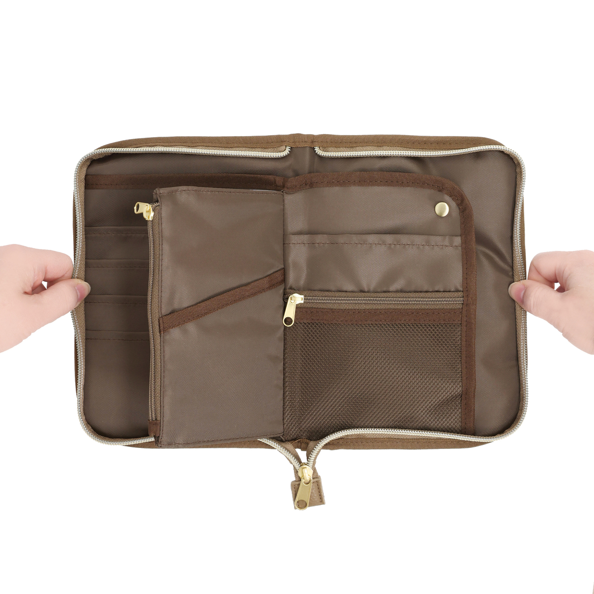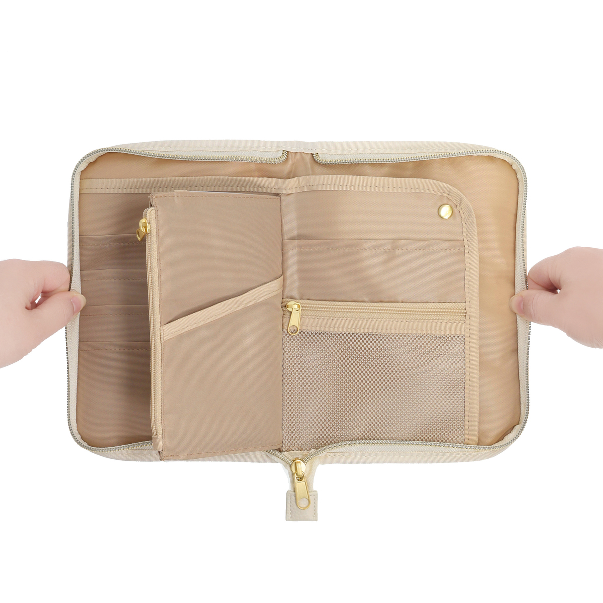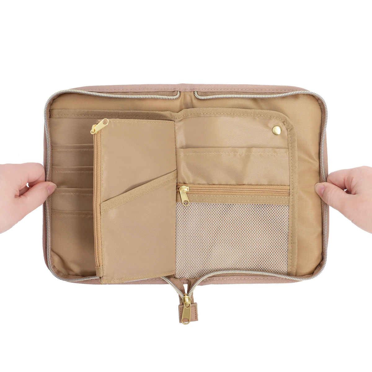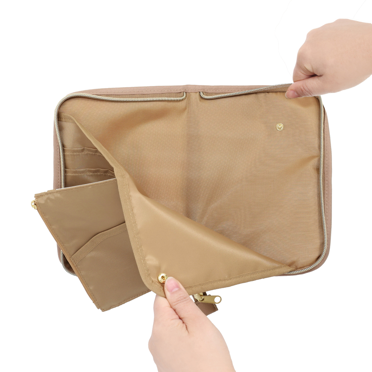 繊細で華やかなリバティプリントを使用したマルチケースです。パスポートや通帳、お薬手帳などが入るサイズ感。中央にファスナー付きポケットがあり、その前後は透明窓とオープンポケット仕様。他にも、メッシュのファスナーポケットやL字ポケットがあり、処方箋などを入れておくのに便利です