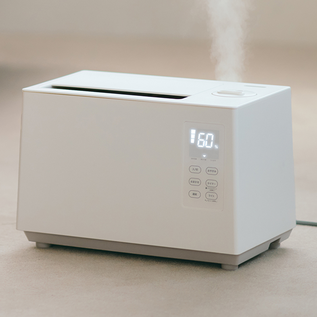 2・4・6・8時間の4段階に設定できる切タイマー機能や、無操作で10時間経過すると自動的に運転を停止する自動電源オフ機能付き。ミストが高く上がるように設計しているため床が濡れにくい工夫もポイント。アロマオイル(精油)対応で香りも楽しめます(*2)