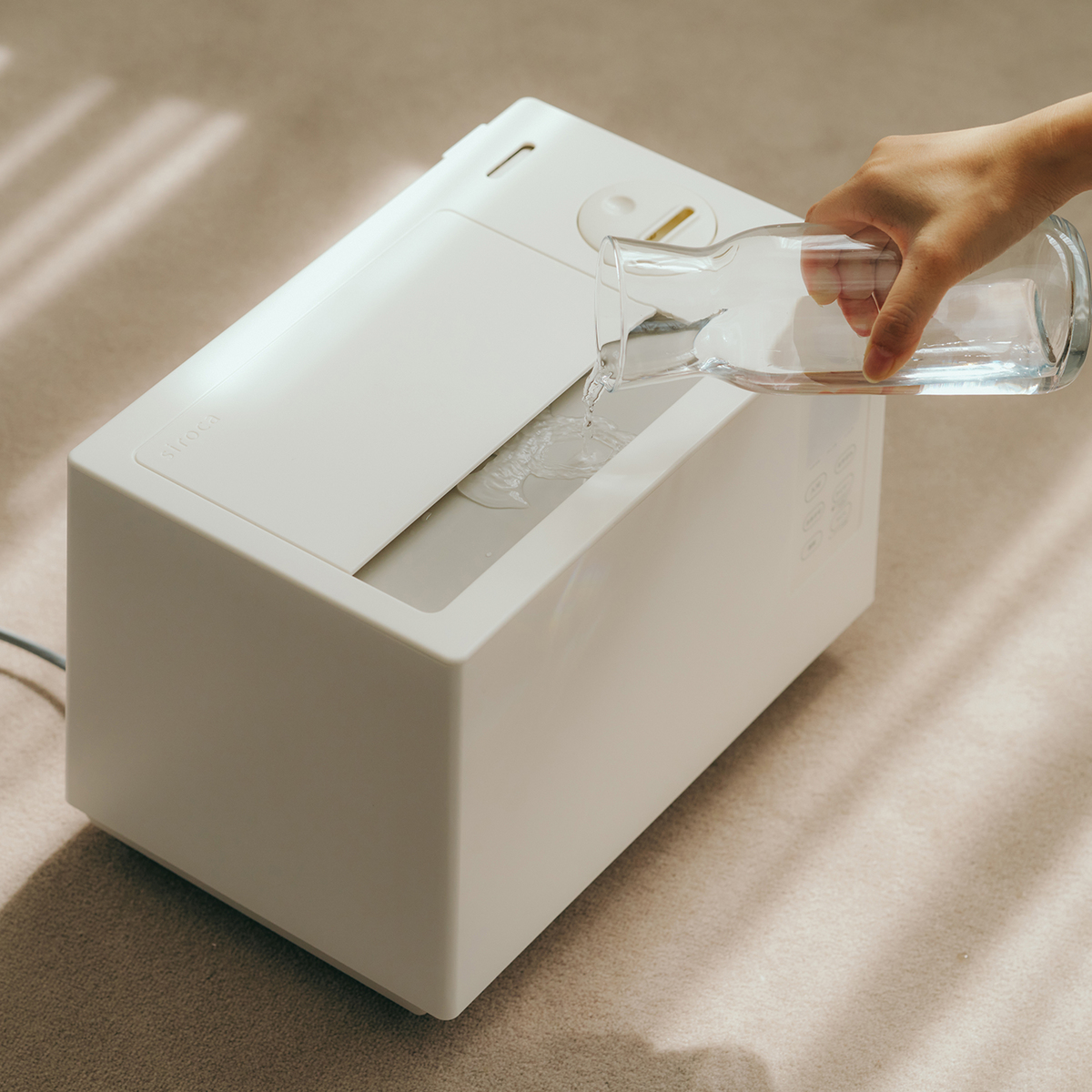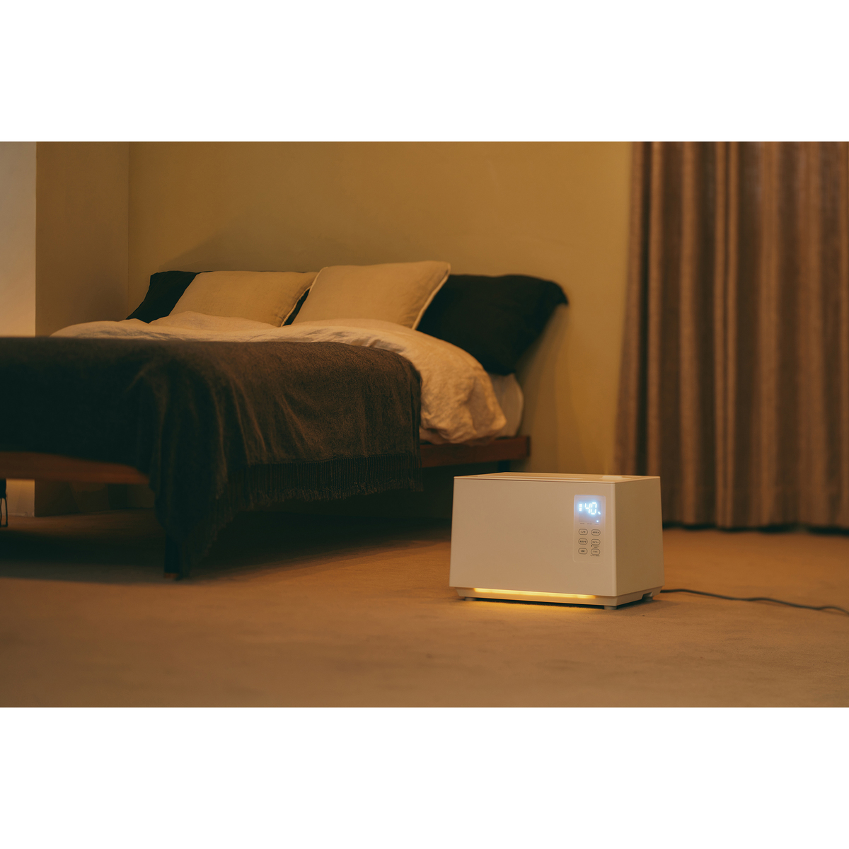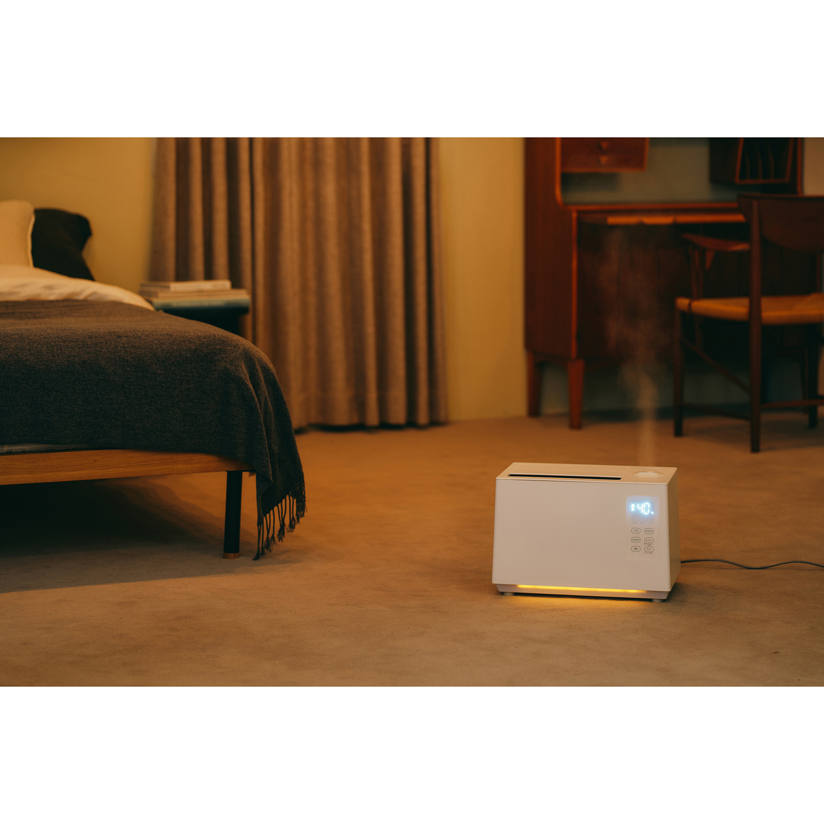 おまかせ・連続・おやすみなど複数の運転モードを搭載。上部給水式のため、タンクを持ち運ばずラクに水を注げます。寝室など暗い部屋で使う際は、間接照明代わりとしても活躍するフットライトも備えています