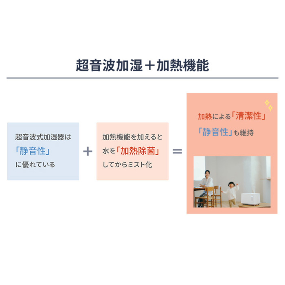 ヒーターで水を約75℃に加熱除菌(*1)した温水をミスト化して放出する加熱超音波式加湿器。吹き出し口から放出されるミストは50℃程度のぬくもりミストです。適用床面積(目安)は、木造和室で約8.5畳(14平米)、プレハブ洋室で約14畳(23平米)です