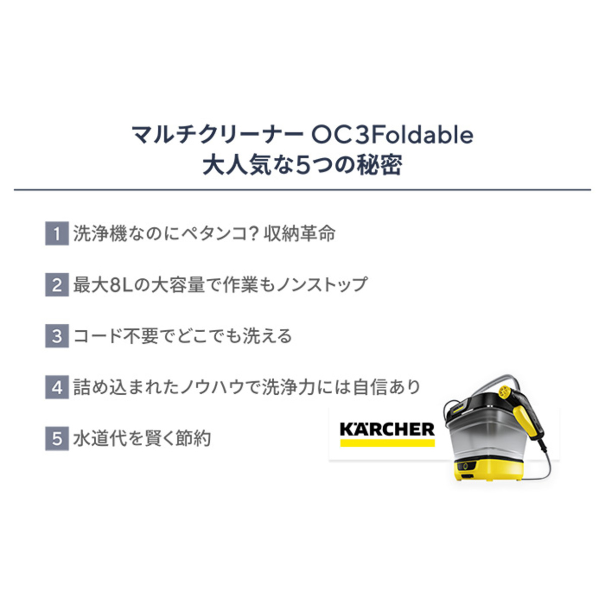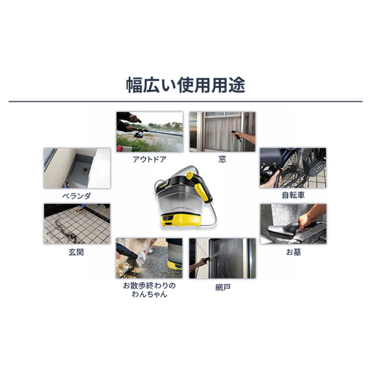 [商品内容] ・本体 ・充電 USB ケーブル(Type A to C) ・充電アダプター [サイズ] 長さ29.8×幅30.5×収納状態高さ10.8/展開状態高さ27.1cm [重量] 2200g [給水タンク容量] 8L [充電時間] 約2.5時間 [連続使用時間(満充電時)] 約15分 [使用方法] 1.本体を充電する 充電アダプターをコンセントに差し込み、充電USBケーブルのUSB-A端子を接続します 本体の充電用差込口キャップを取り外し、充電USBケーブルのUSB-C端子を差し込みます 充電ランプの点滅パターンで充電状況を確認できます 充電完了まで約2.5時間です。充電完了後、10分経過すると充電ランプは消灯します 2.給水タンクに水を入れる タンクリッドを取り外し、ハンドルを起こして給水タンクを展開します トリガーガンを取り出します 水をMAXラインまで入れます。タンク容量は8Lで、40℃までのお湯も使用可能です タンクリッドの切り欠きにホースを収め、しっかりと閉めます 4.電源をオンにする 電源スイッチを押します。運転状態ランプが点灯します バッテリー満充電時の連続使用時間は約15分です 5.洗浄を始める トリガーガンの黄色のグリップを握ると、ノズルから水が噴射されます 6.洗浄を停止する トリガーガンの黄色のグリップを放すと、水が止まります 30分以上操作がない場合、本体の電源が自動的にオフになります 7.洗浄が終わったら 電源をオフにする 電源スイッチを押します。運転状態ランプが消灯します 水を捨てる タンクリッドを取り外し、ハンドルと本体をしっかりと保持して水を捨てます 再度電源をオンにする 水抜きをする トリガーガンの黄色のグリップを握り、本体ポンプ・ホース内に残っている水を抜きます。水が出なくなるまでグリップを握り続けてください 電源をオフにする ホース内の圧抜きをする 電源オフの状態でトリガーガンの黄色のグリップを握り、ホース内に残っている圧力を抜きます トリガーガンを本体に収納する ホースをまとめ、本体にトリガーガンを収納します。 給水タンクを畳む 給水タンクの縁を両手で押し下げて畳み、タンクリッドを取り付けます ■取り扱い説明を充分にご確認の上、ご使用下さい 【中国製】 [注意事項] ※給水タンクには、溶剤や溶剤を含む液体、酸性の液体(洗浄剤、ガソリン、塗料用シンナーやアセトン)など、水以外のものを入れないこと ※警告(火災・爆発・疾患・ケガ・ヤケドの原因となります) ※火気や暖房器具のそば、爆発物や可燃性ガスの近くで使用しないこと ※高温・多湿の場所で使用しないこと ※本製品の電源を入れたまま放置しないこと ※本製品を落とした場合や目に見える破損または水漏れがある場合は使用しないこと ※水を本体に直接かけたり水没させたりしないこと ※濡れた手で充電アダプターや充電用差込口に触らないこと ※ドライバーなどの金属を、充電用差込口に接触させないこと ※注意(本体の変形・ショート・水漏れや、思わぬ事故・ケガの原因となります) ※0℃以下の環境で使用しないこと ※給水タンクには、溶剤や溶剤を含む液体、酸性の液体(洗浄剤、ガソリン、塗料用シンナーやアセトン)など、水以外のものを入れないこと ※給水タンクに水が入っていることを確認してから電源を入れること ※水が出ない状態で、本製品を2分以上作動させないこと ※本製品を使用するときは、しっかりとした平らな場所に安定させて置くこと ※清水のみを使用すること ※本体から離れる際は電源をオフにすること ※警告(火災・爆発・疾患・ケガ・ヤケドの原因となります) ※火気や暖房器具のそば、爆発物や可燃性ガスの近くで使用しないこと ※高温・多湿の場所で使用しないこと ※本製品の電源を入れたまま放置しないこと ※本製品を落とした場合や目に見える破損または水漏れがある場合は使用しないこと ※水を本体に直接かけたり水没させたりしないこと ※濡れた手で充電アダプターや充電用差込口に触らないこと ※ドライバーなどの金属を、充電用差込口に接触させないこと ※注意(本体の変形・ショート・水漏れや、思わぬ事故・ケガの原因となります) ※0℃以下の環境で使用しないこと ※給水タンクには、溶剤や溶剤を含む液体、酸性の液体(洗浄剤、ガソリン、塗料用シンナーやアセトン)など、水以外のものを入れないこと ※給水タンクに水が入っていることを確認してから電源を入れること ※水が出ない状態で、本製品を2分以上作動させないこと ※本製品を使用するときは、しっかりとした平らな場所に安定させて置くこと ※清水のみを使用すること ※本体から離れる際は電源をオフにすること
