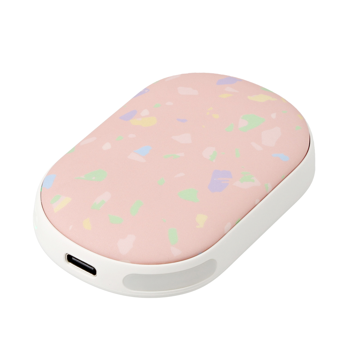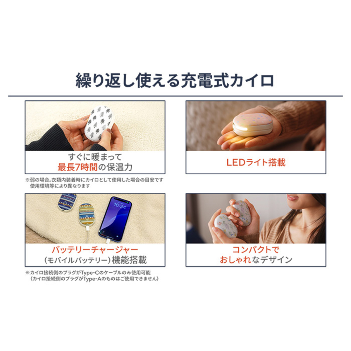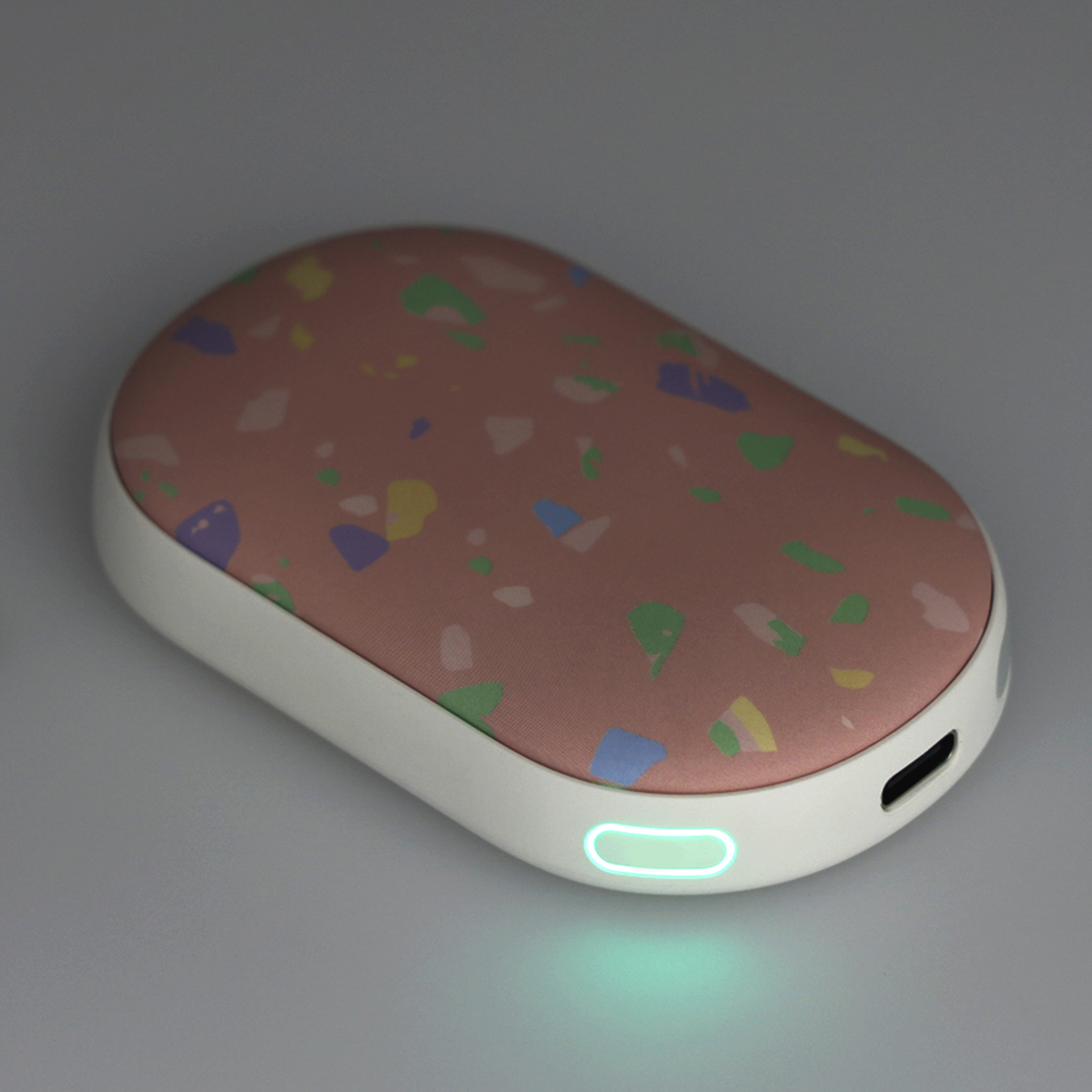 手のひらサイズの充電式カイロ。持ち運びやすく、手先を温めたり、ポケットに入れて使えます。外出時や移動中にも便利です