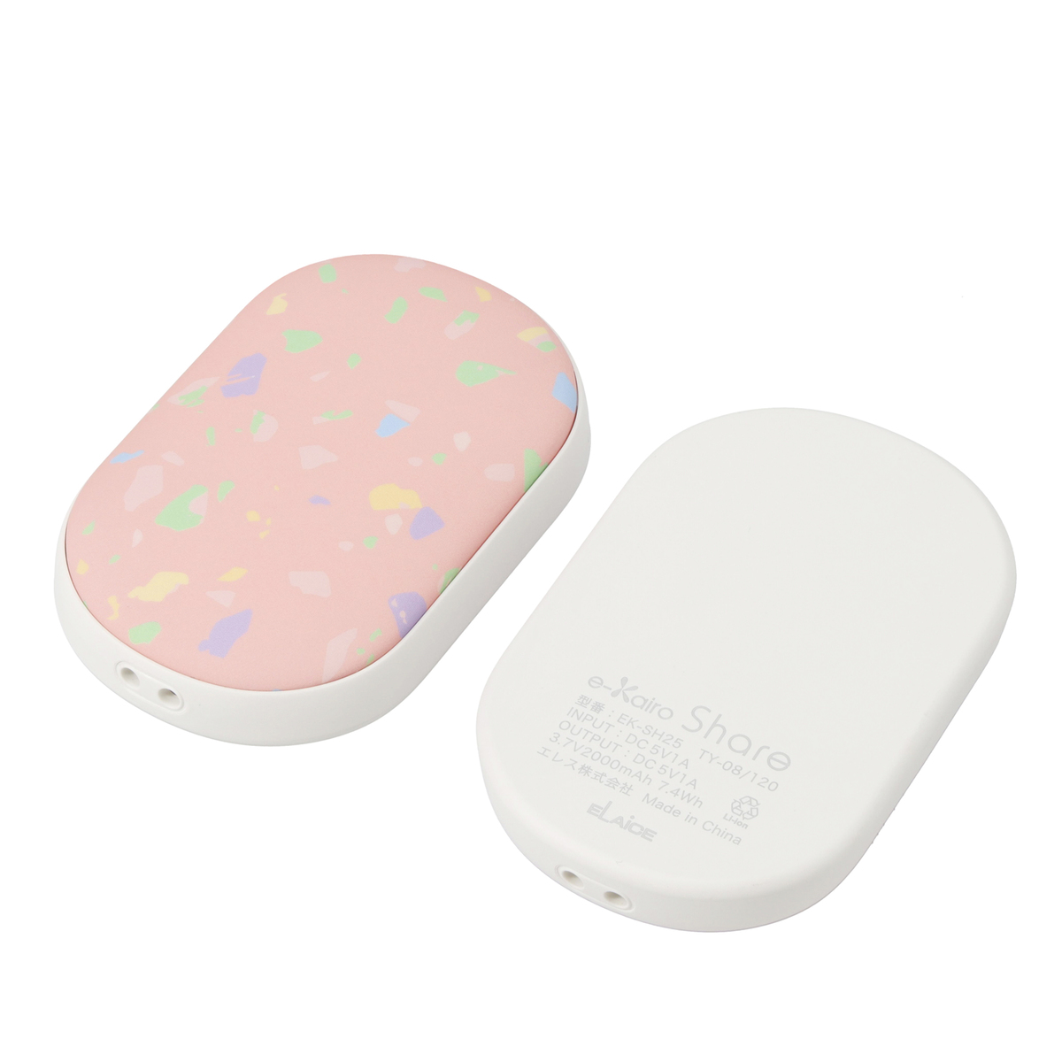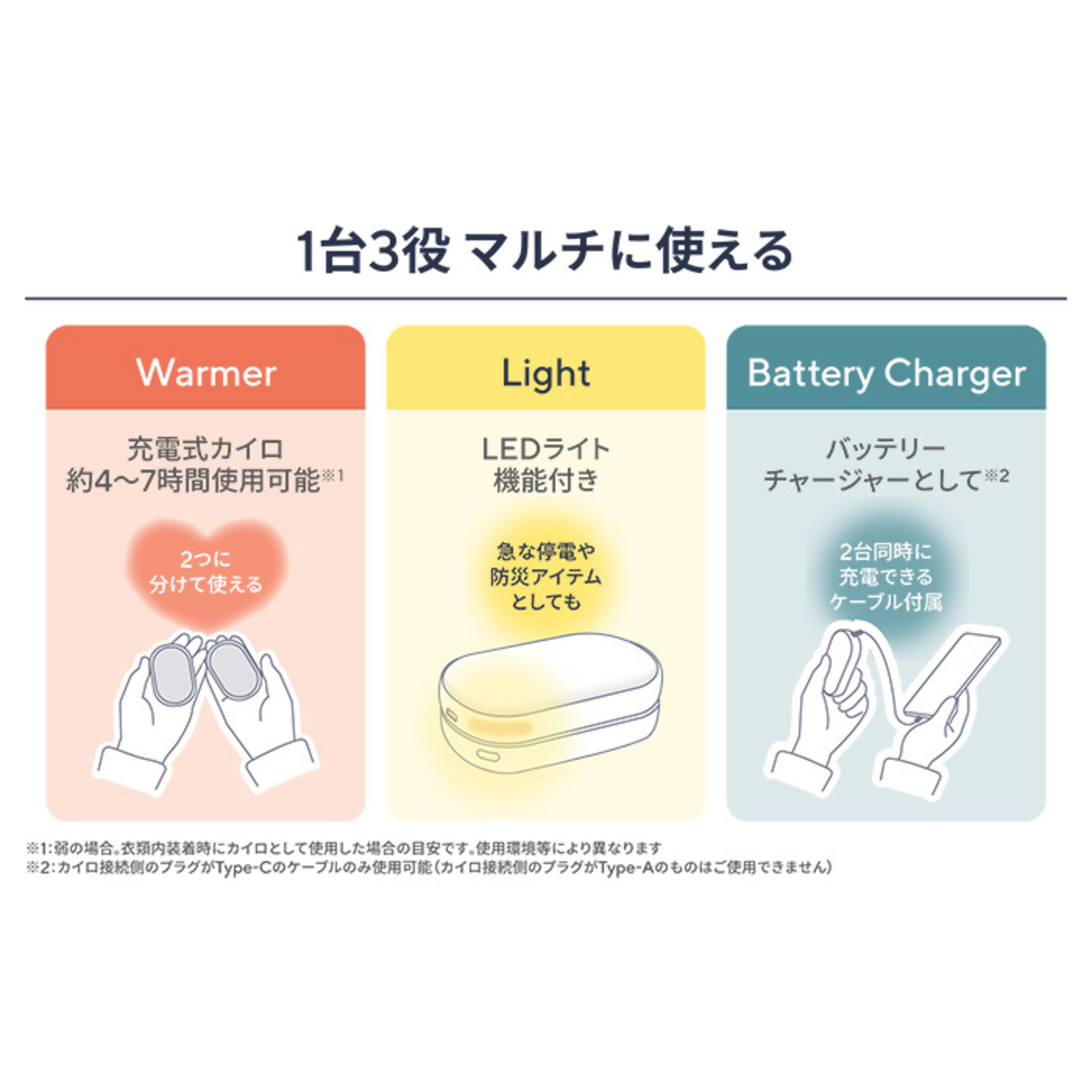 [商品内容] ・本体×2 ・充電用USBケーブル(Type A to C) ※ACアダプターは付属しません。出力5V2A以上のアダプターを使用してください [サイズ] 約幅7.7×奥行5.1×高さ3.2cm(2台あわせた状態) [重量] 約120g(2台あわせた状態) [材質] アルミ、ABS [充電時間] 2.5時間(2台同時に充電した場合) [使用時間(約)] 弱:4〜7時間 強:3.5〜6.5時間(衣服内装着時にカイロとして使用した場合の目安) ライトのみ:20時間 [その他詳細] 充電入力 :DC5V 2000mA(USB充電式)(2台同時に充電した場合) 充電出力 :DC5V 1000mA(1台あたり) [電池容量] 2000mAh 7.4Wh ■取り扱い説明を十分にご確認の上、ご使用下さい 【中国製】 [注意事項] ※子どもだけで使用させないでください ※カイロ機能は肌の弱い方、糖尿病など血行に障害がある方、身体の不自由な方、意思表示のできない方は使用しないでください ※低温やけどとは心地よく感じる程度の低い温度(40℃前後)でも、長時間肌の同じ箇所に触れることによって起きる可能性があるやけどです。低温やけどは皮膚の深部におよぶことがあり、赤い斑点や水ぶくれができる場合があります。低温やけどのなりやすさは個人差や使用方法によって異なります ※1時間に1回程度、肌の状態に異常がないか確認し、異常があった場合はすぐに使用を中止してください ※熱く感じる場合は、お手持ちのタオル等でくるむなどして調整してください ※就寝時は使用しないでください ※お子様がご使用になる場合は保護者の監視の下で使用してください ※下着など薄い衣類の上から使用する場合は低温やけどを起こす可能性が高いので、特に注意してください ※コタツ、ストーブ等の暖房器具の近くでは使用しないでください ※異臭や異音がする、本体や充電用ケーブルが異常に熱くなるなどの異変が生じた場合は、直ちに使用を中止し、電源を切ってください ※充電中の場合は充電用USBケーブルを、給電中の場合はUSB機器用の給電ケーブルを外してください。異常な状態のまま使用すると火災、感電の原因になります。異常な状態がなくなるのを確認した後、エレス株式会社までご連絡ください ※本体、Type-Cポート、Type-Cプラグ、Type-Aプラグにピンなどの金属を差し込まないでください。発熱、破裂、発火、火傷の原因になります ※お客様自身による修理改造はしないでください。火災、感電の原因になります。内部の点検、調整は販売店またはエレス株式会社にご依頼ください ※火の中に入れたり、電子レンジやオーブンなどで加熱したりしないでください。火災、破裂、発火、やけどの原因になります ※本体を水につけたり、水や汗をかけないでください。万一かかった場合は使用を中止してください。また、濡れた手で触らないでください。発火、感電、故障、破損の原因になります ※次の様な場所での使用や保管はしないでください。火災、感電の原因になります ・ストーブなど暖房機器や火気の近く ・直射日光の強い場所、炎天下の車内など高温になる場所 ・有機溶剤(シンナー、塗料など)、ガスを使用している近く ・加湿器や、洗濯機の近く、風呂場、台所などの水場や高温になる場所 ・乳幼児の手が届くところ ・ペットが接触する可能性がある場所 ※本製品の使用により肌などに異常を感じた場合は、直ちに使用を中止し医師に相談してください。やけど、ケガの原因になります ※落したり、強い衝撃を与えたりしないでください。ショートして火災になったり、感電の原因になります ※故障や破損した状態で使用しないでください。思わぬ事故の原因になります ※USB-ACアダプターは必ずPSE認証を受けているものを使用してください。市販品には粗悪な製品もありますので注意してください。PSE認証を受けていない製品を使用した場合、保証規定の対象外になります ※各ケーブルを抜き差ししてください。またケーブルを加工したり、無理に曲げたりねじったり、引っ張ったりしないでください。ケガ、事故、故障の原因になります ※濡れた手でType-Cポートや充電用USBケーブルを触らないでください。感電、故障の原因になります ※子供だけで使用させないでください。感電、ケガ、思わぬ事故の原因になります ※カイロ機能は肌の弱い方、糖尿病など結構に障害がある方、身体の不自由な方、意思表示のできない方は使用しないでください。ヤケドの原因になります ※寝具や燃えやすいものの近くで充電しないでください。思わぬ事故の原因になります