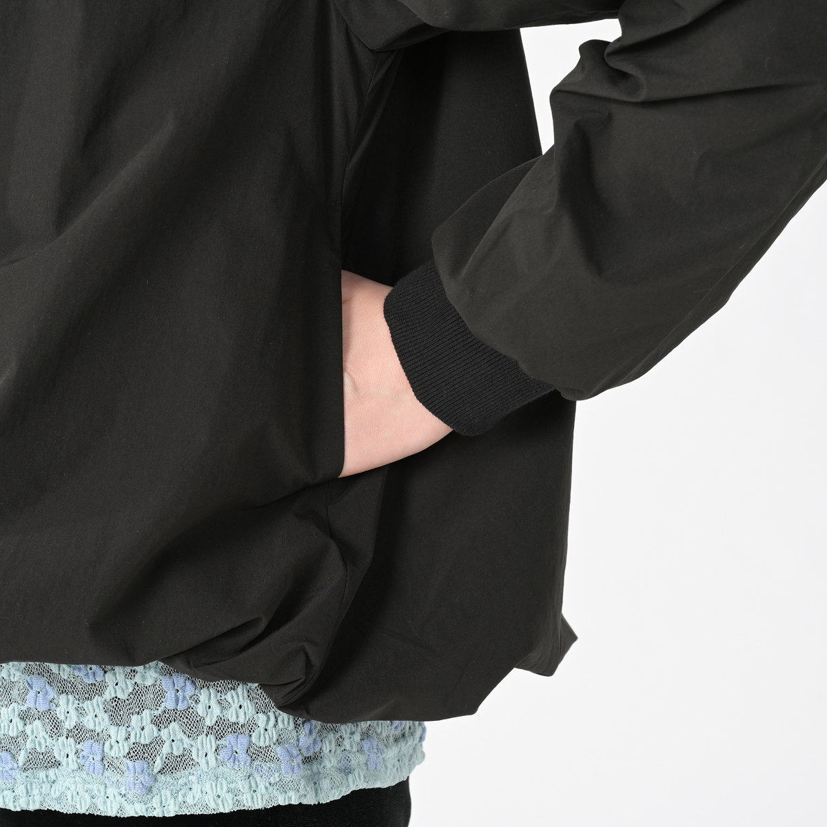 後身頃には花柄のラッセルレースを使用することで、クラス感をプラス。両脇には便利なシームポケット付き。軽やかな着心地と洗練されたPixie Heartらしいデザインで、季節の変わりめにおすすめの1枚です