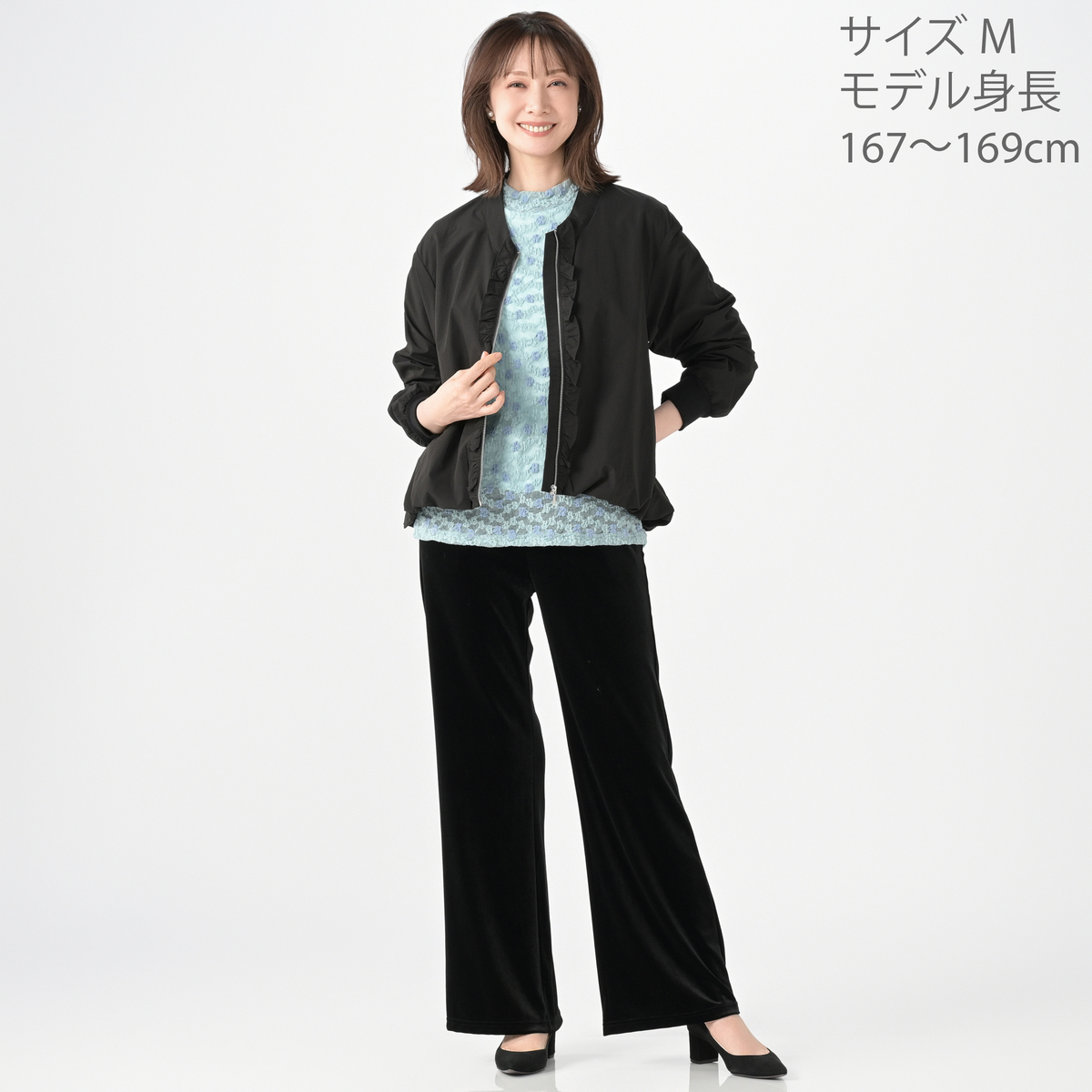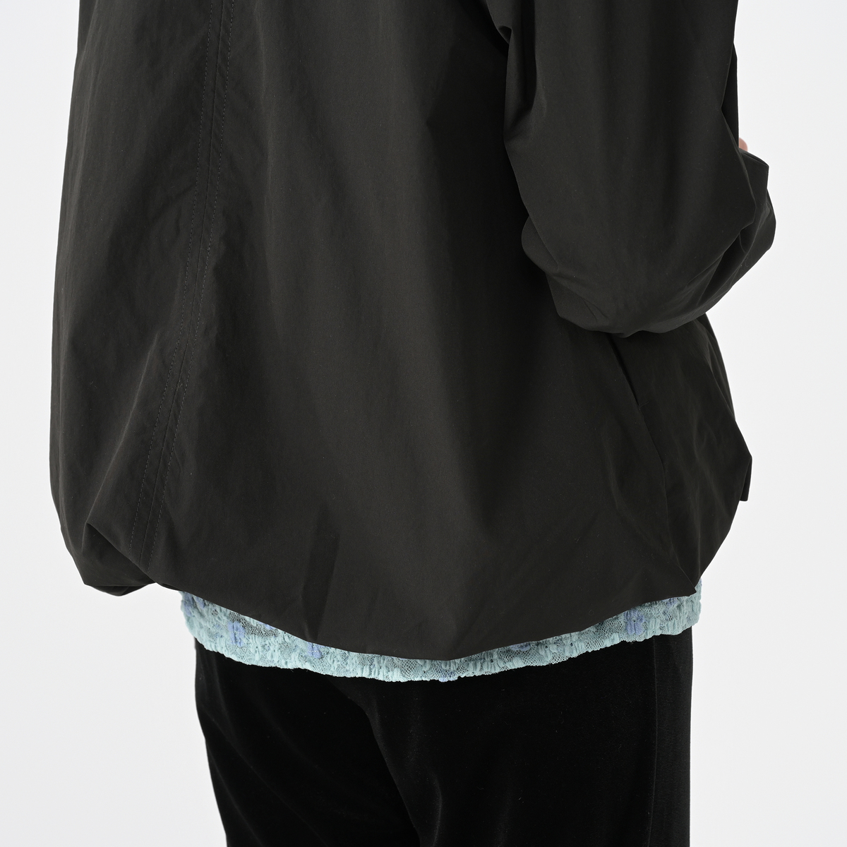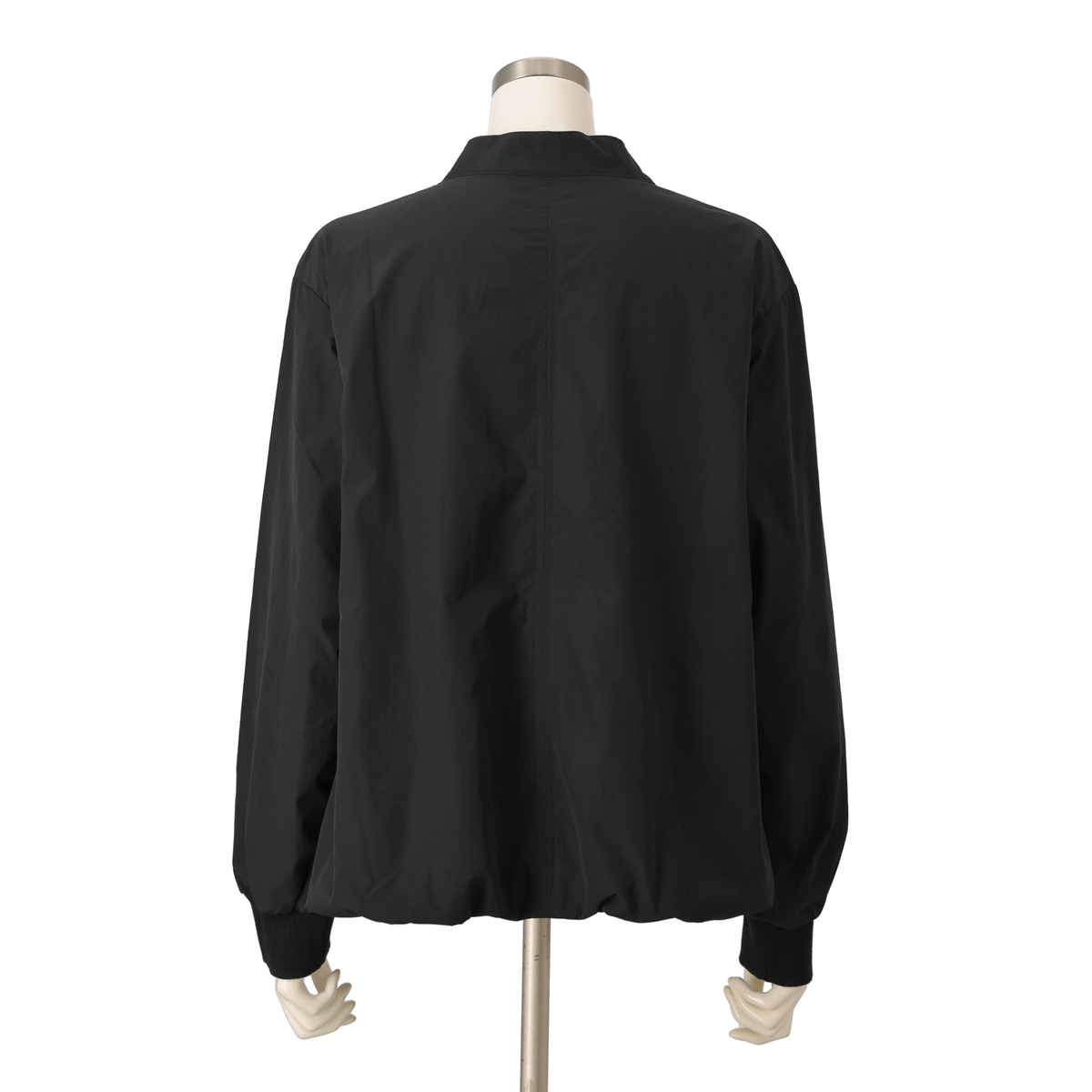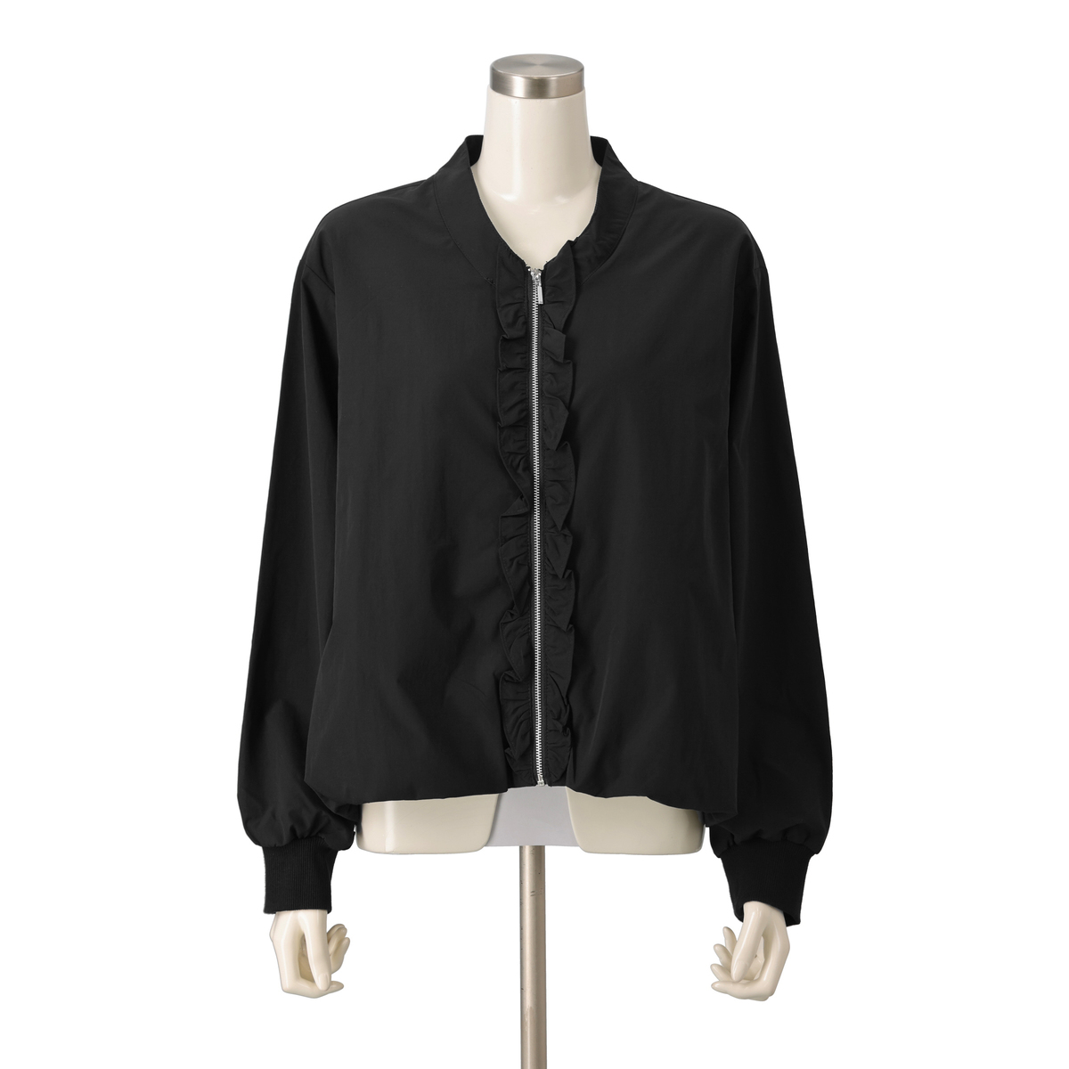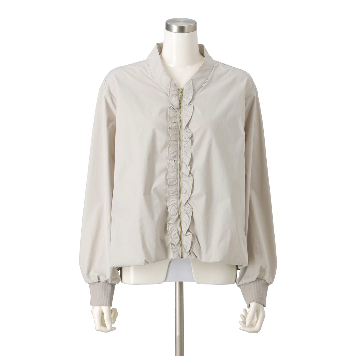 裾と袖口にふんわりとしたギャザーを施し、身頃は前後差を付けた丈の立体的なシルエット。襟ぐりはVネックのノーカラーに。フロントには金属ファスナーと細かく寄せたギャザーフリルが施された、上品でフェミニンな印象です